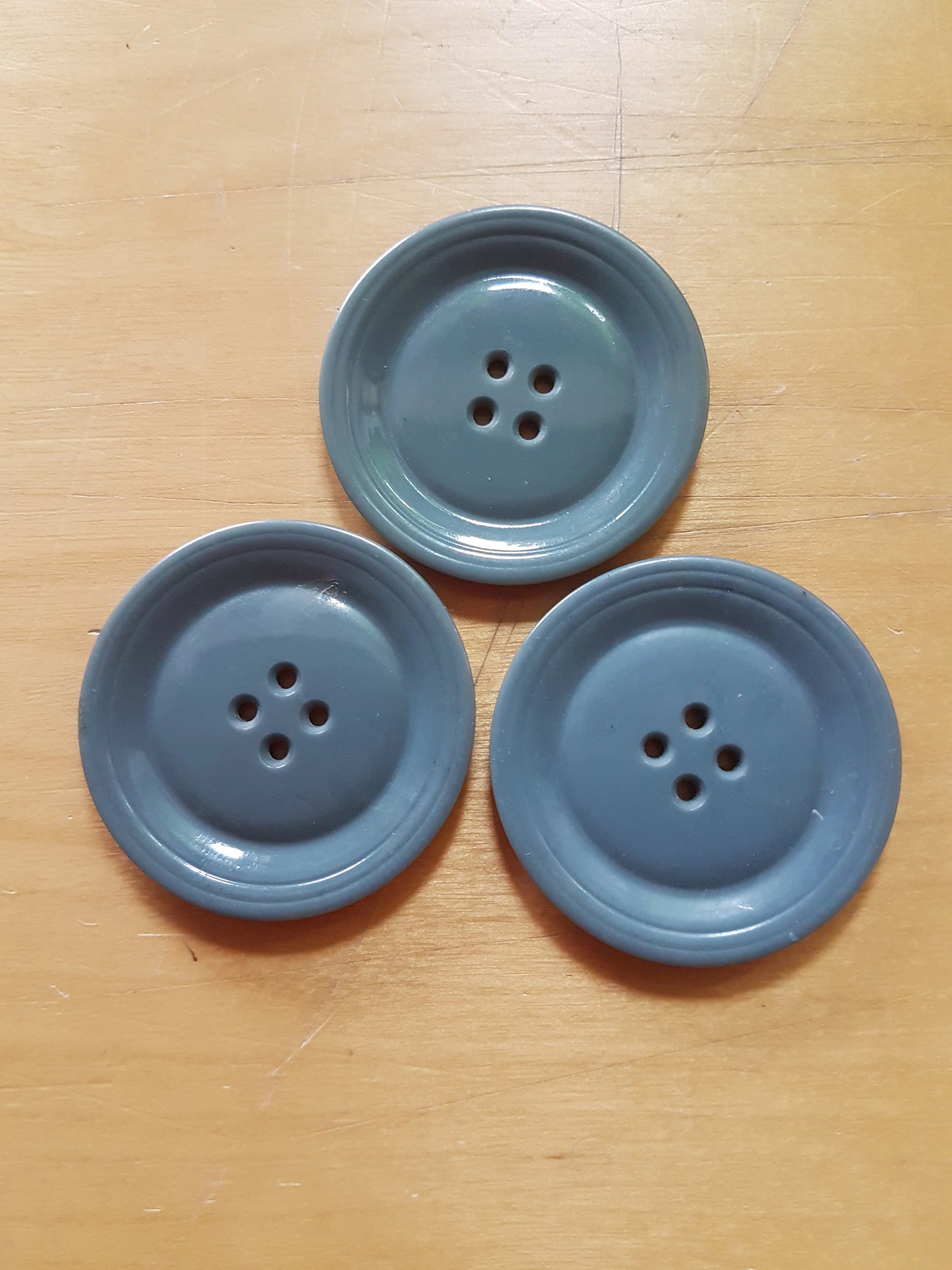 Up for sale here are 3 large grey vintage plastic coat buttons. They measure approx 4 cm.