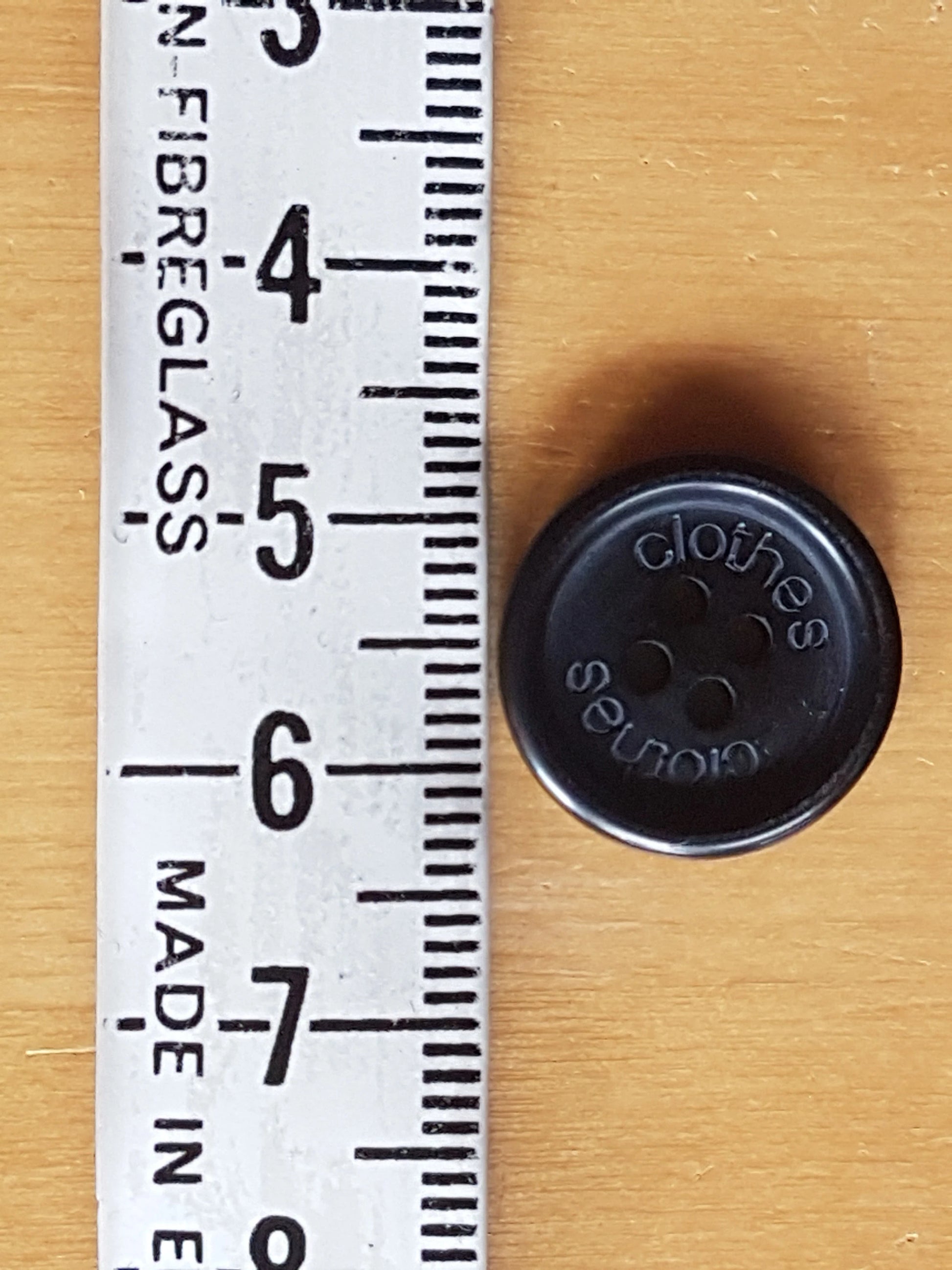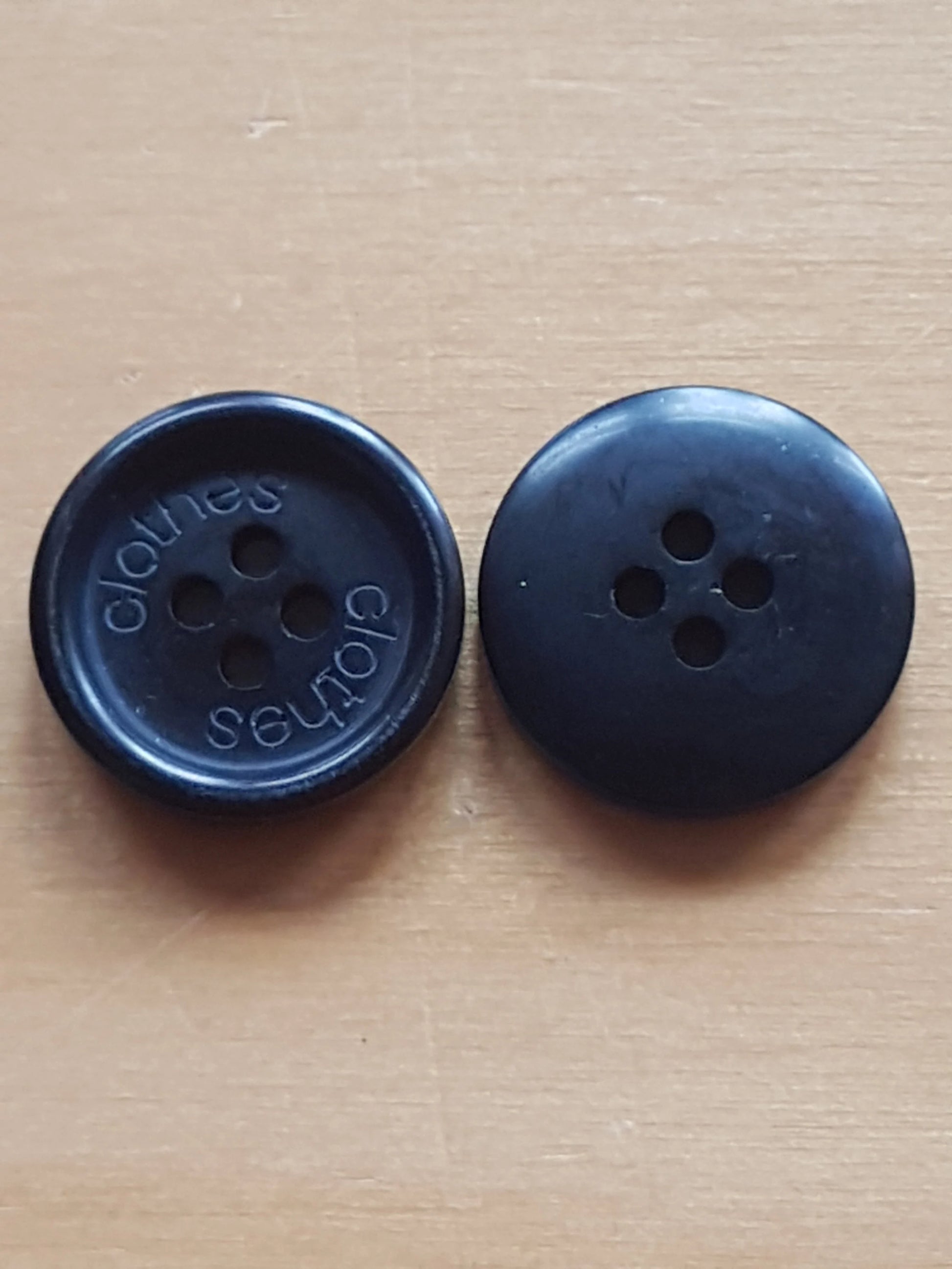 Up for sale here are 7 small round plastic black buttons measuring 1.5cm. They have 'clothes' written on them.