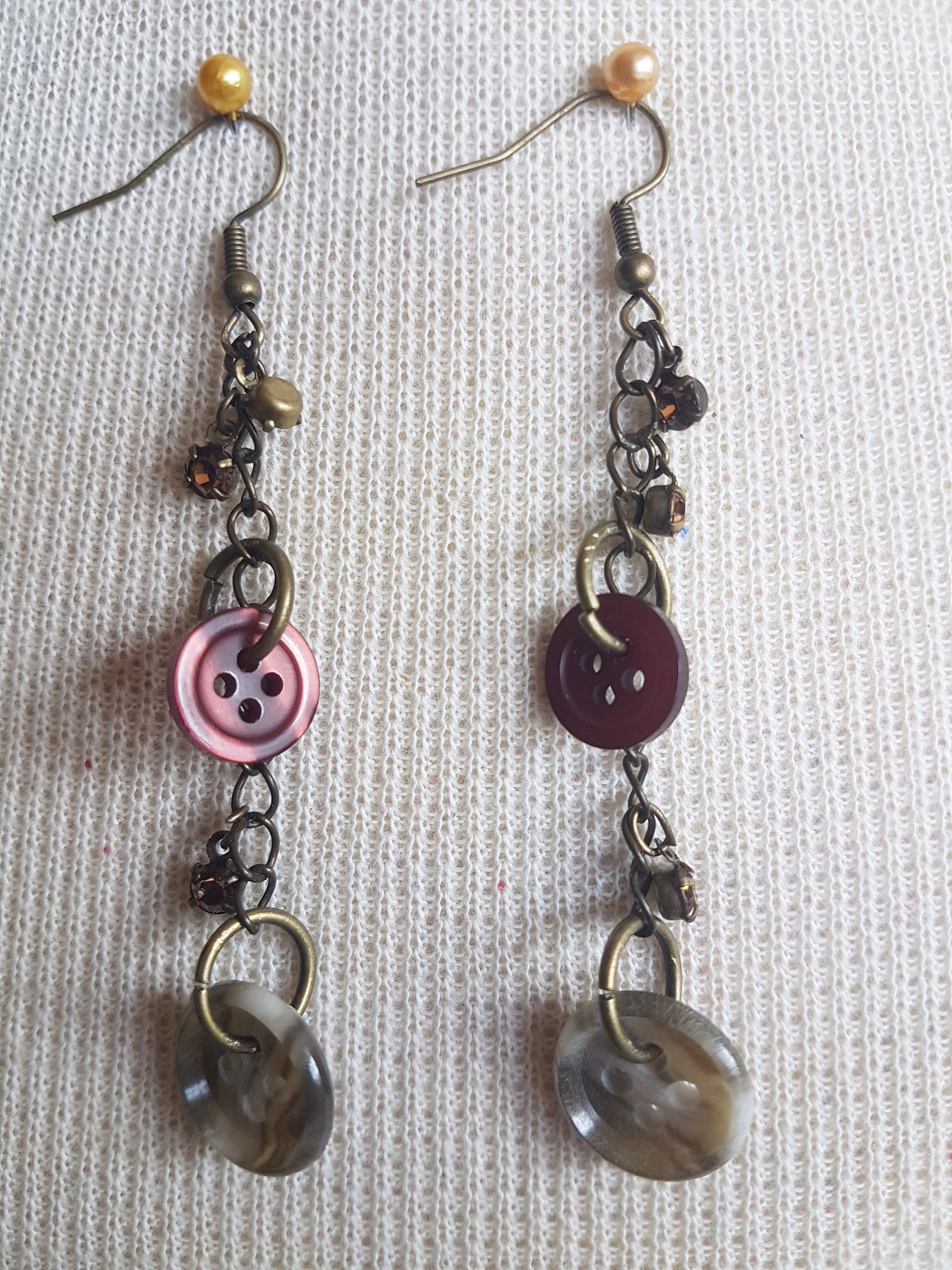 This pair has a length approx 3 inches and comprise an antique bronze effect earring with chain parts and variegated and red vintage buttons.