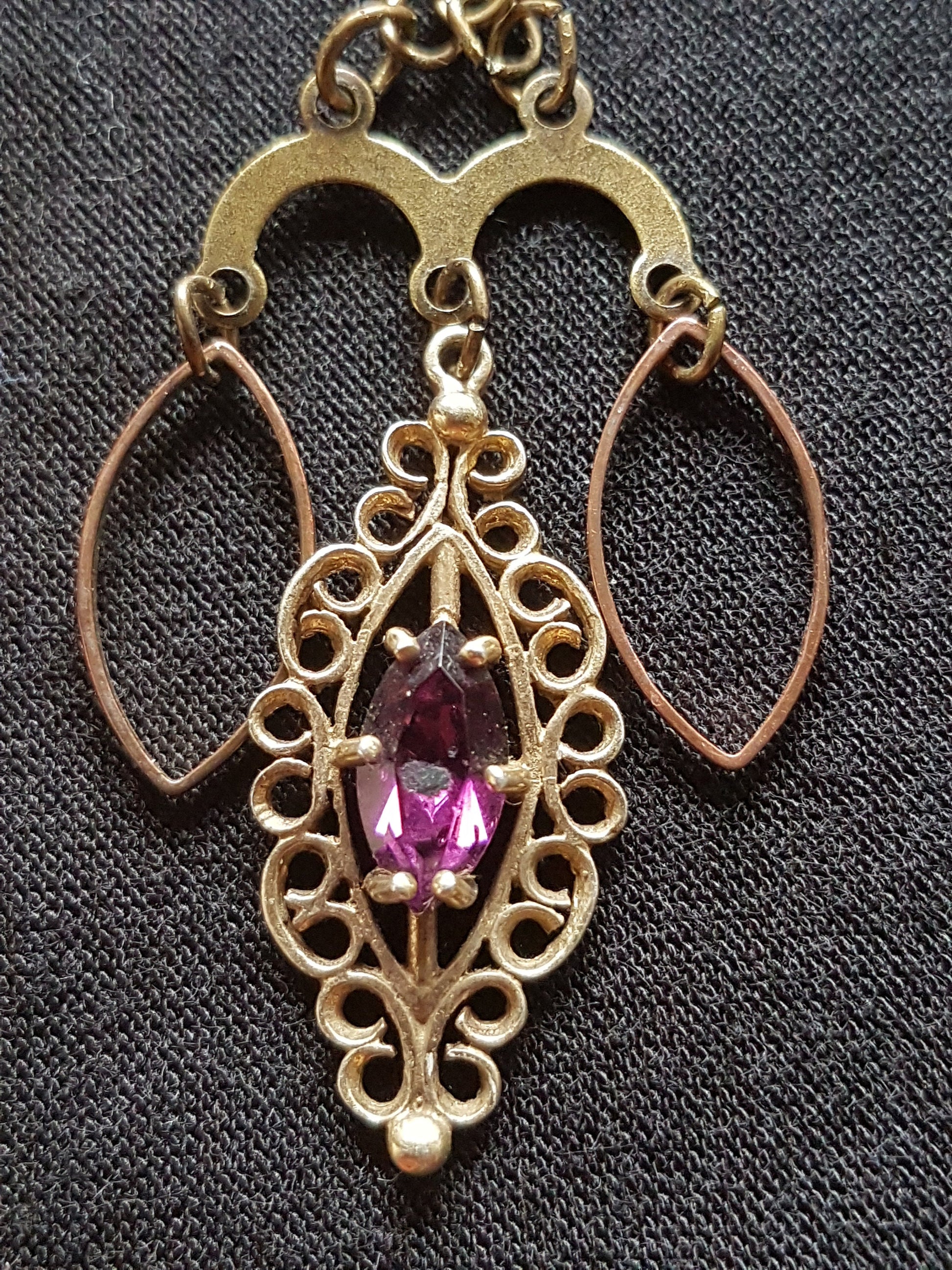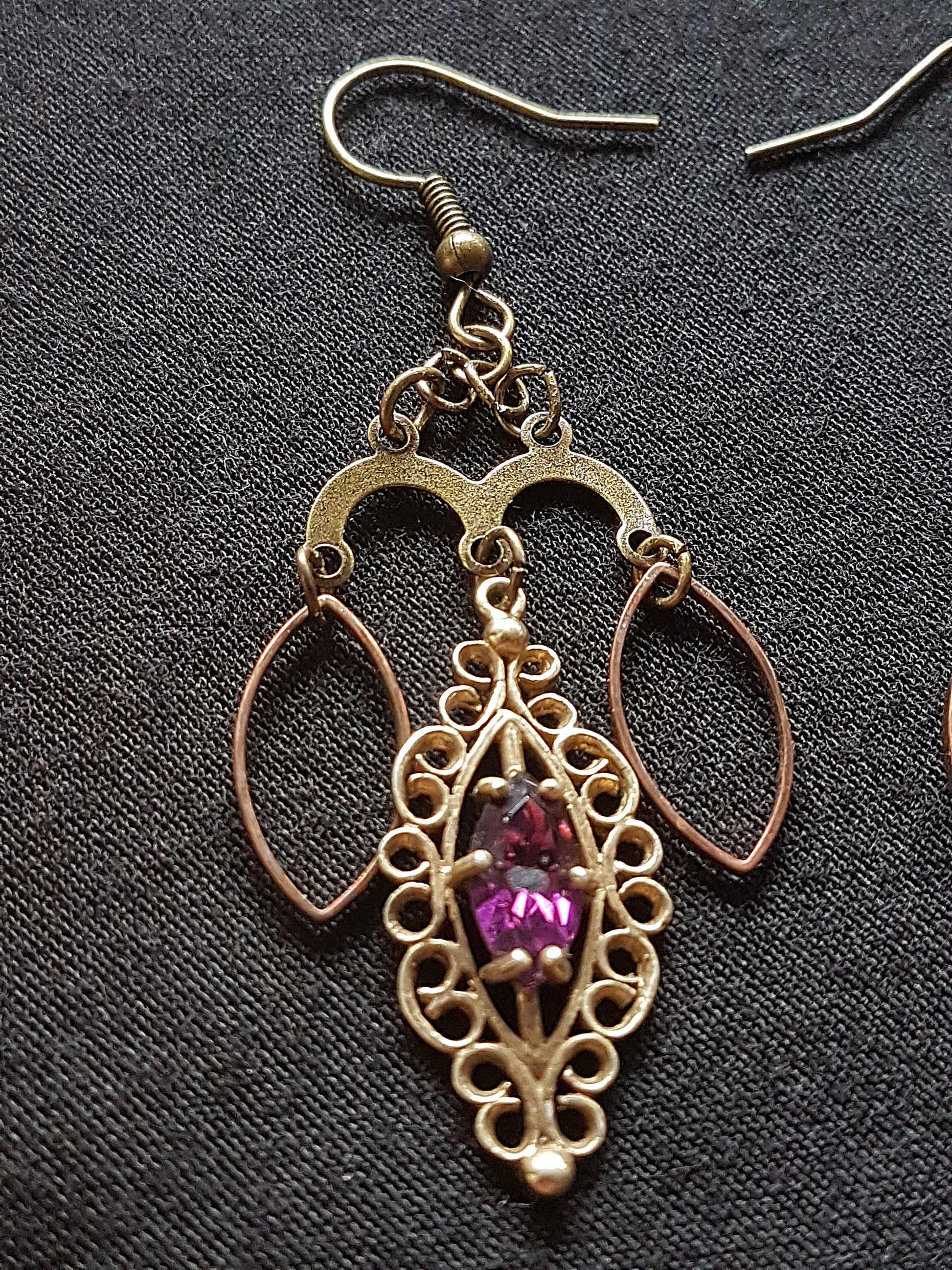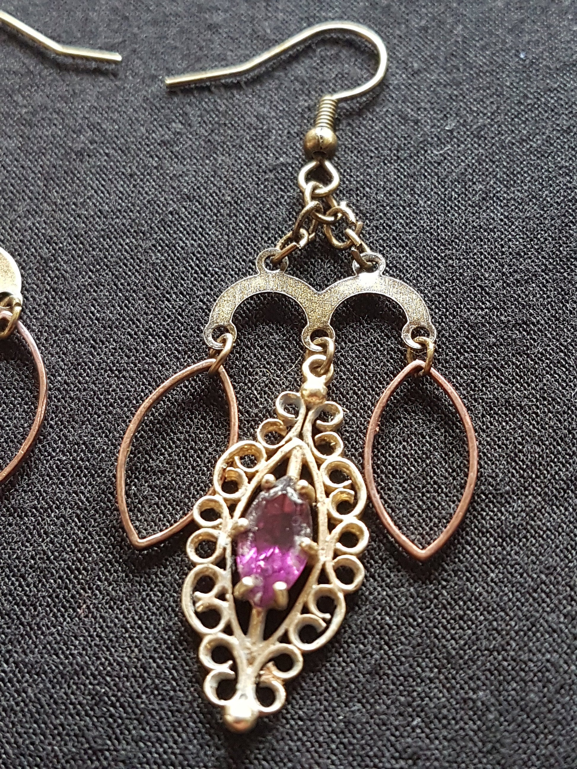This pair have a length approx 2.5 inches and comprise an antique bronze effect earring with leaf shaped charms and a gold effect filigree centre piece with a purple amethyst look stone in the middle.
