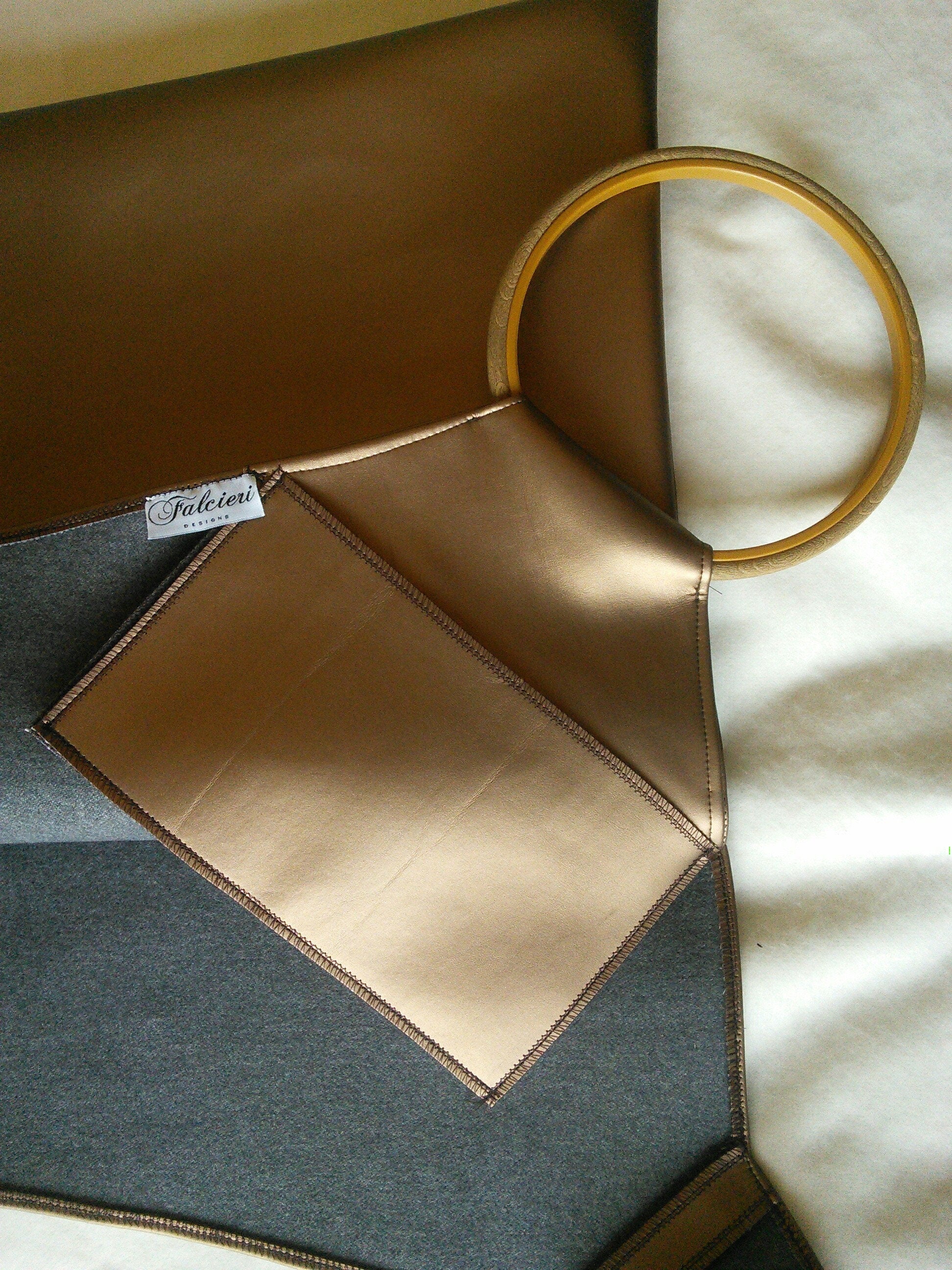 It is made from bronze faux leather with visible overlocked edges on some seams and it is unlined. It also has a deep inside pocket, a single handle in wood effect plastic with a brown insert and the bag fastens with a metal magnetic clasp on a matching strap with a fancy pink peony flower as decoration.
