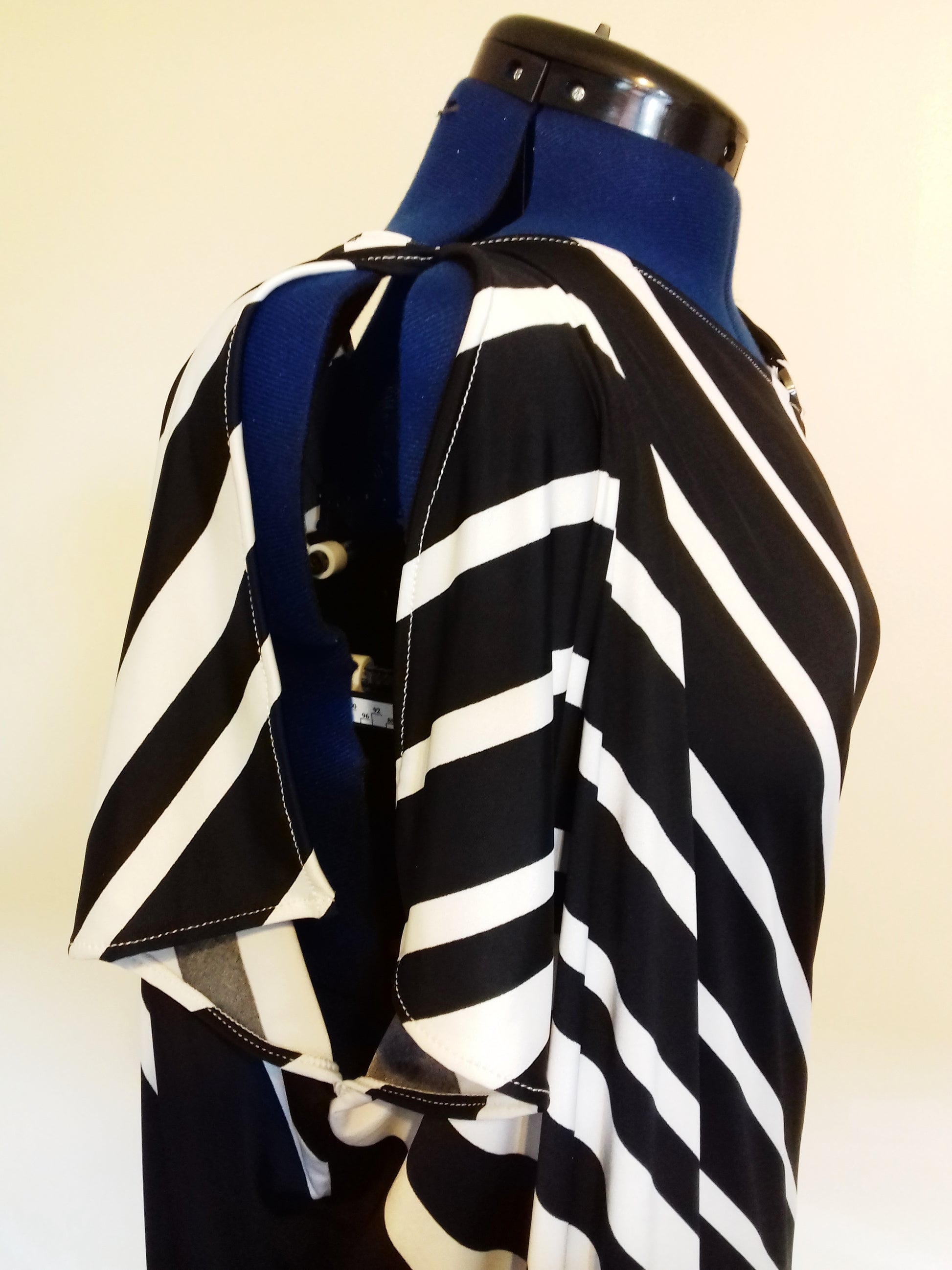 This bold black and white diagonal striped handmade drape dress is made from soft stretch poly/viscose blend fabric so it feels great and hangs really well.