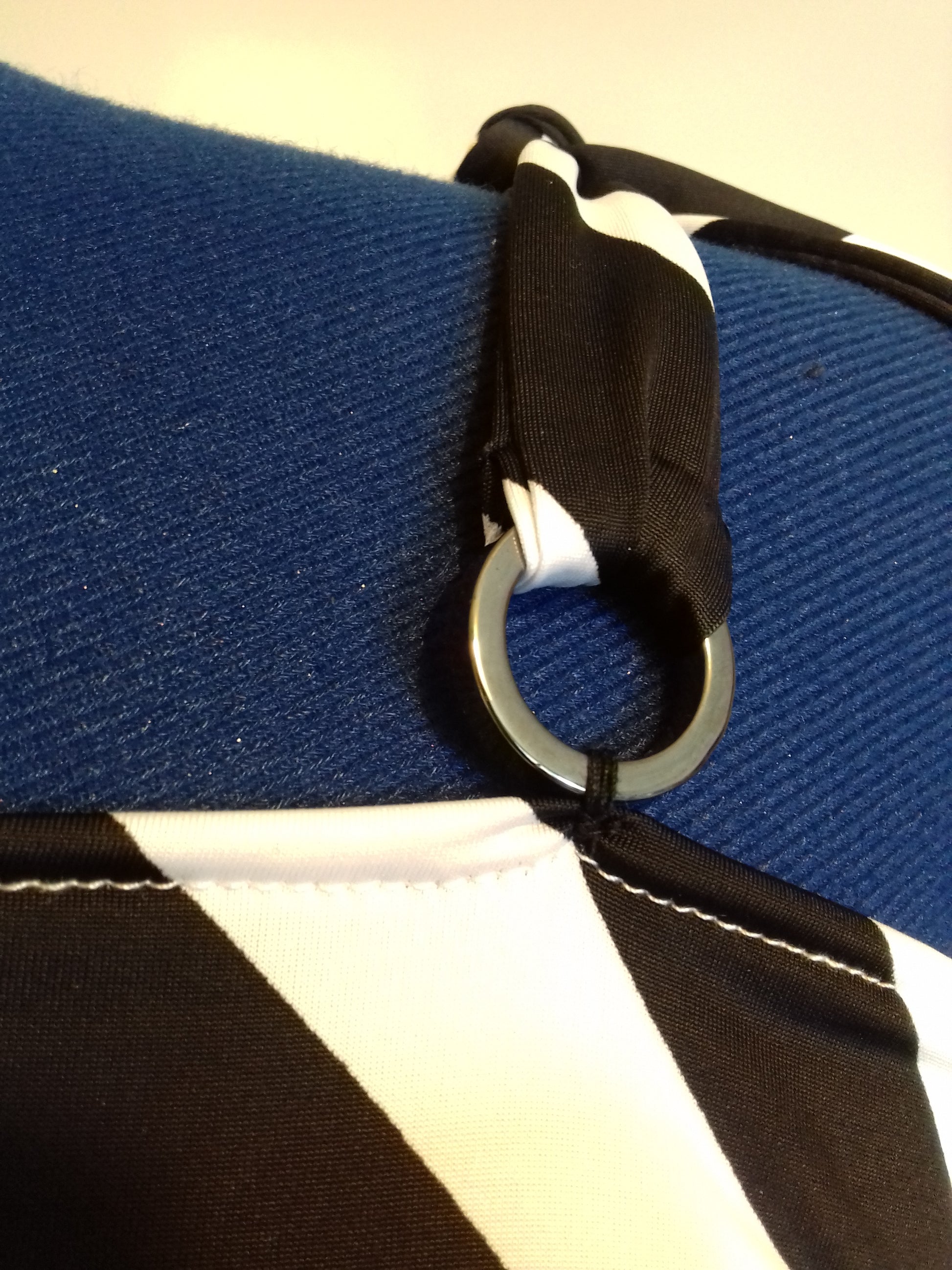 It has a straight one shoulder neckline, which is finished on one side with hematite donut beads and ties that you can adjust as required. The other side has a split shoulder detail and hangs in folds on that side down the length of the dress.