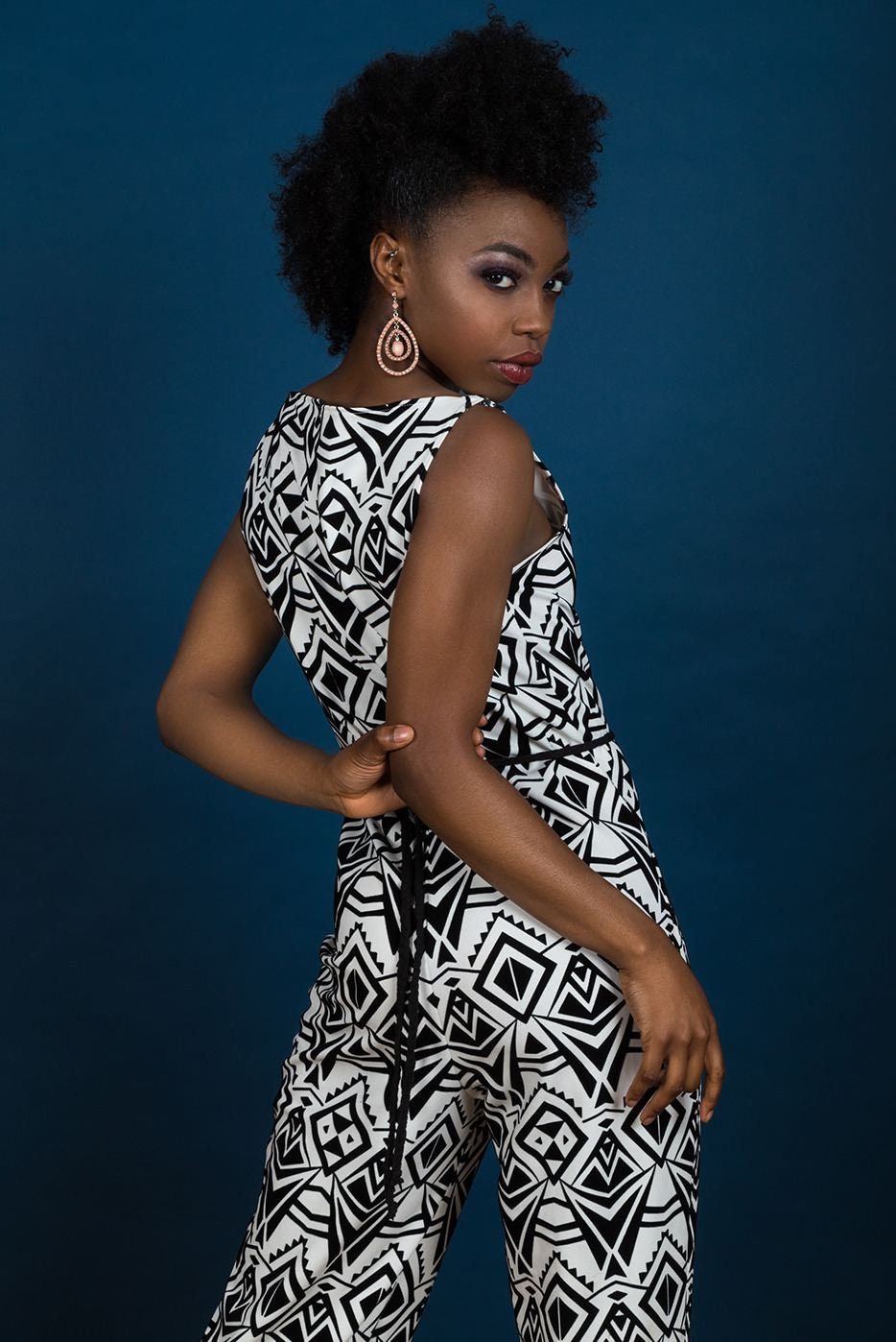 This jumpsuit is made from heavyweight stretch fabric with a black prominent pattern (rather like flocked wallpaper).