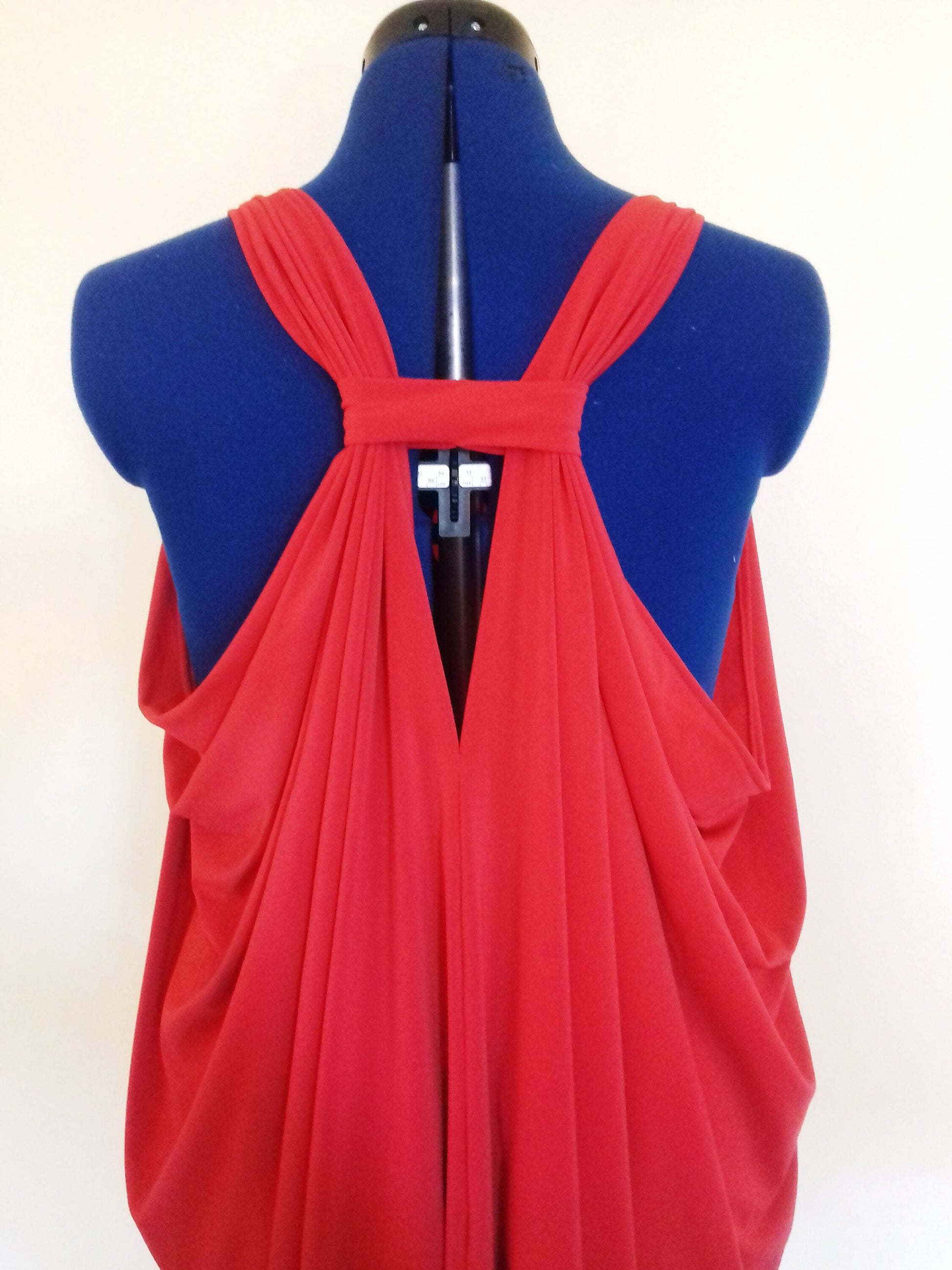 This gorgeous handmade red backless drape dress is beautifully elegant. It has a slight scoop front neckline and an unusual design on the back with a drop back and deep drape on the underarms.