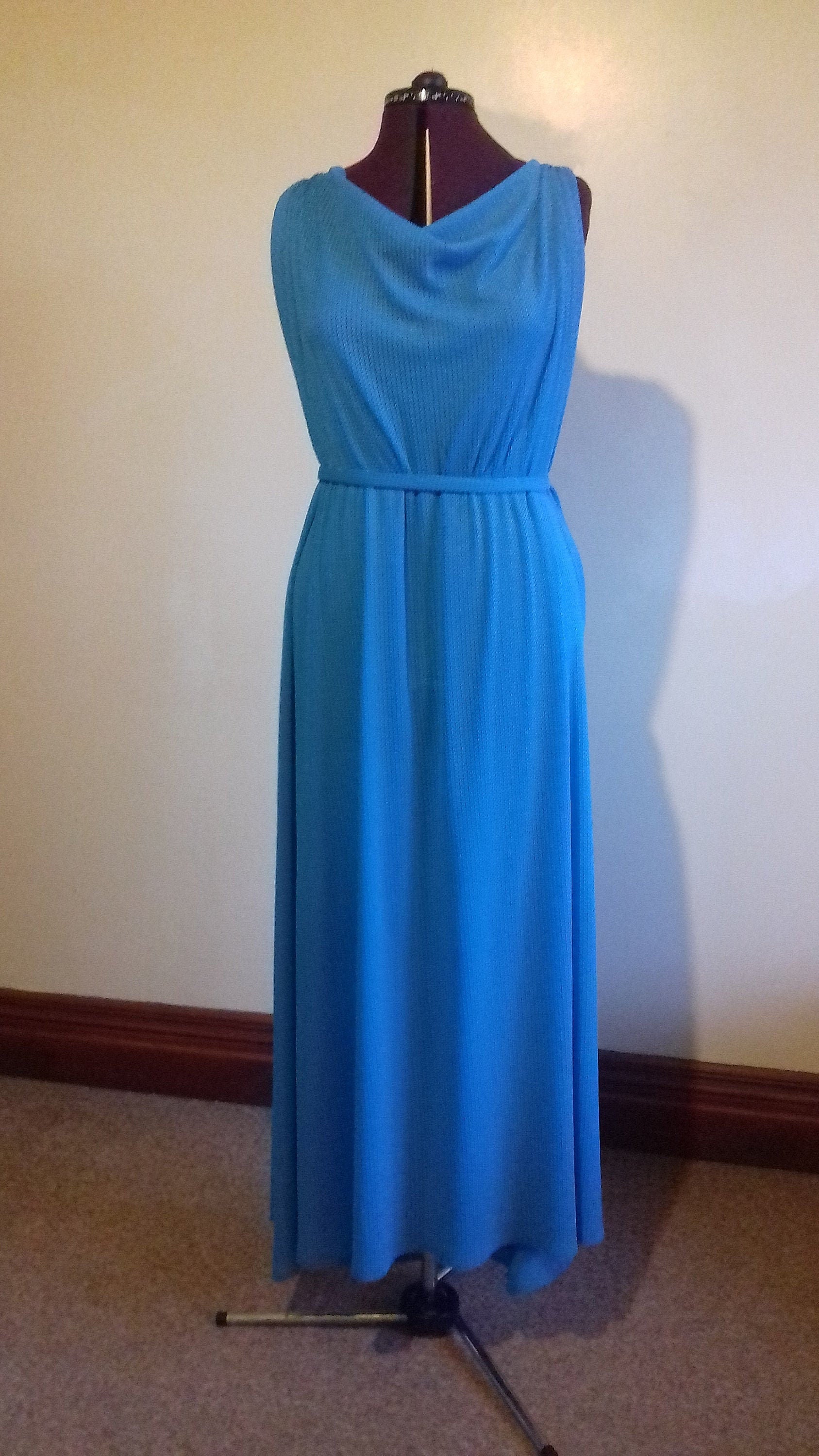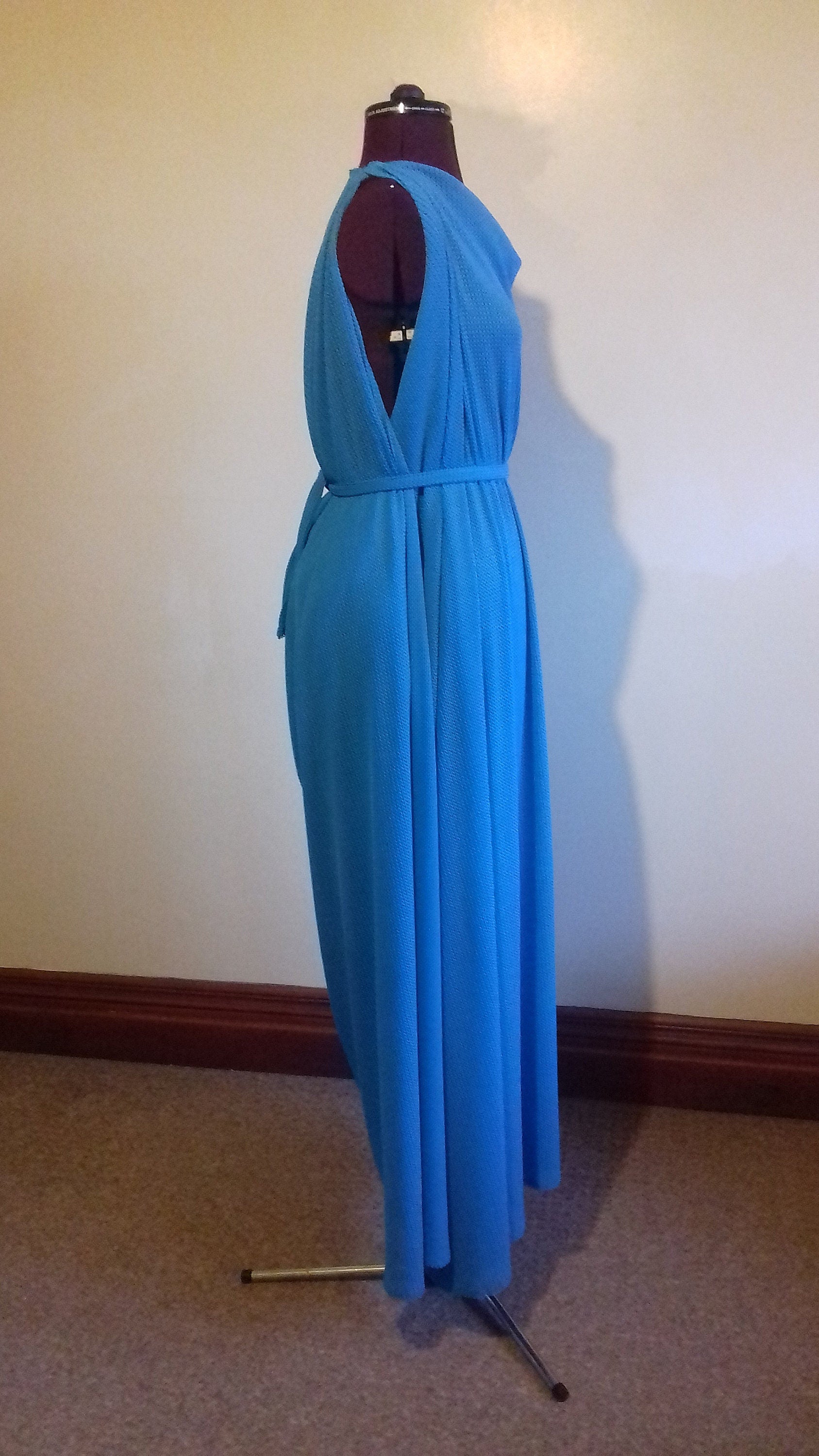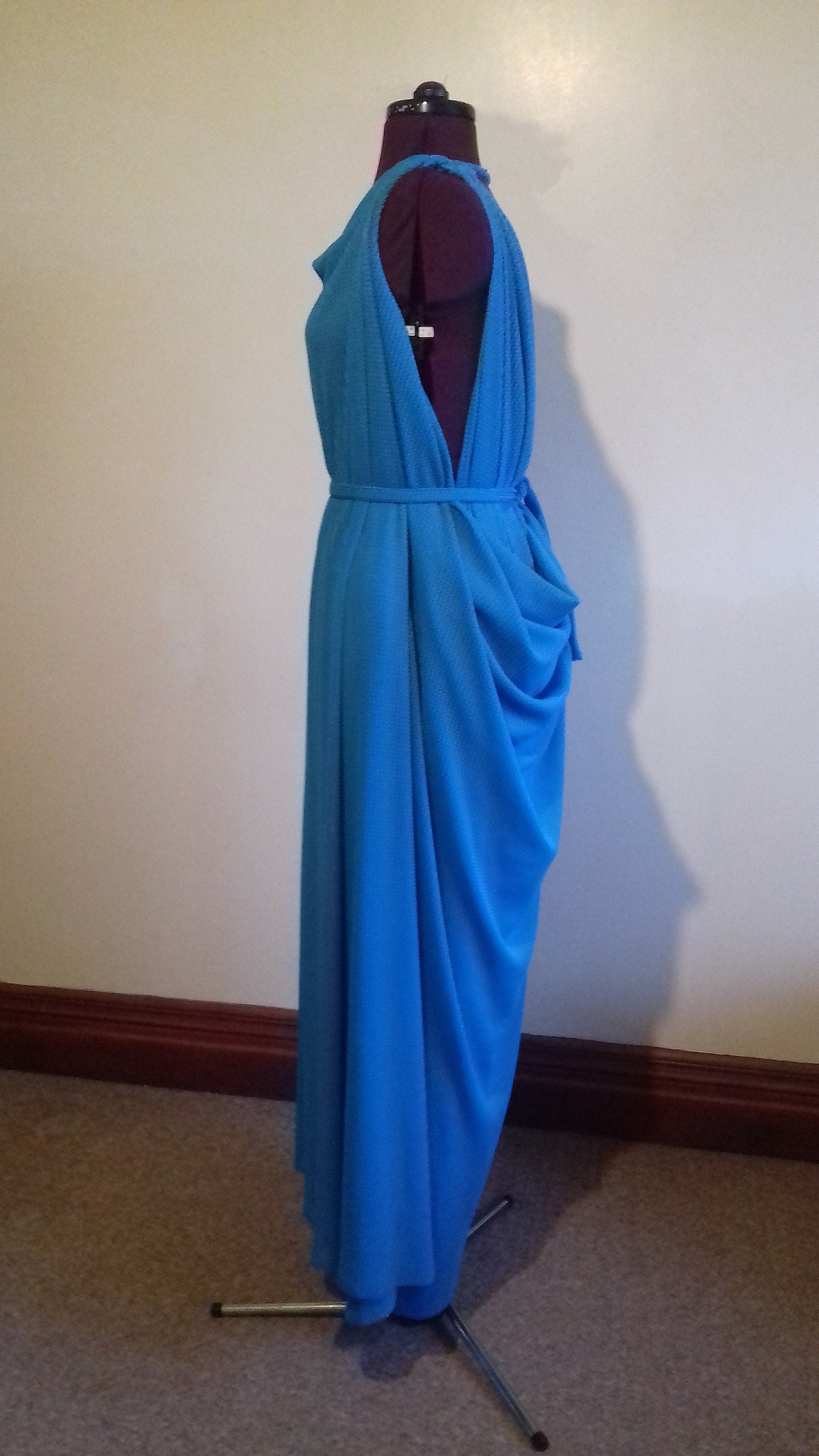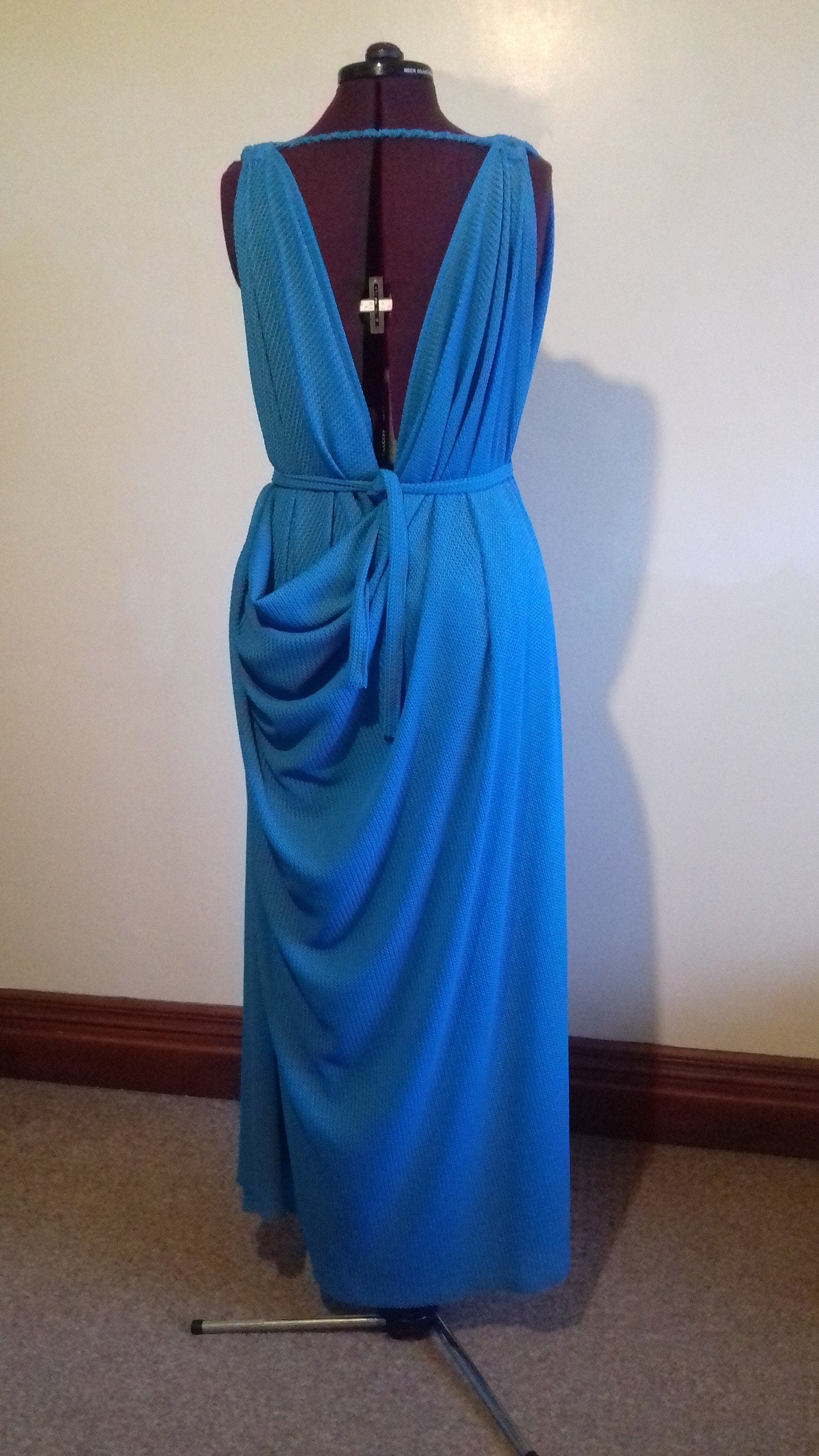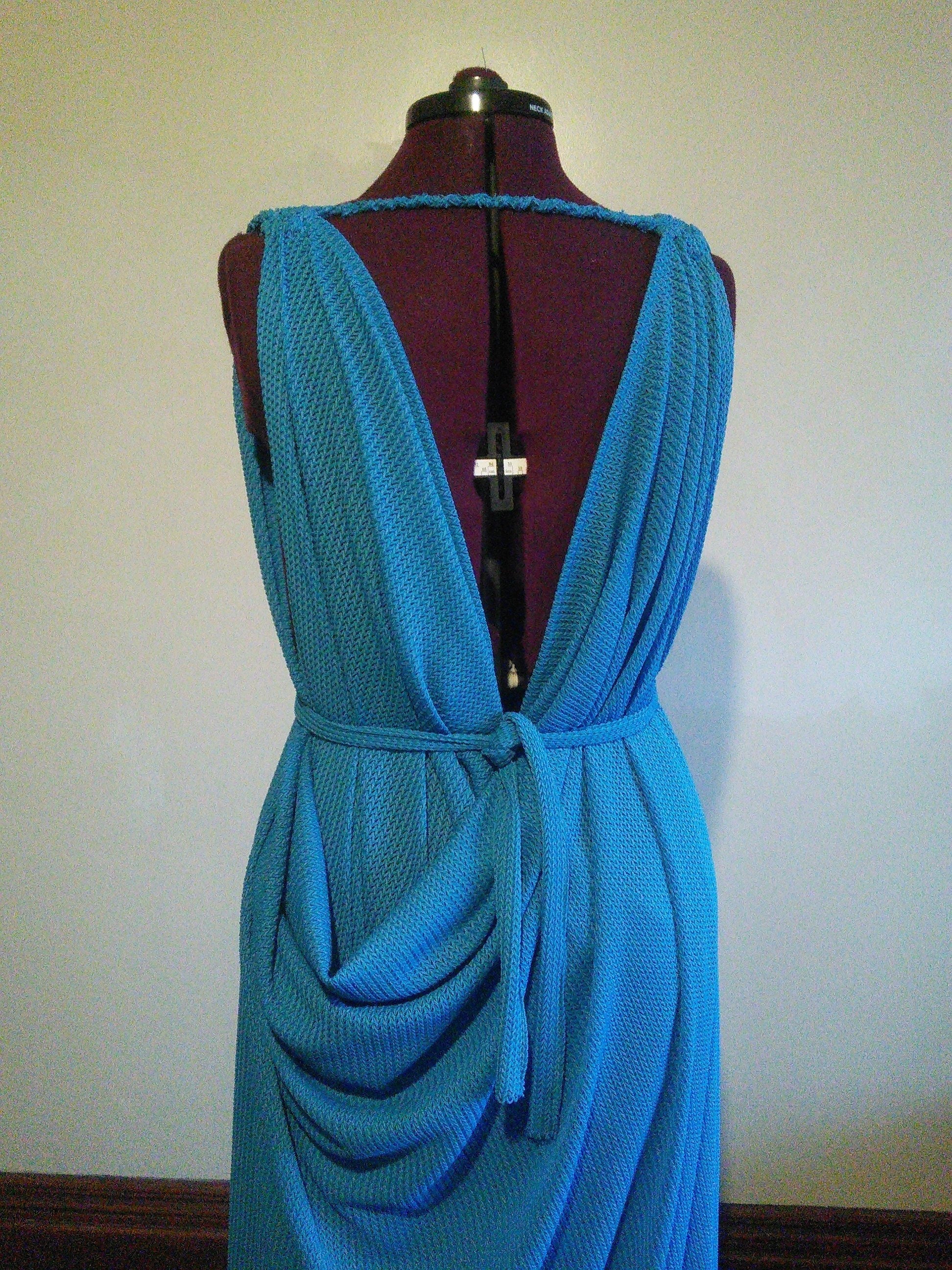 This gorgeous handmade blue backless drape dress is ridiculously elegant. It is made with a beautiful weaved fabric that has a heavy drape but hangs in perfect folds. With a high cowl neckline and a simple matching waist band which sits on your natural waistline, this beautiful one off dress is perfect dressed simply or with as much jewellery as you dare.