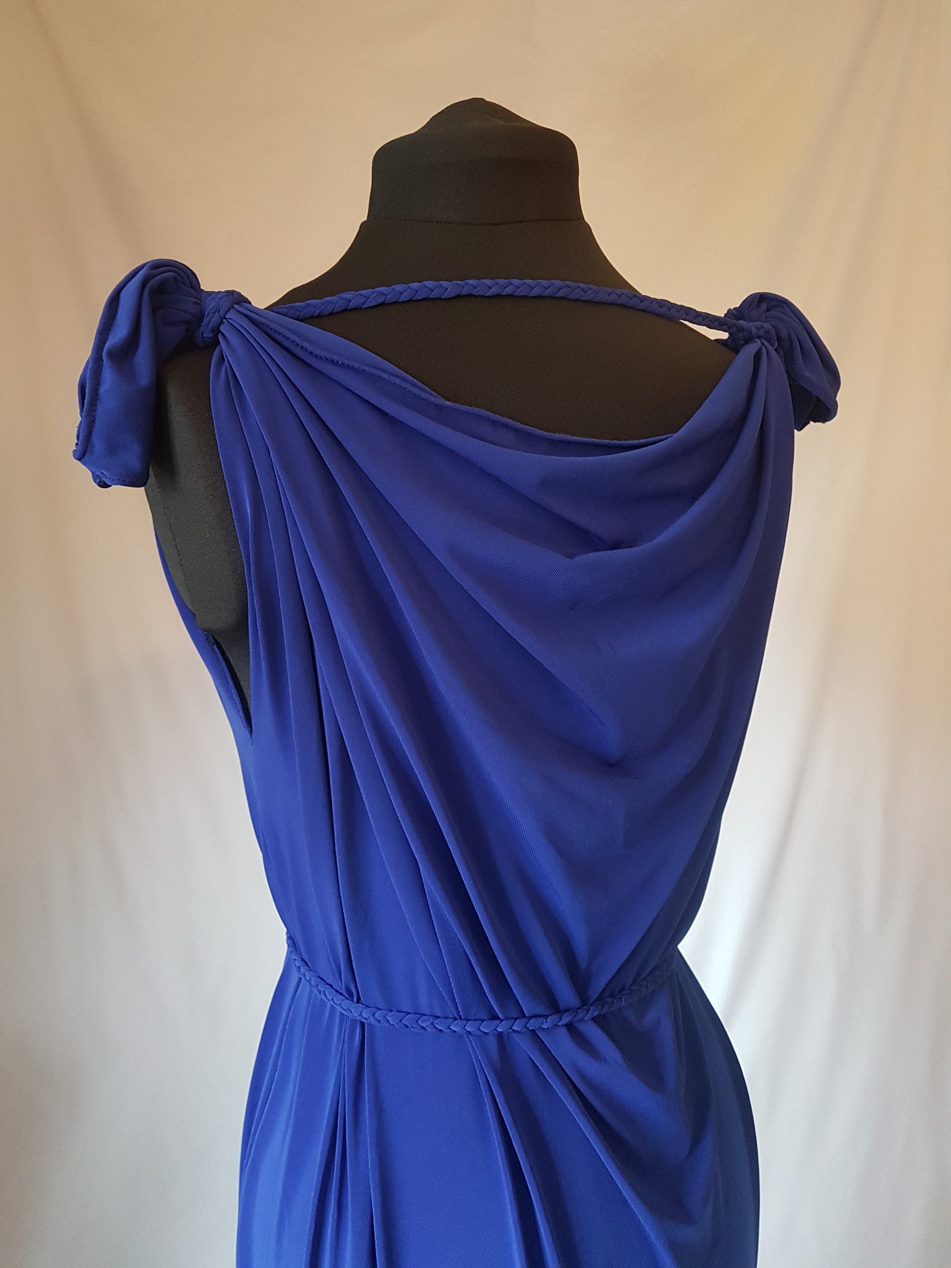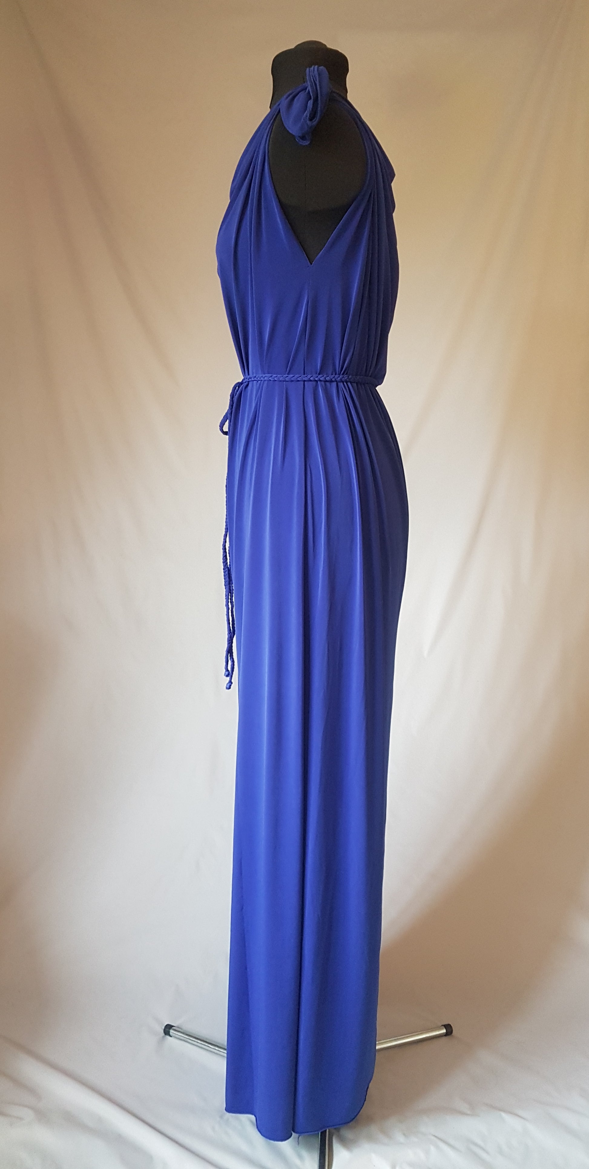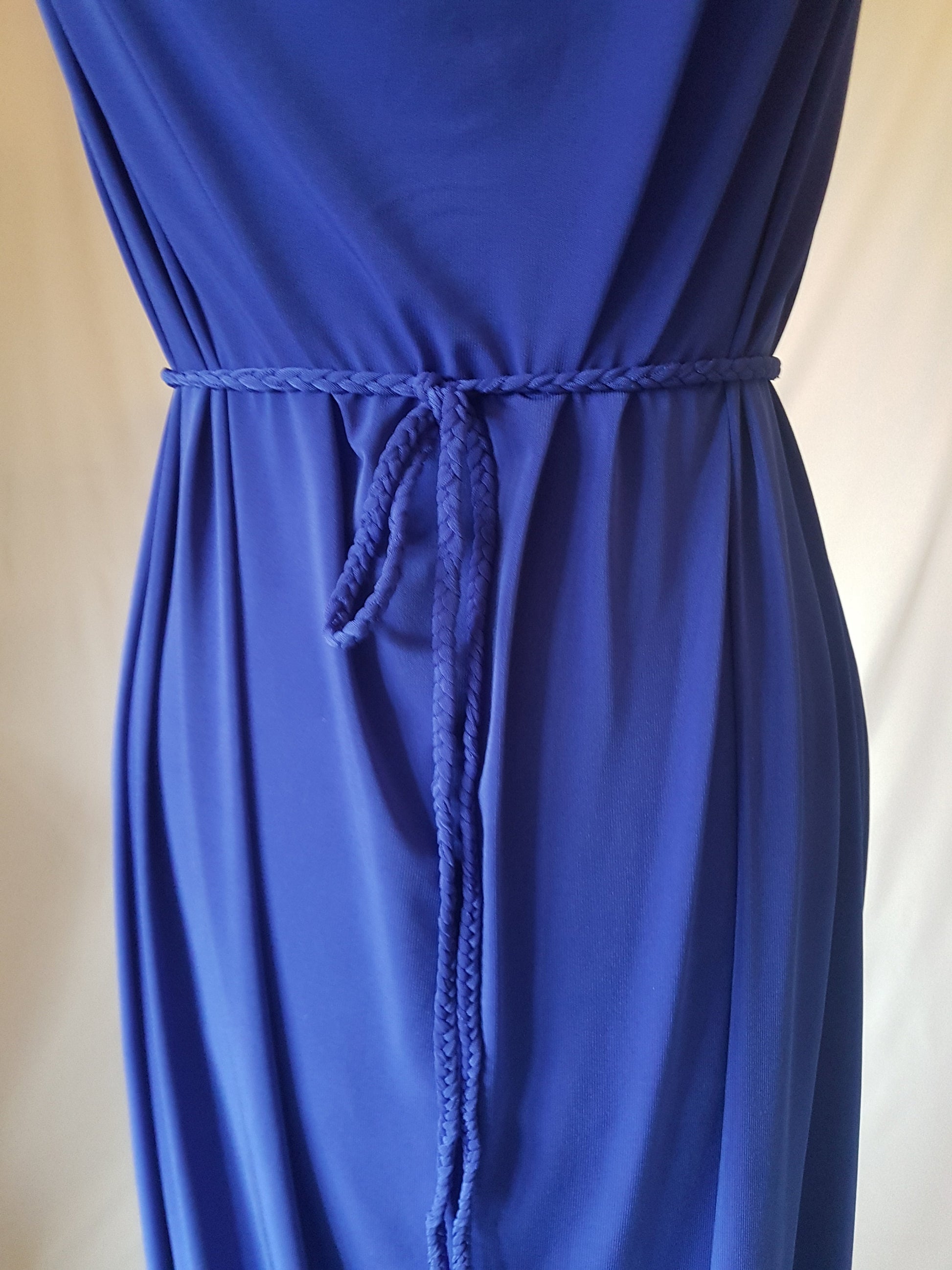This dress has a high scooped neckline at the front, and back. It has detailing on the shoulder line and a braided matching belt fastens around the waist and a split hem which can be altered to whatever length you require.
