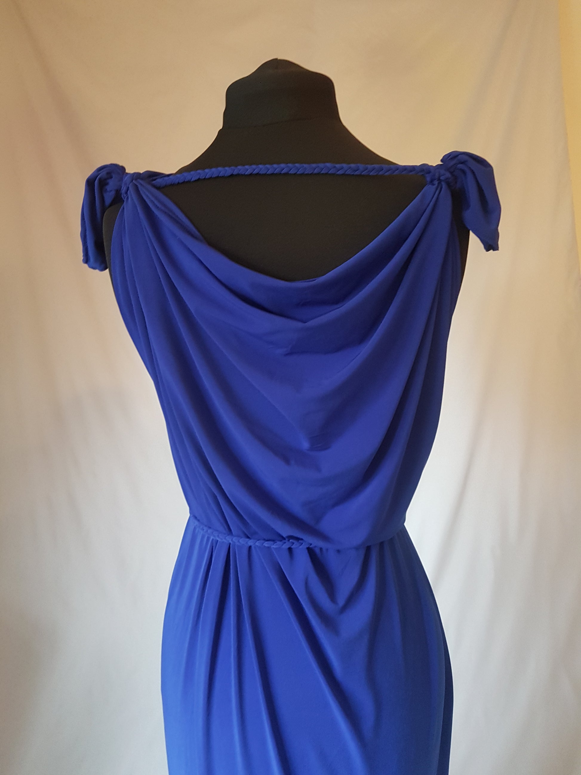 This dress will fit up to a UK16, but please message me for queries regarding the fit. This is a column dress with a natural waistline so the width of the fabric at all the key measurements is the same as the hem circumference. Therefore it will fit up to a waist and hip size of approx 55 inches and for smaller measurements will hang in a perfect drape around the body.