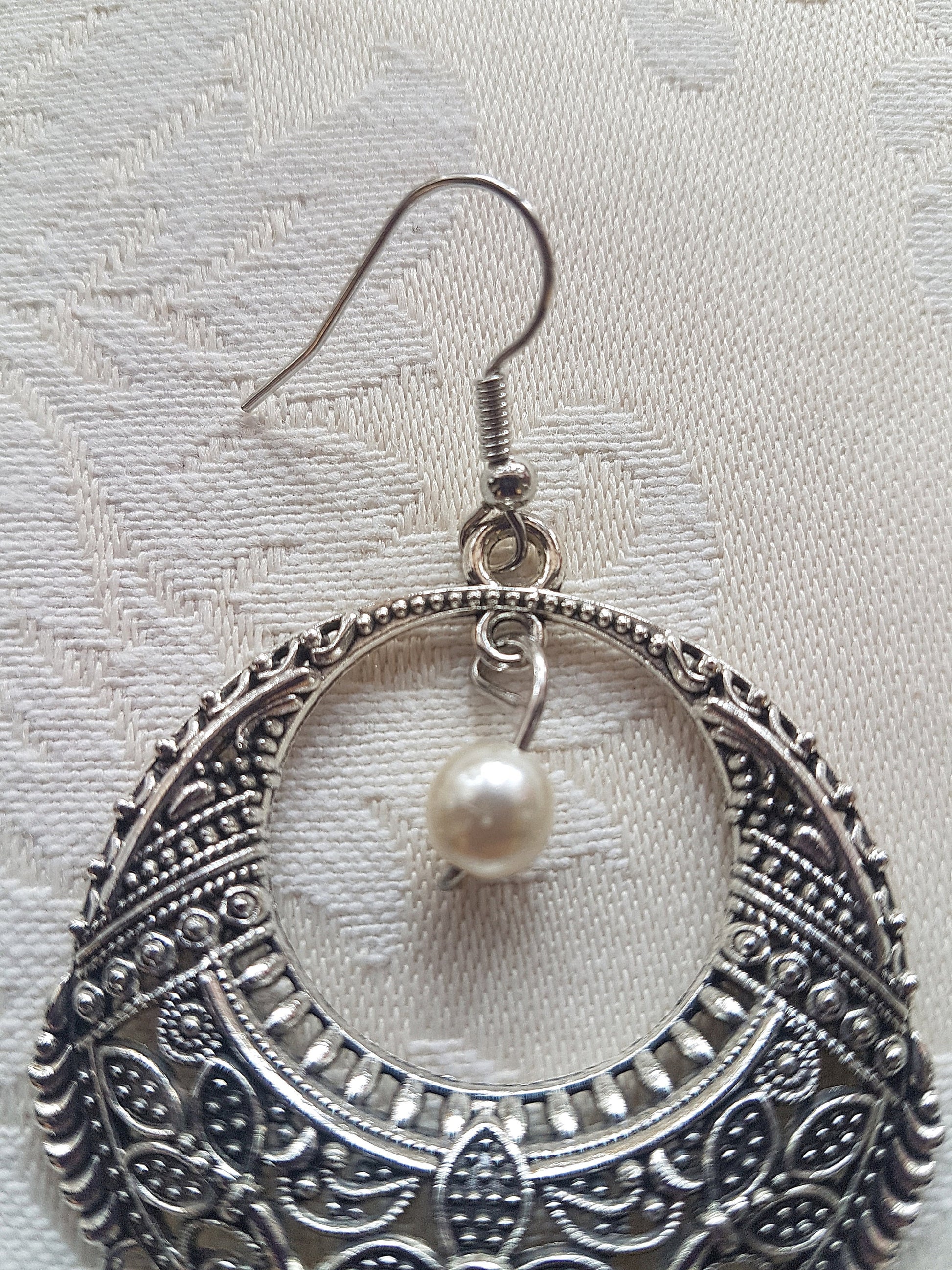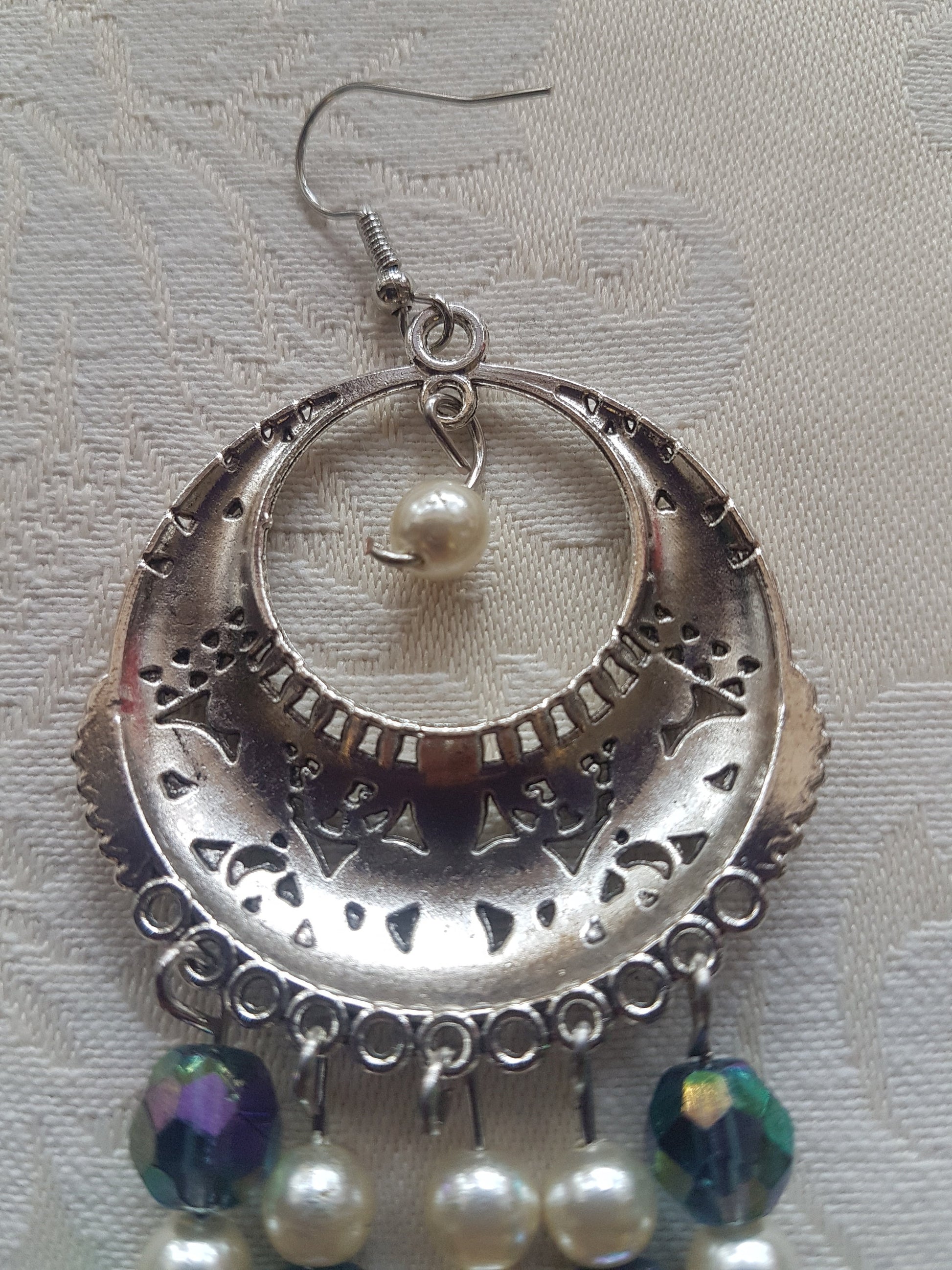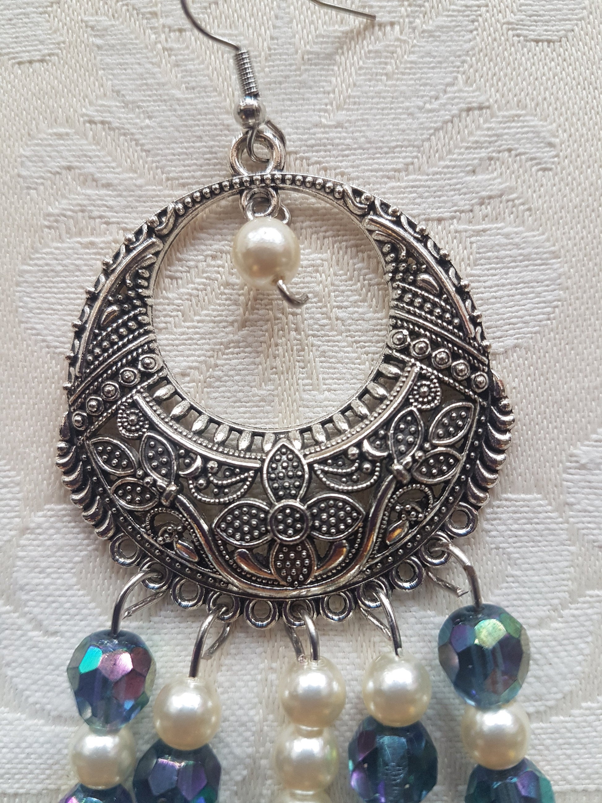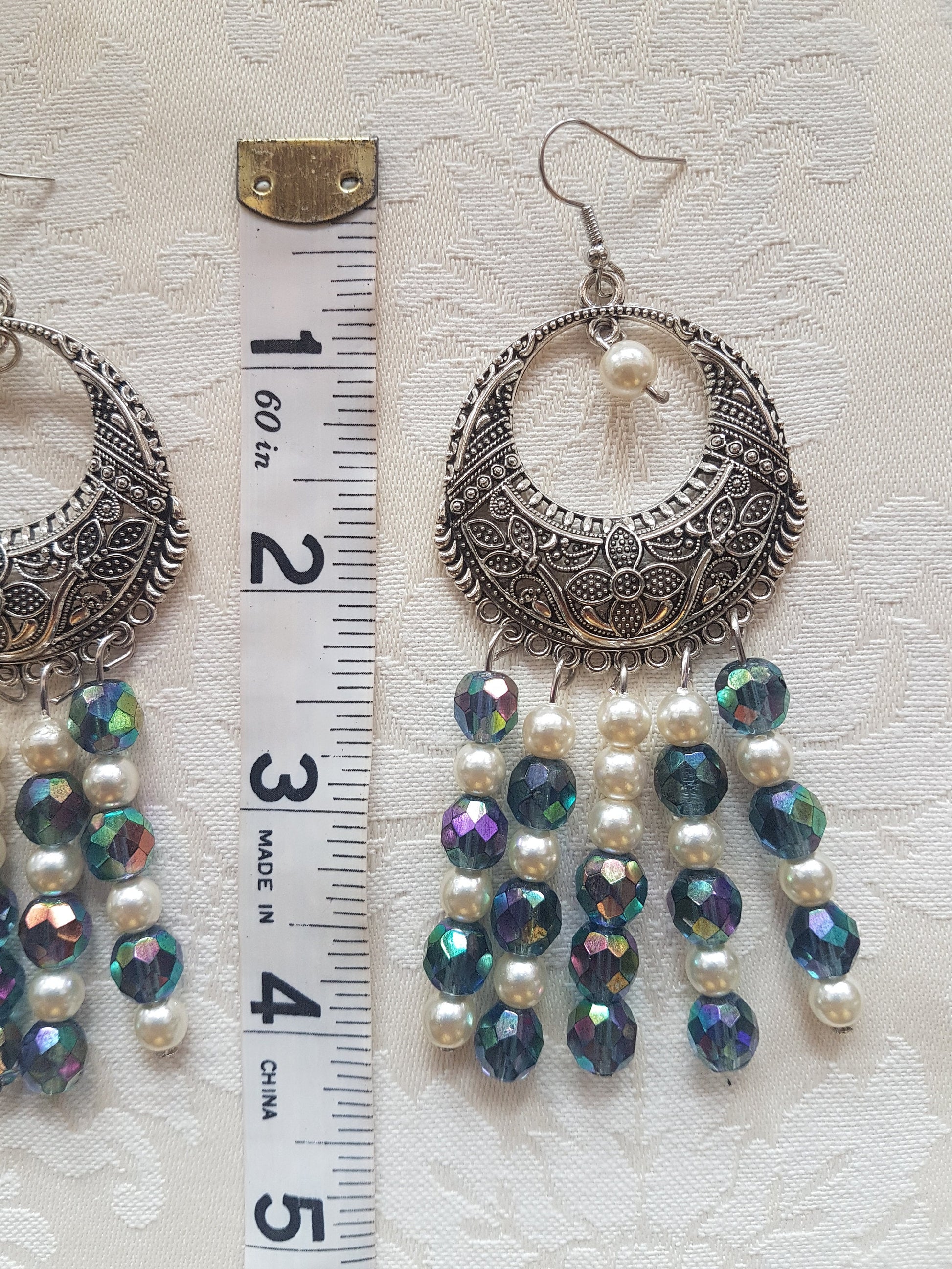 This pair have a length approx 5 inches and comprise a silver effect earring with blue and pearl beads on a silver post. They have a nice Art Nouveau design feel to them.