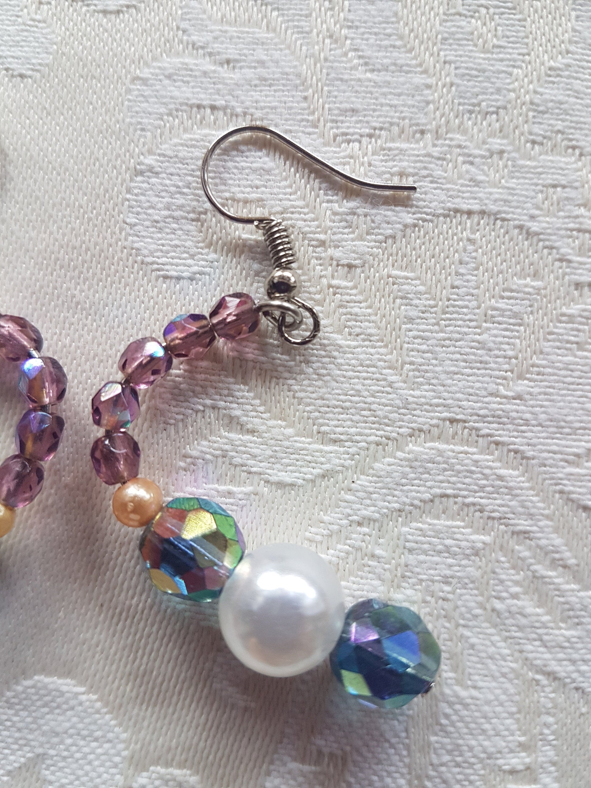 This pair have a length approx 2 inches and comprise a silver effect earring with blue, purple and pearl beads on a crescent shaped base.