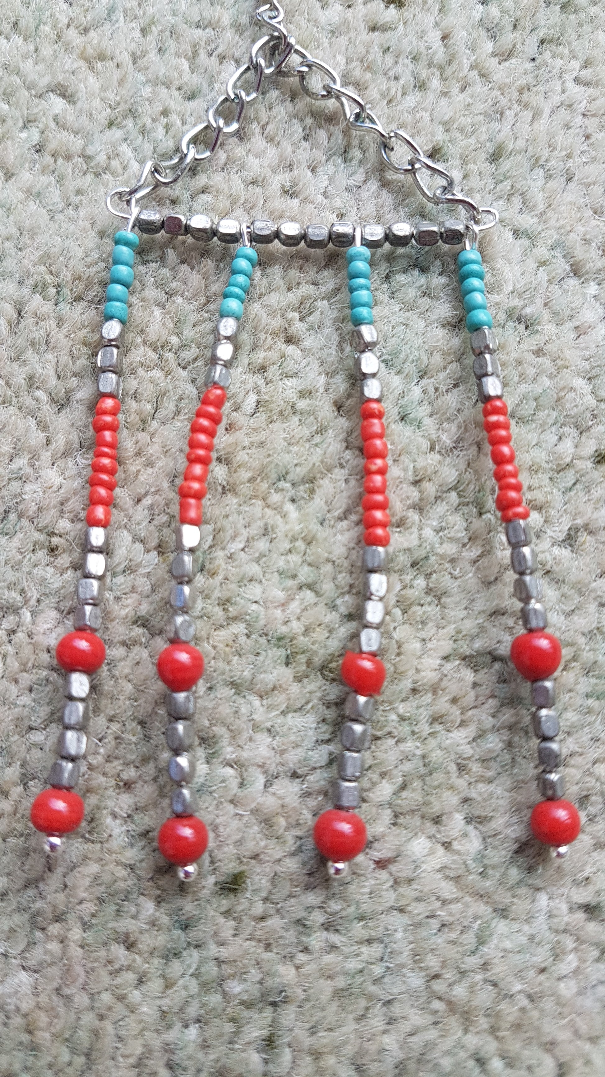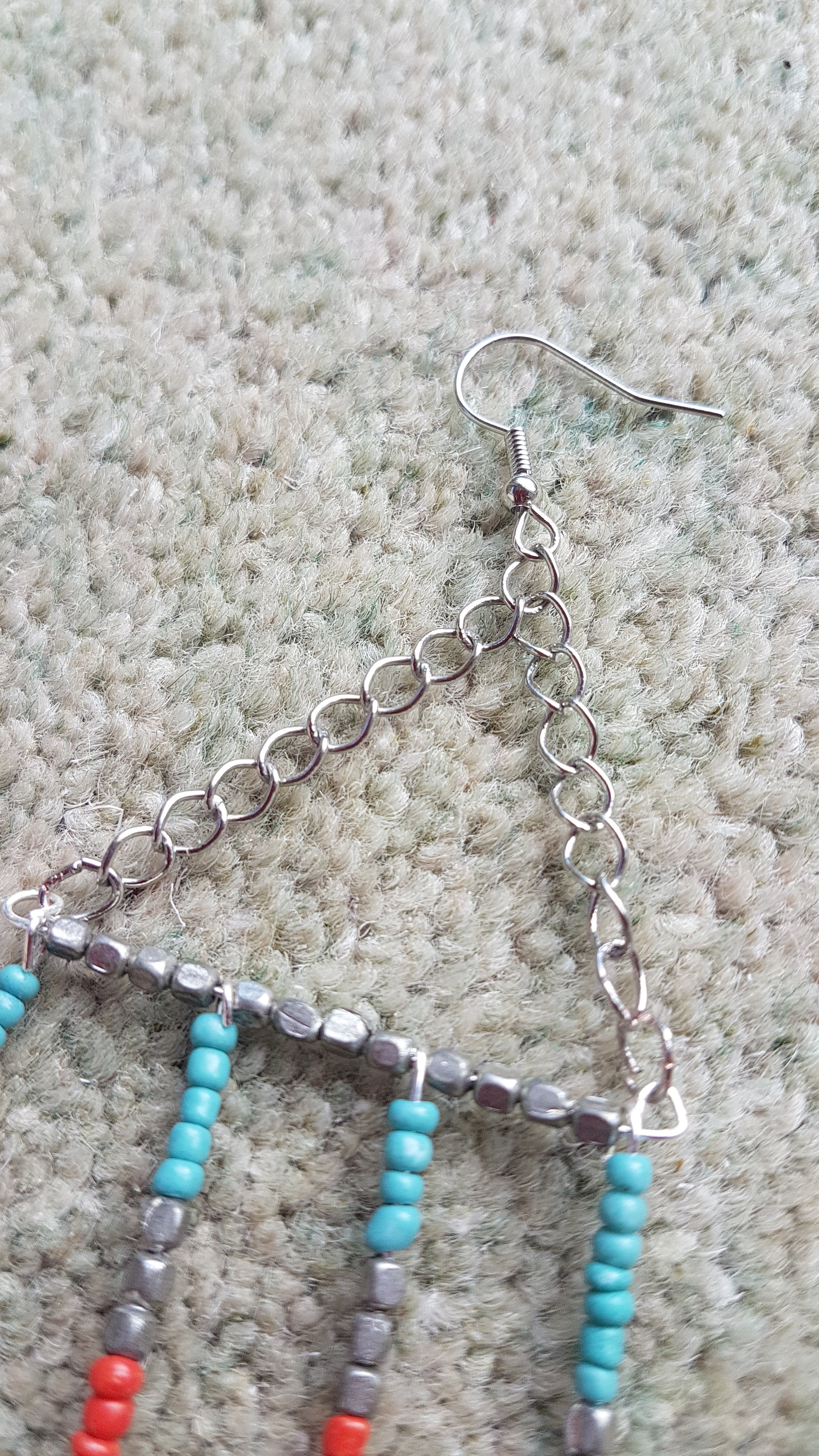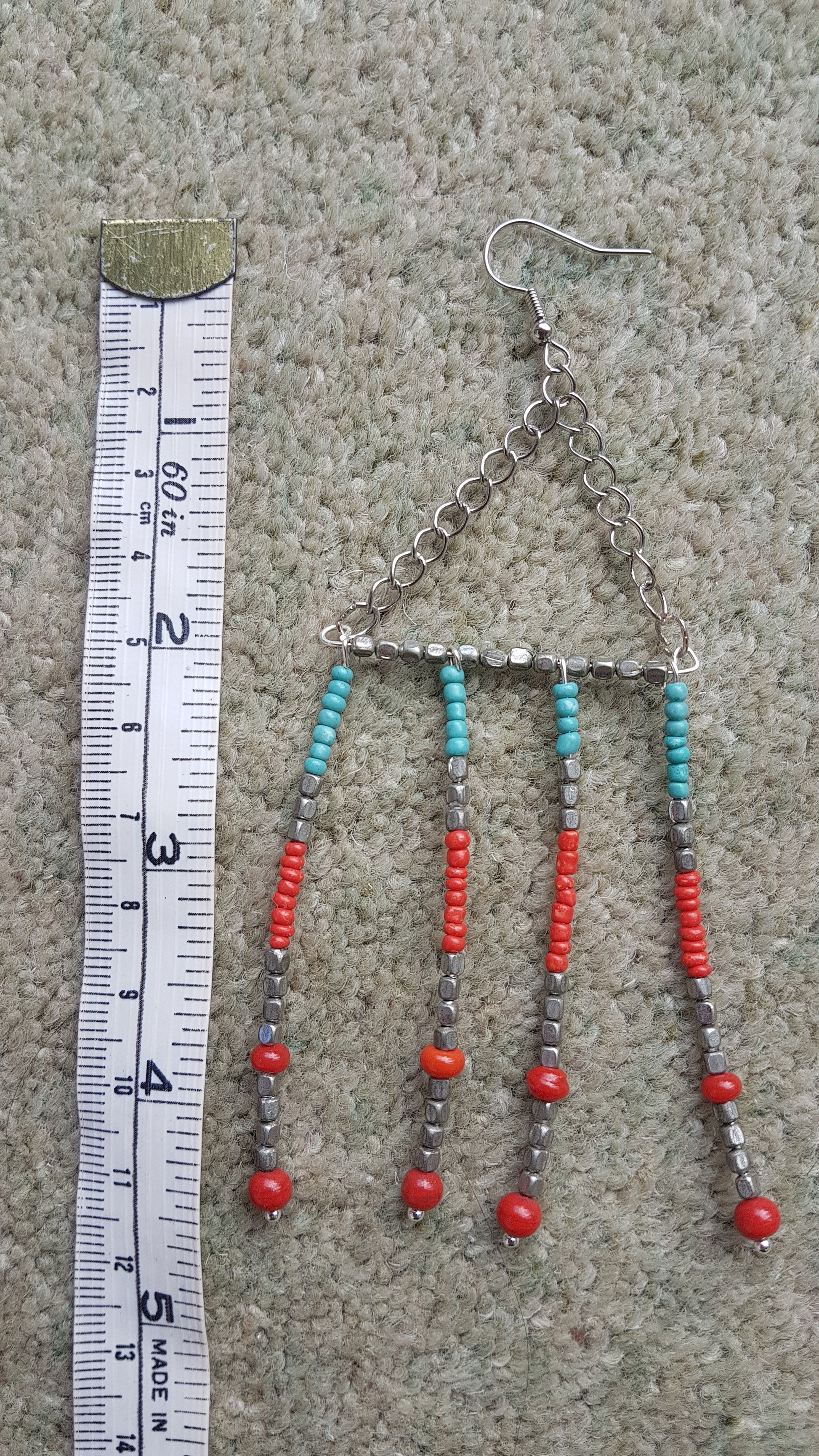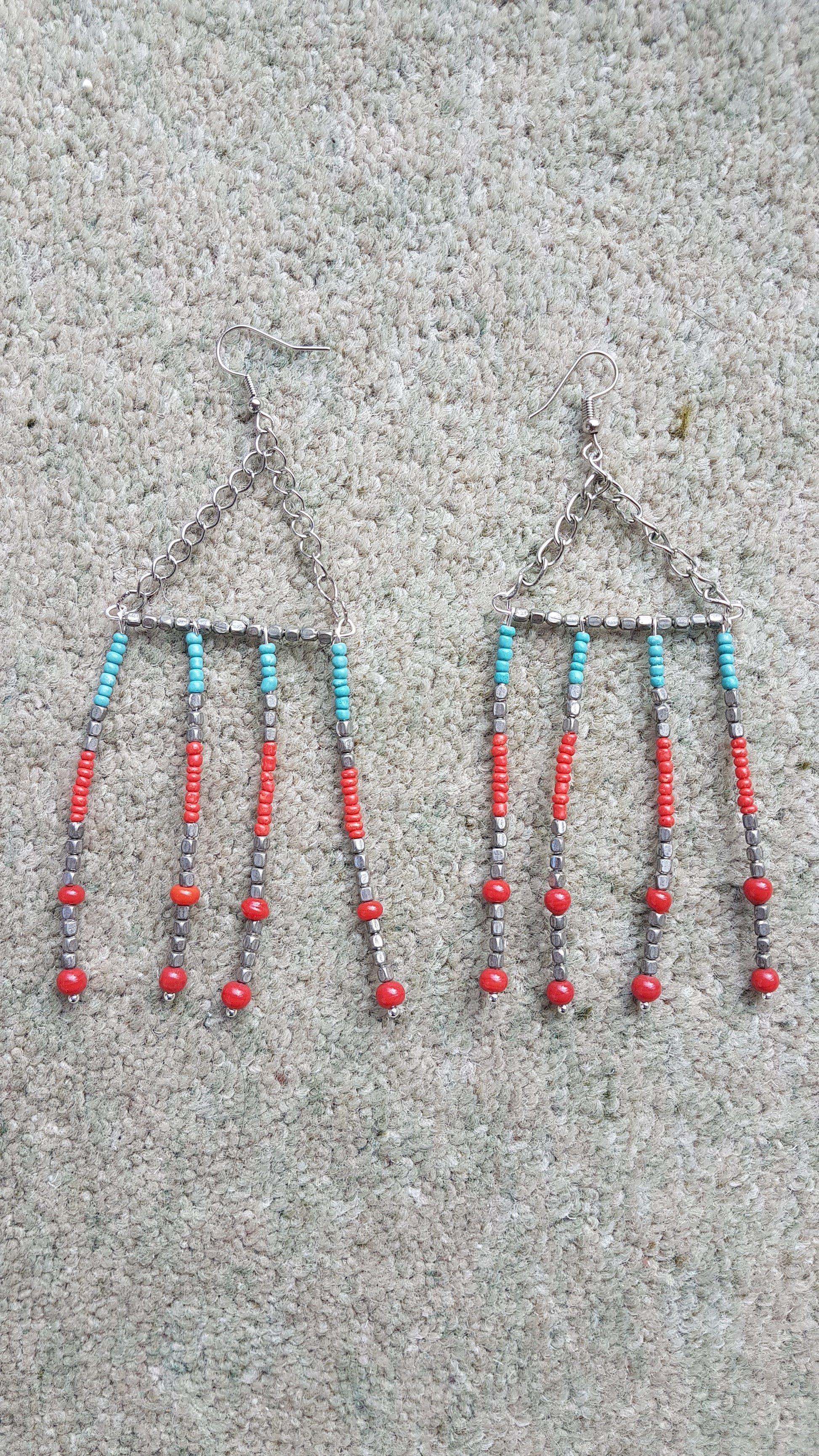 This pair have a length approx 4.5 inches and comprise a silver effect earring with red, blue and silver beads.