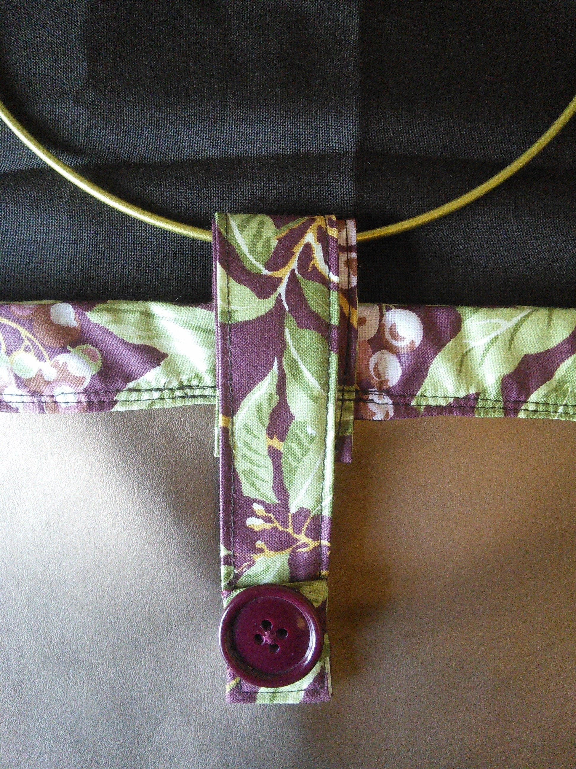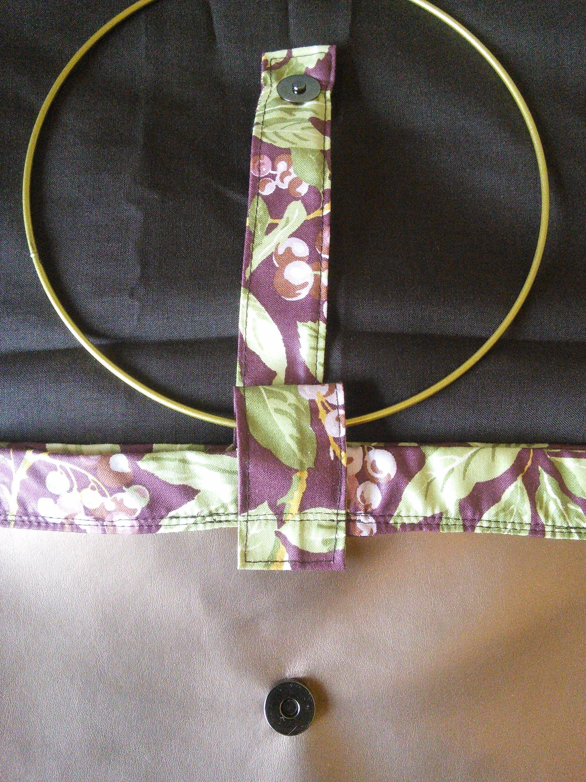 It is made from bronze coloured faux leather, unlined and trimmed in a floral Laura Ashley fabric in burgundy and green. The single handle is gold effect metal and the bag fastens with a metal magnetic clasp on a matching strap which has a vintage burgundy button as a trim.