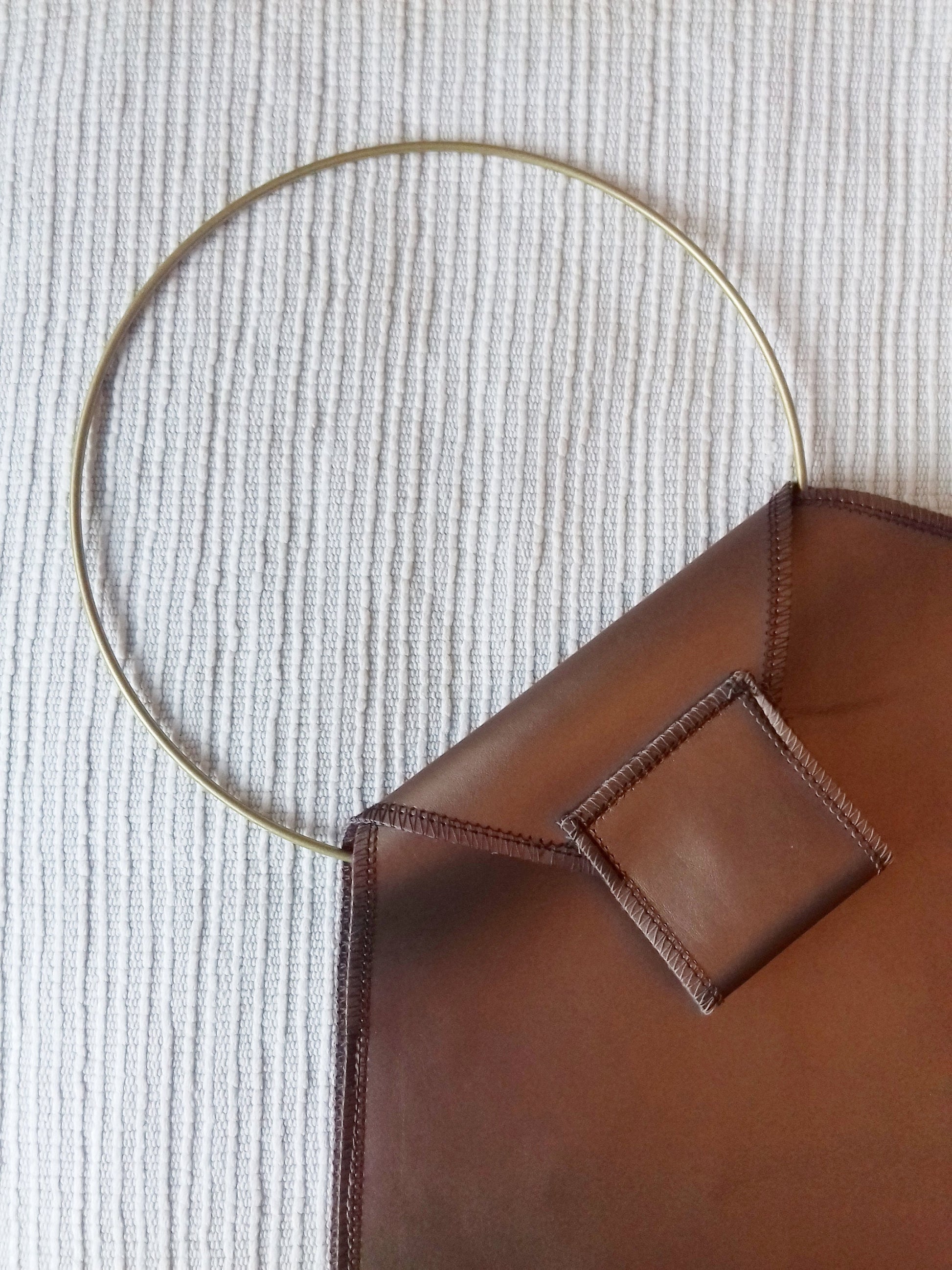 This asymmetrical handbag is perfect for shopping or an evening out. It is made from unlined bronze faux leather and has a large gold metal hoop handle which fits over the shoulder.