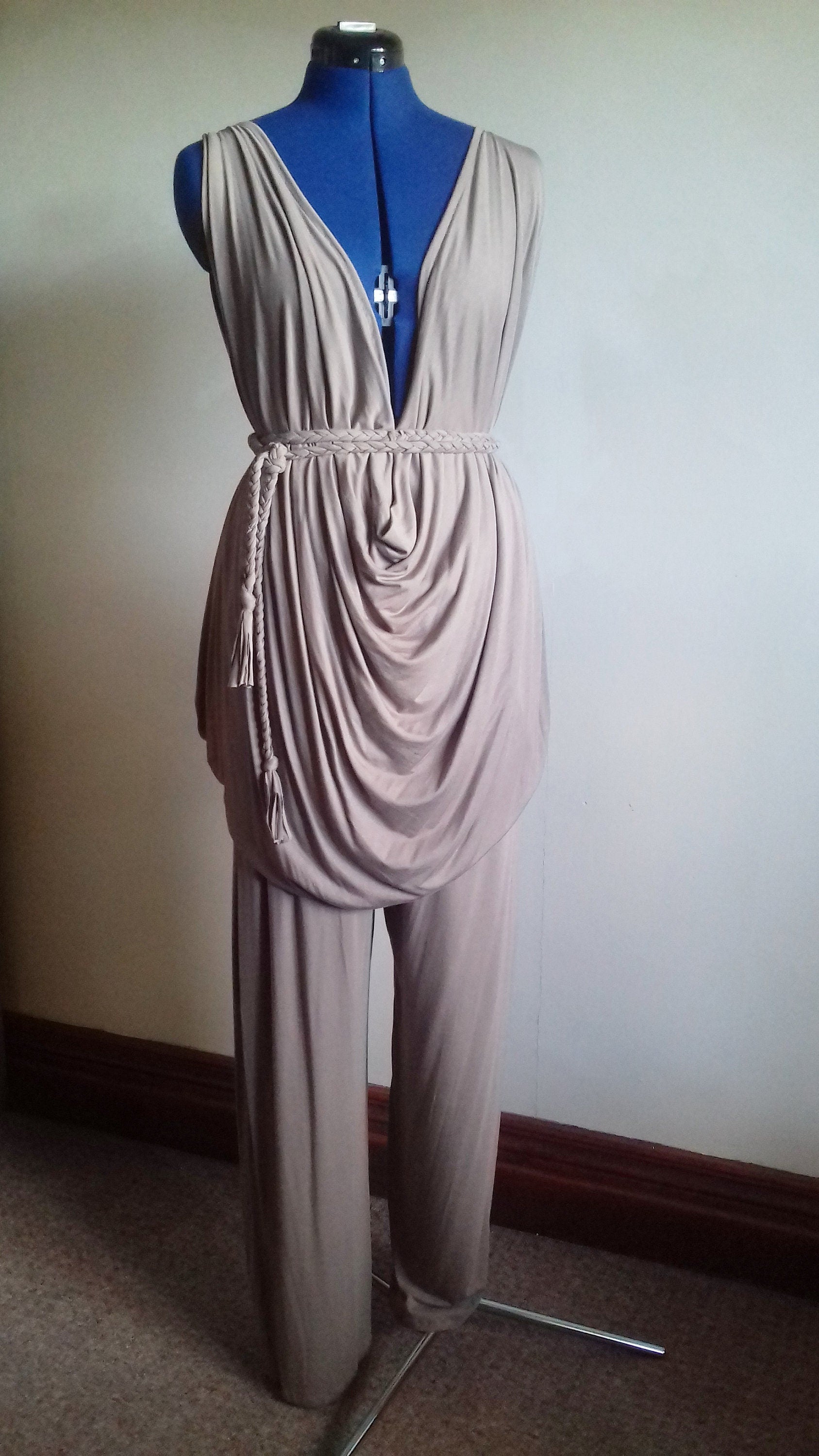 This beautiful two piece is one of my favourite drape designs. The soft jersey fabric hangs perfectly. The trousers are a harem pant style with an elasticated waist and a straight leg and slightly tapered cuff.