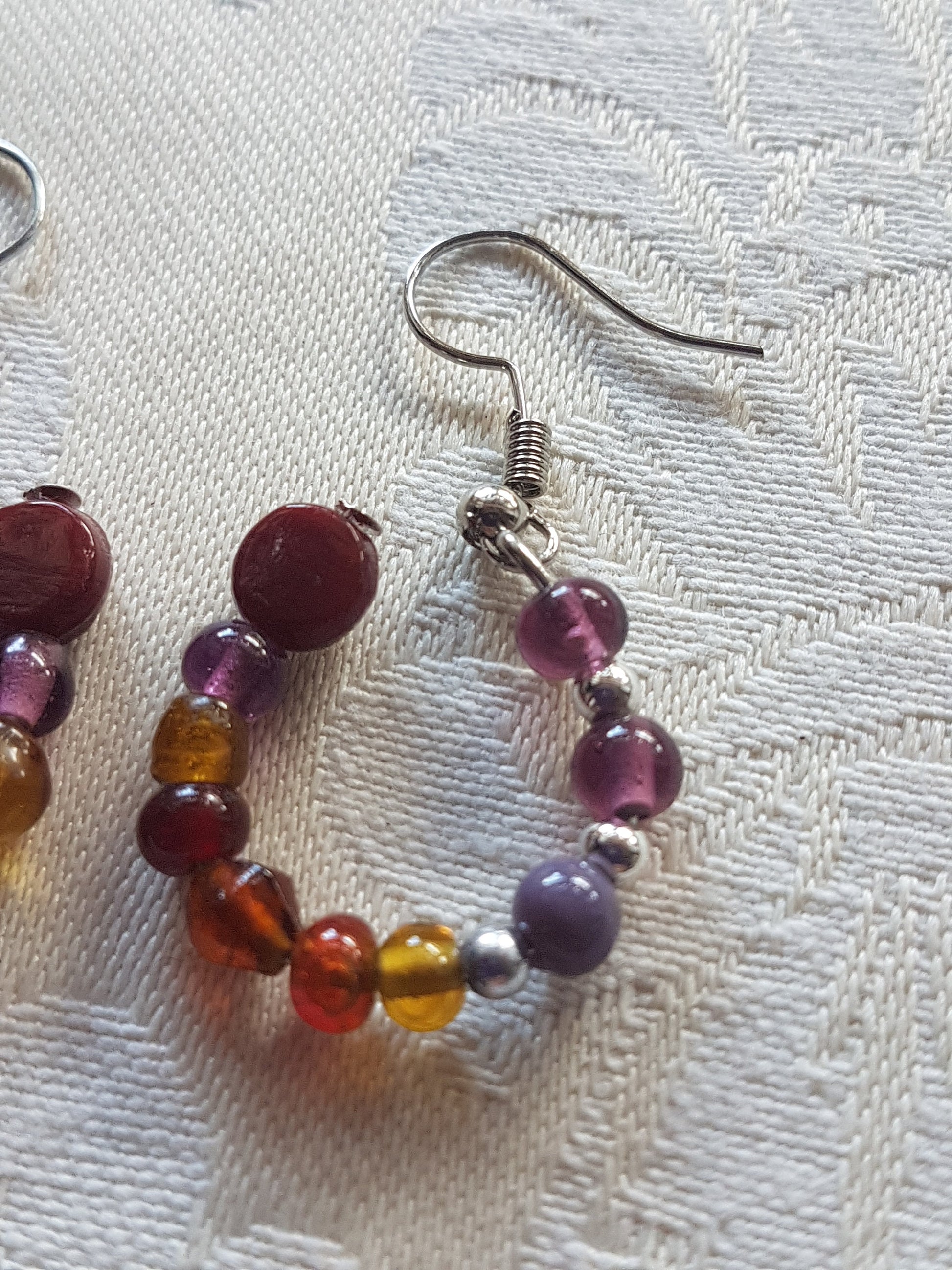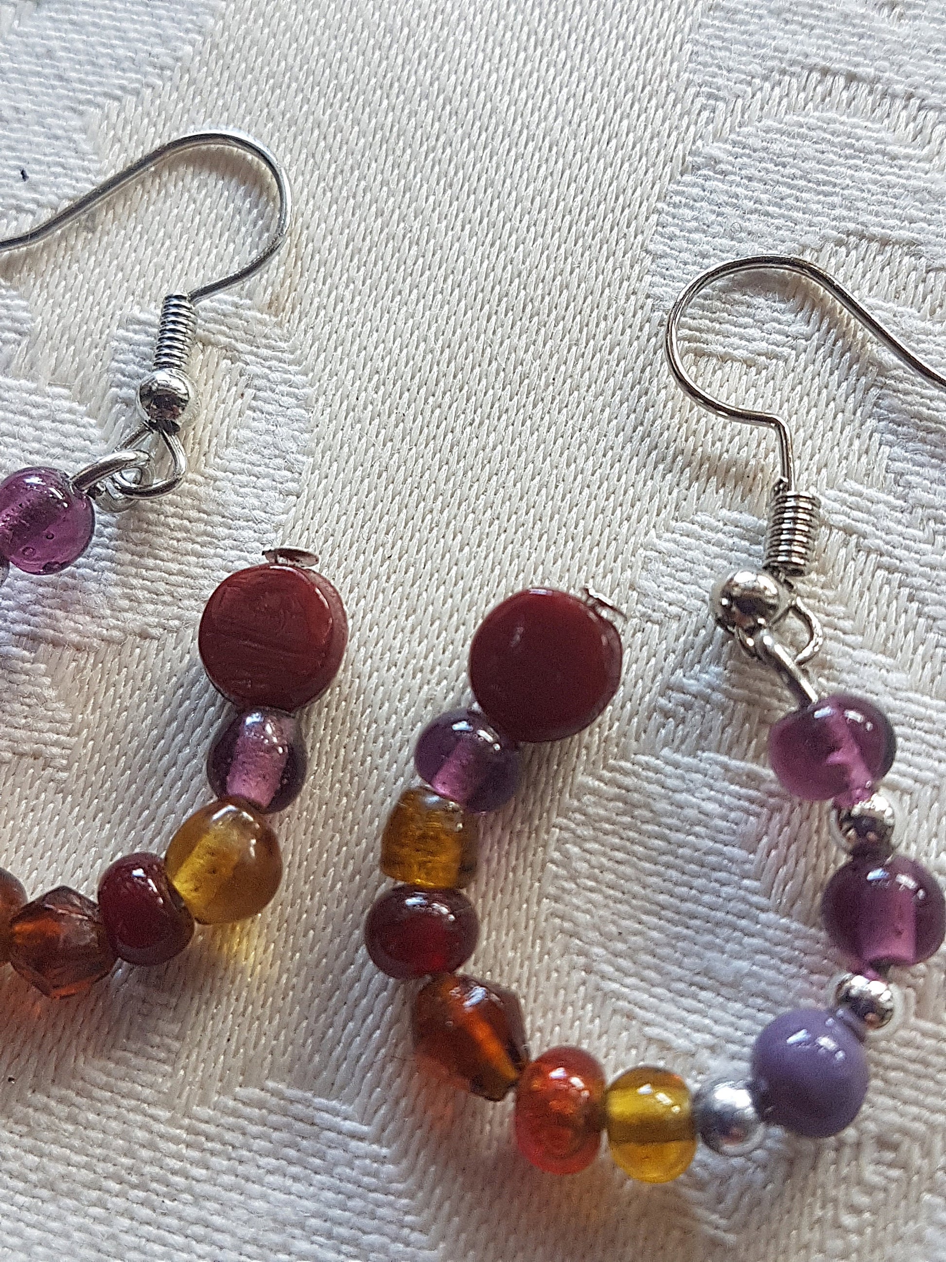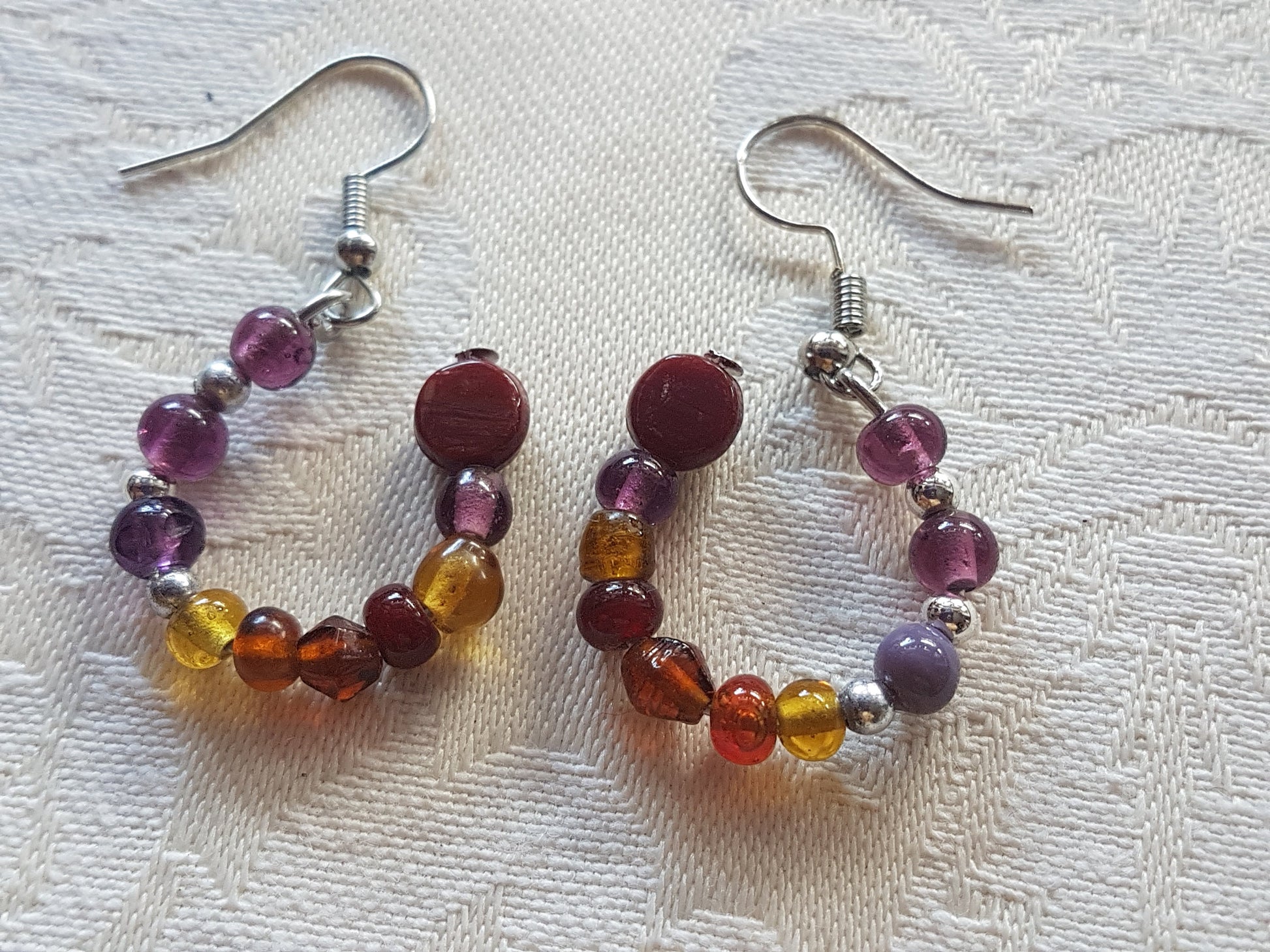 This pair have a length approx 1.5 inches and comprise a silver effect earring with burgundy, yellow and purple beads on a crescent shaped base.