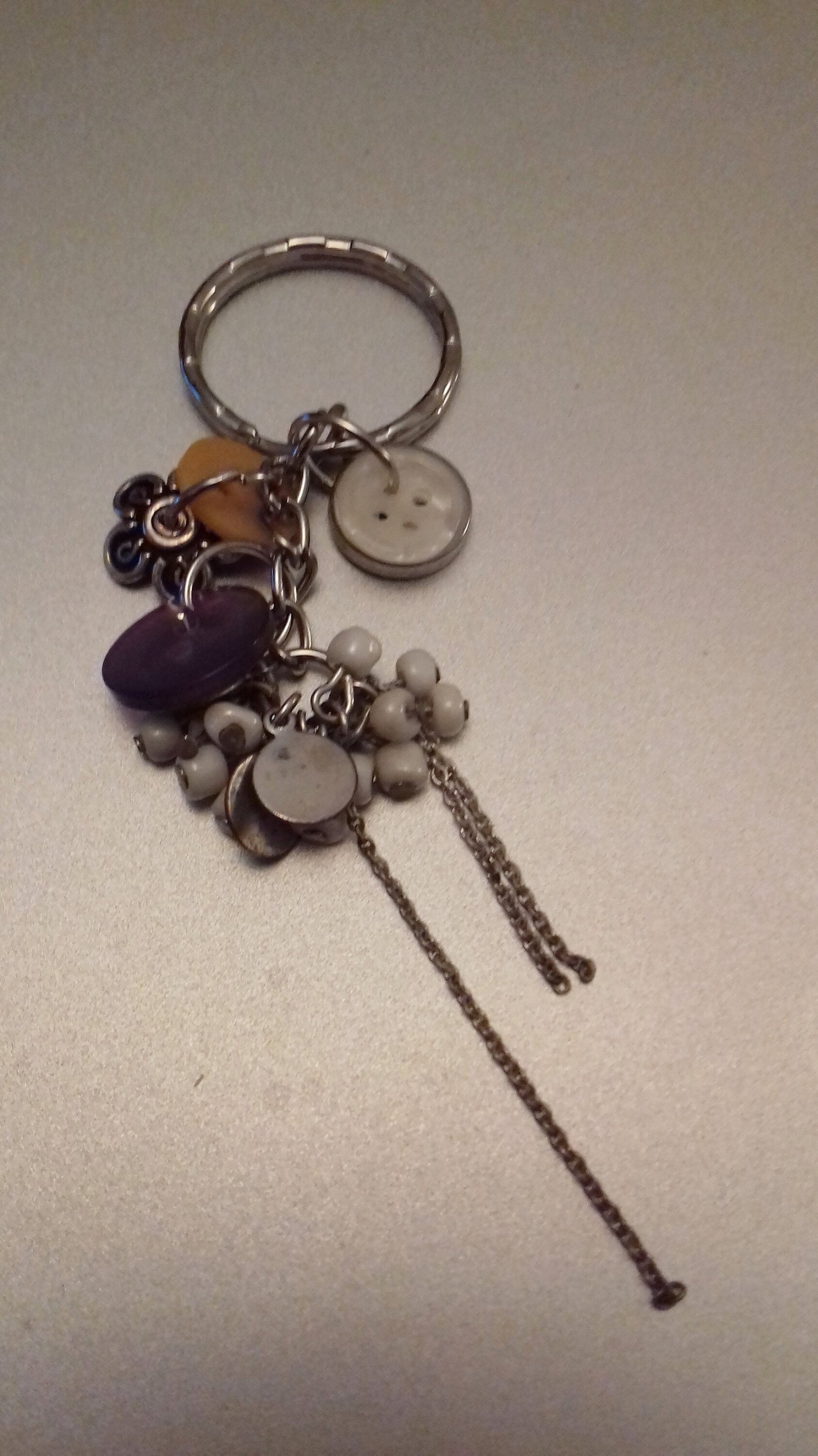 This is a gorgeous little keychain which features a silver chain, vintage buttons in shades of cream, orange and grey and beads and necklace chain.