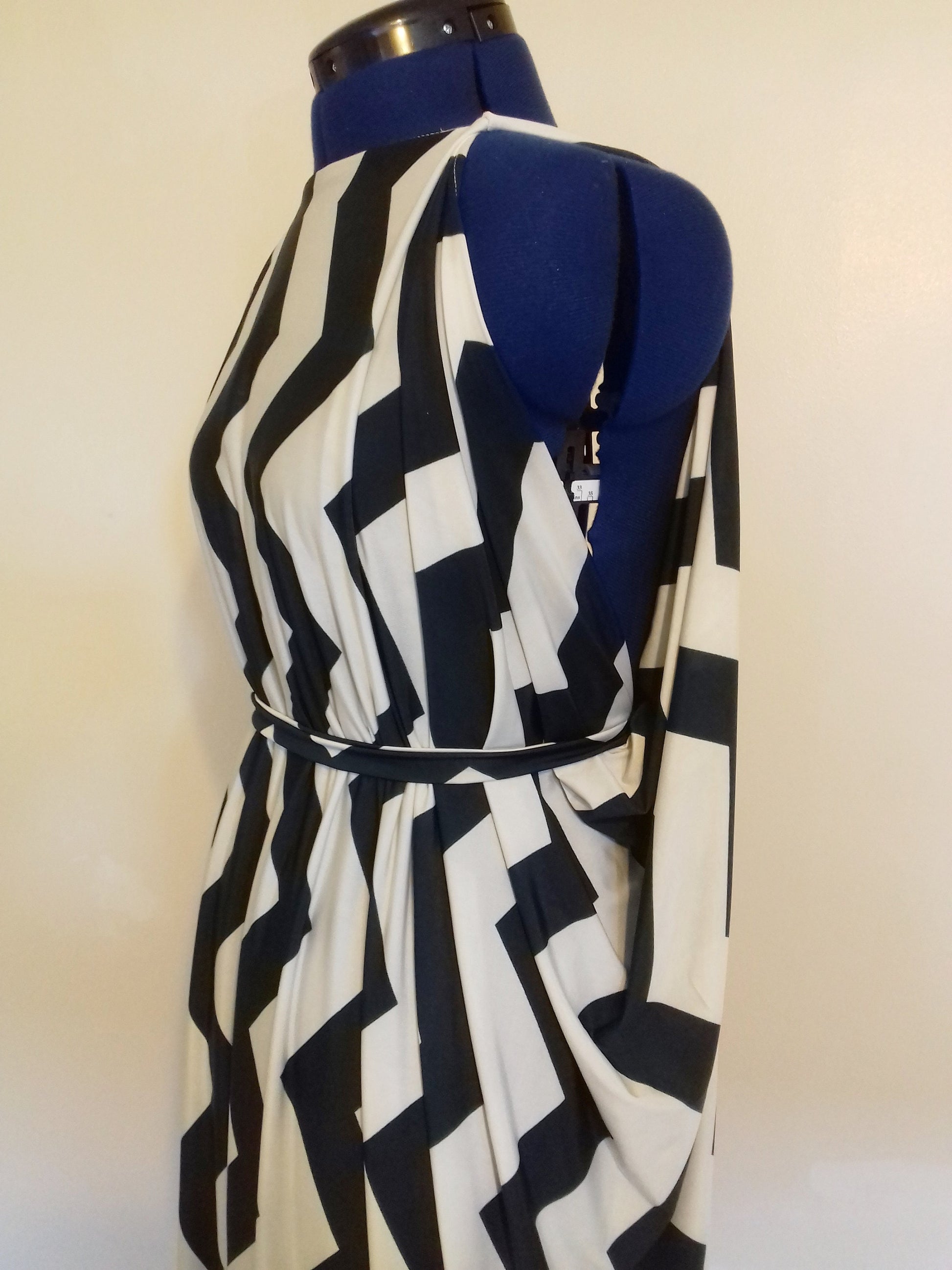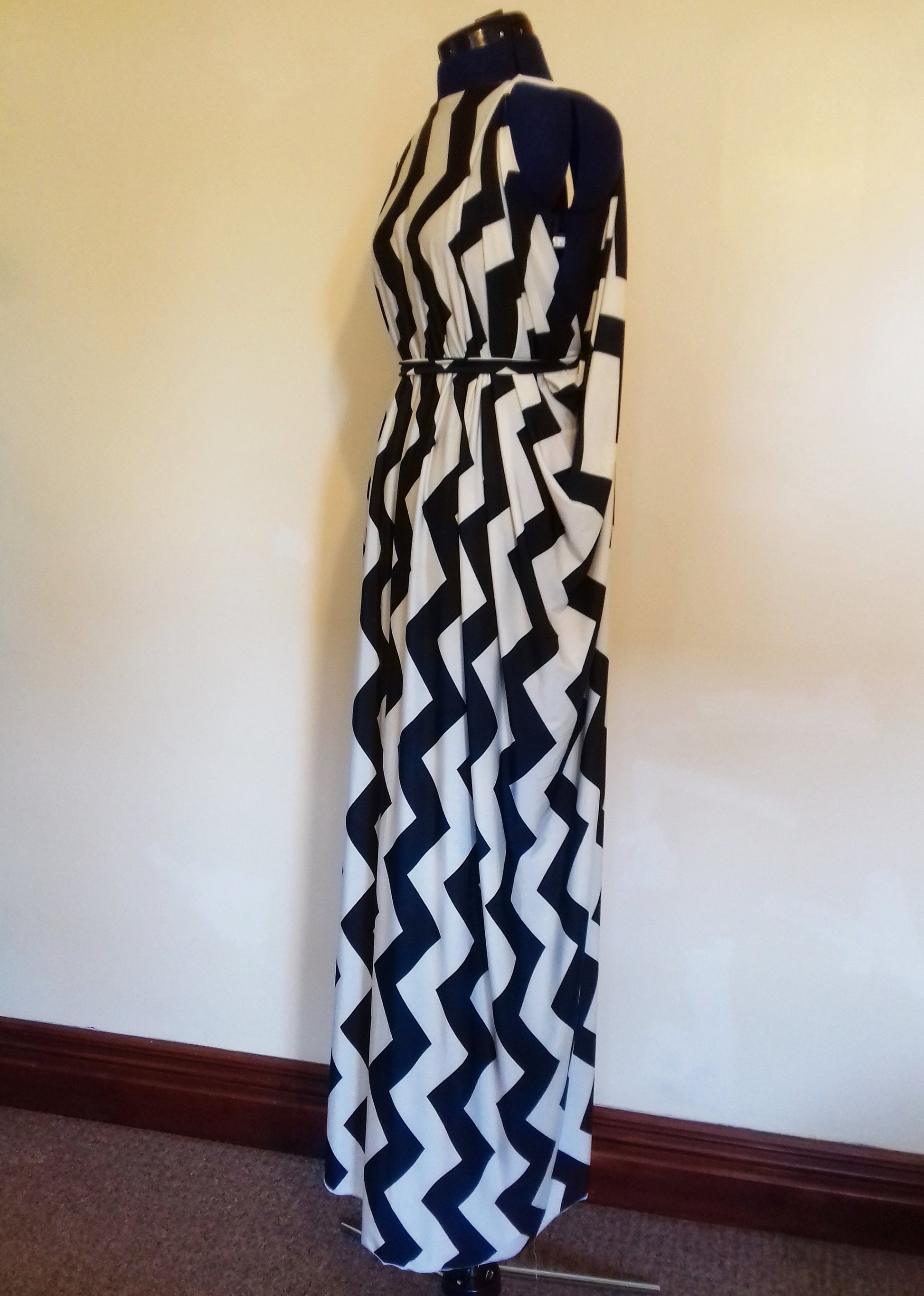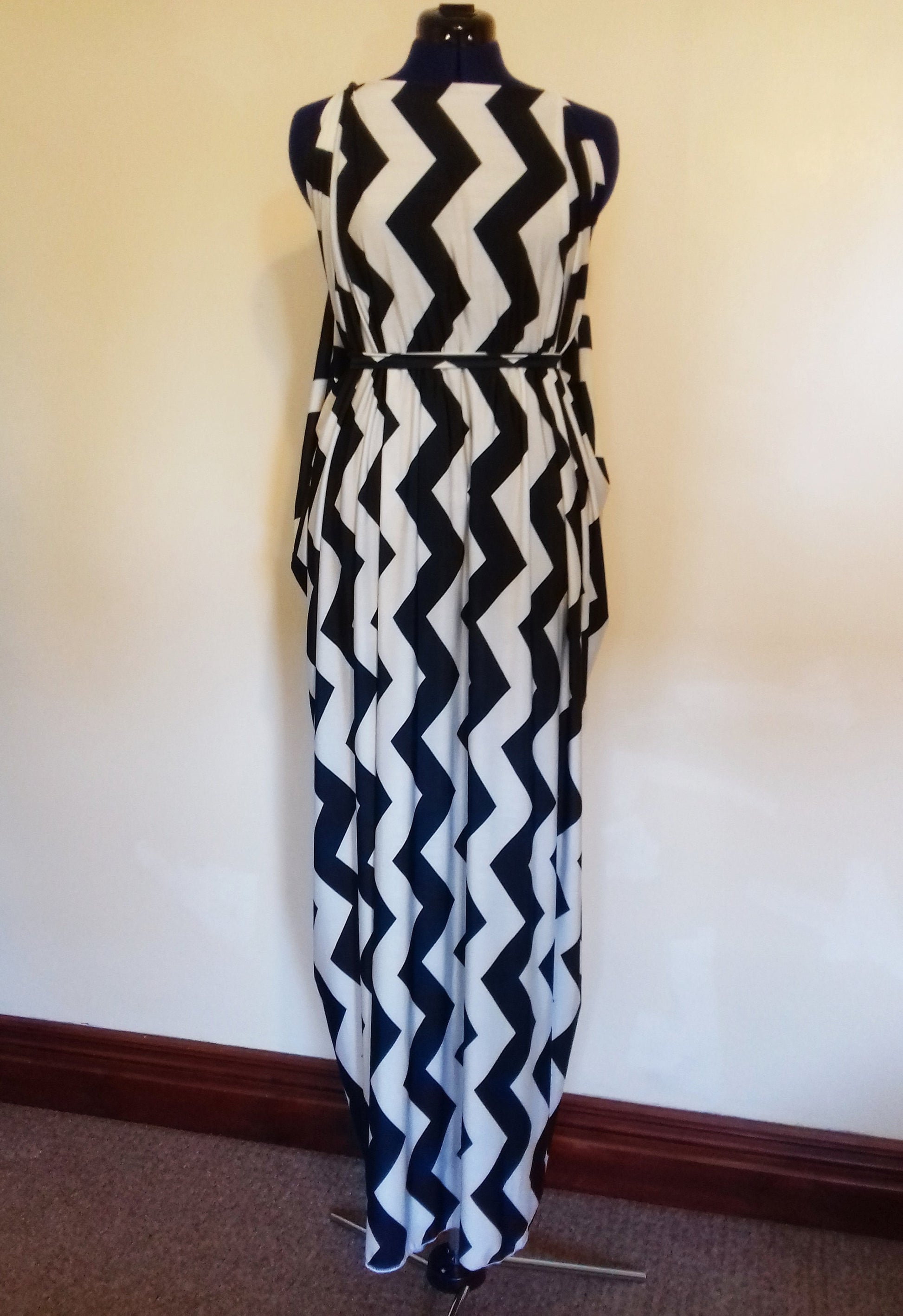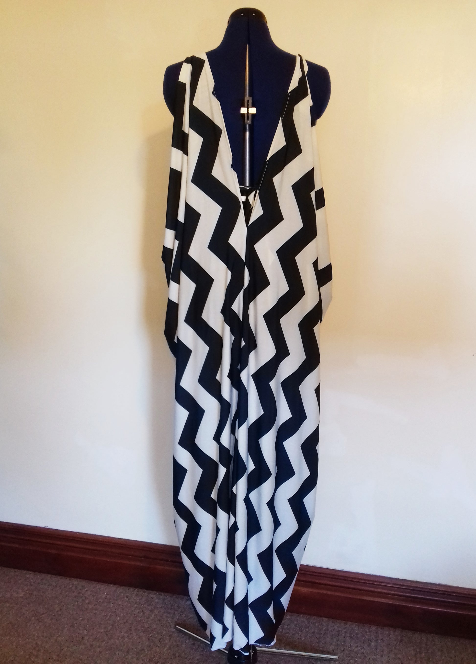 This gorgeous handmade Grecian drape dress is made from soft stretch jersey/lycra blend fabric and features a geometric zig zag pattern in white and dark green.