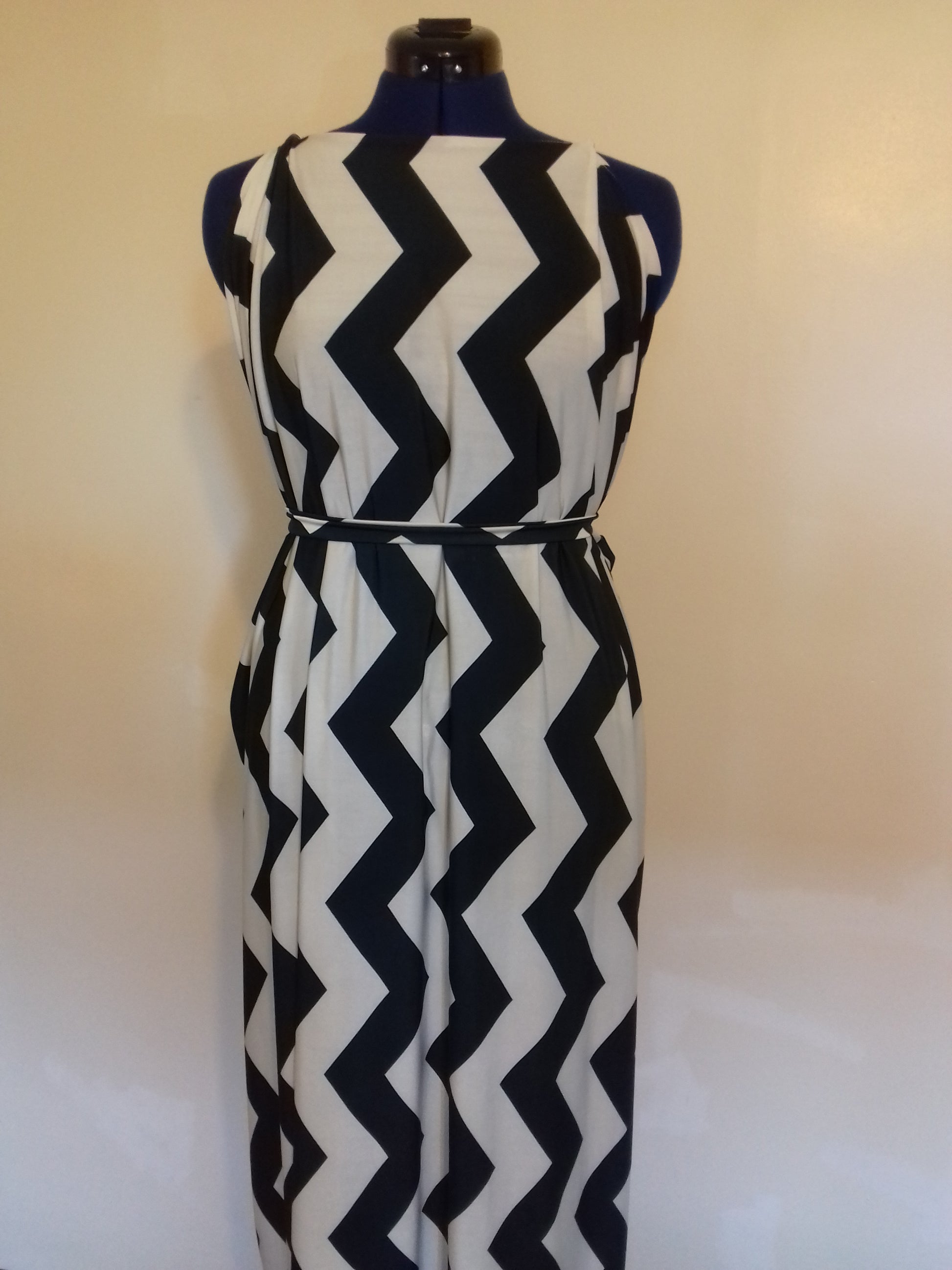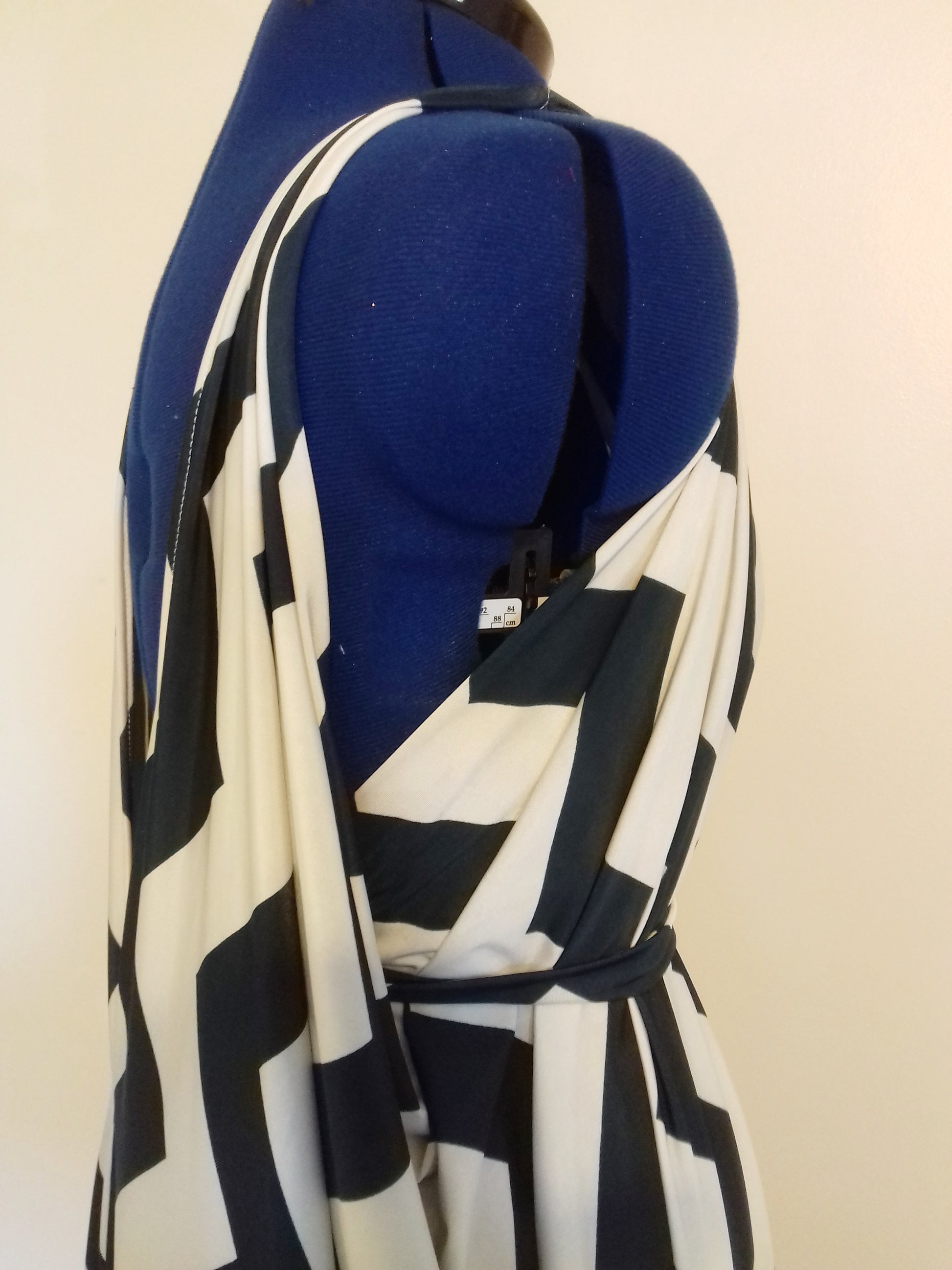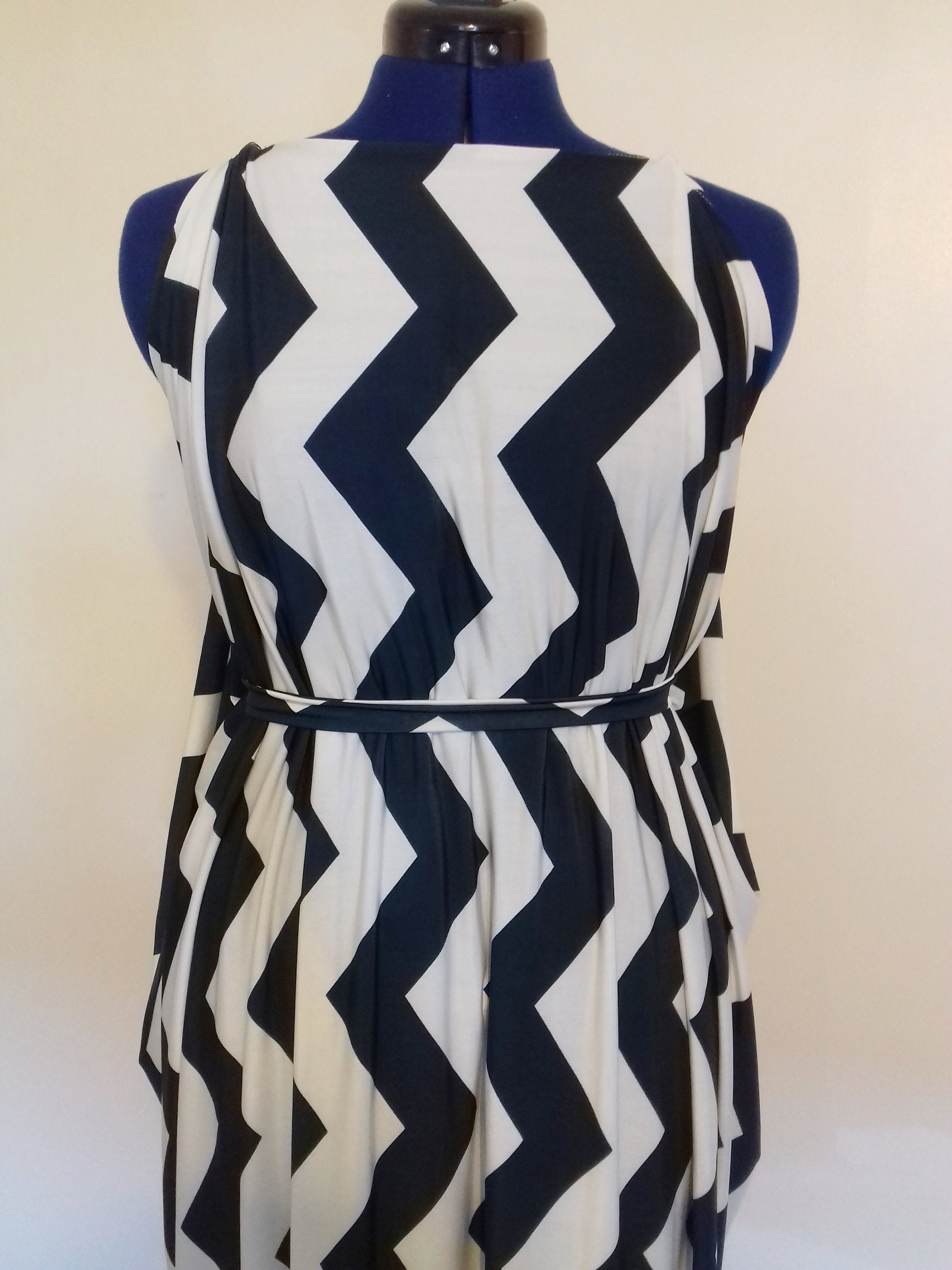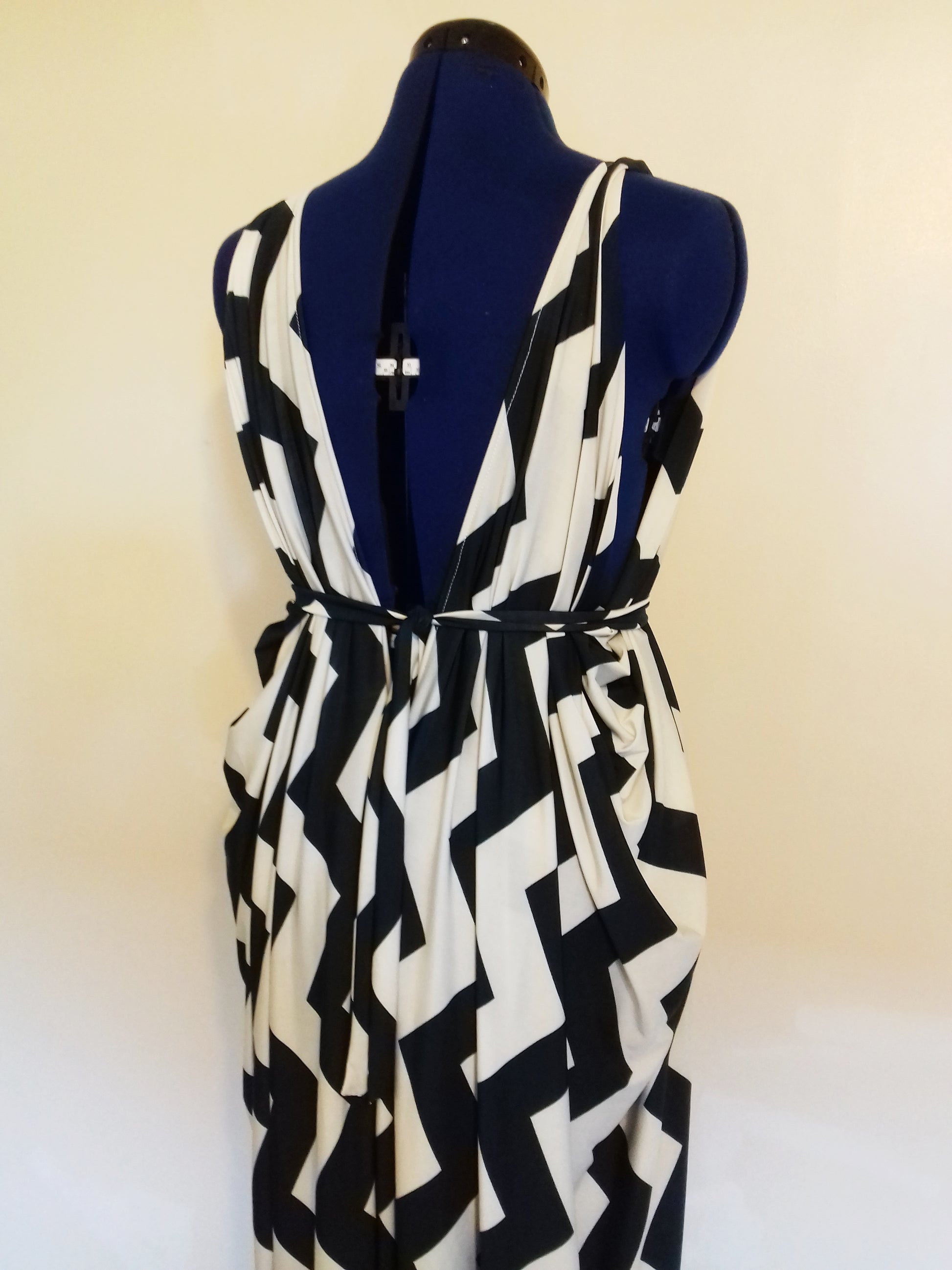 This gorgeous handmade Grecian drape dress is made from soft stretch jersey/lycra blend fabric and features a geometric zig zag pattern in white and dark green.