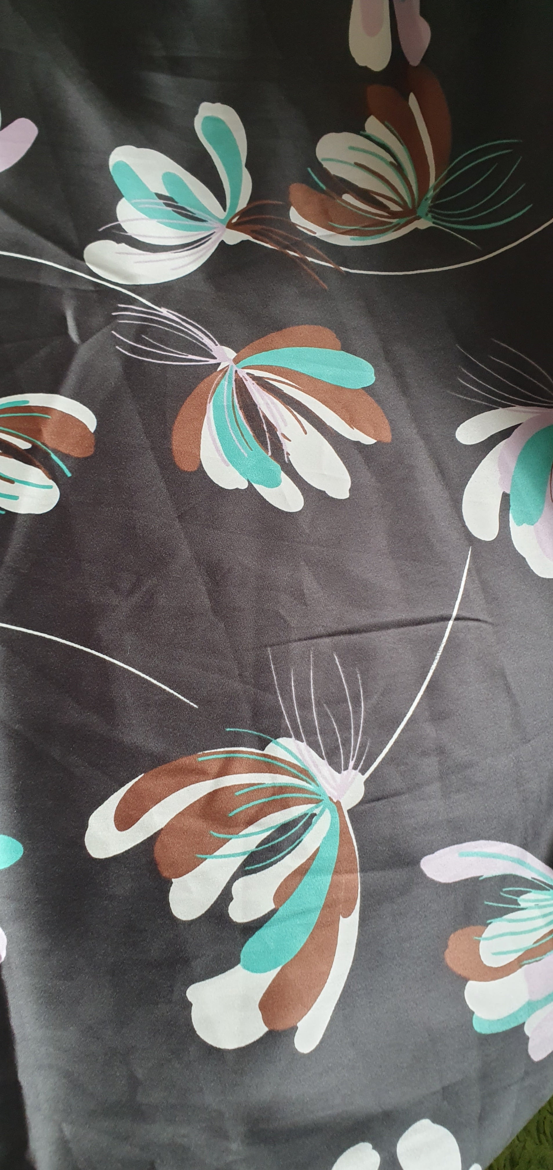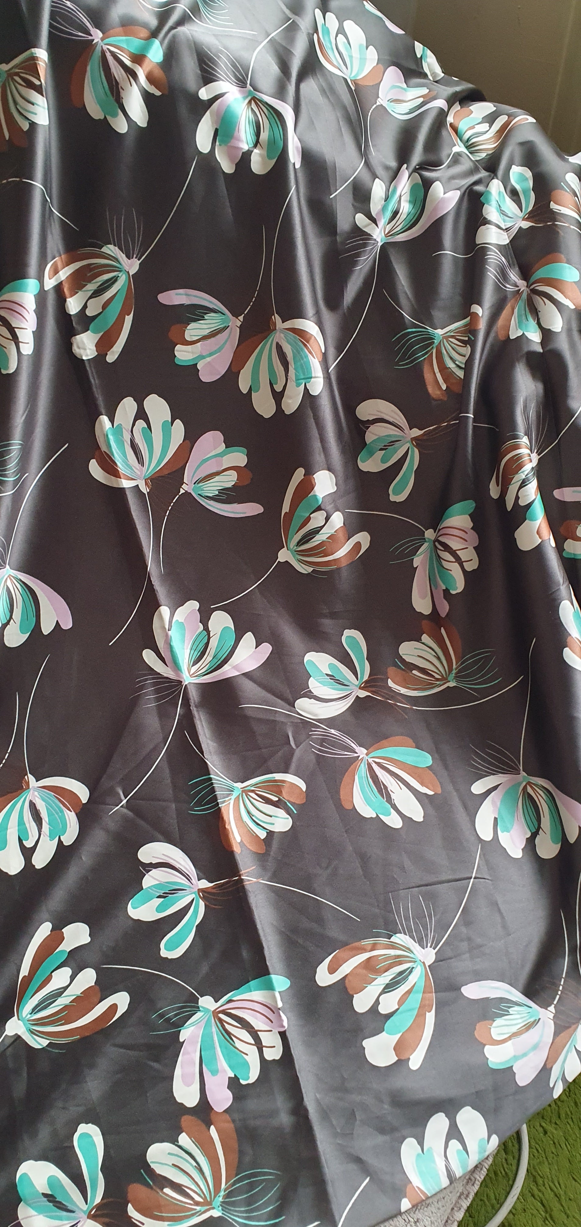 This is a lovely dark green satin fabric remnant with pink, green and cream flower motifs on it. It is perfect for clothing or home decor projects. It is 156cm long by 152cm wide.