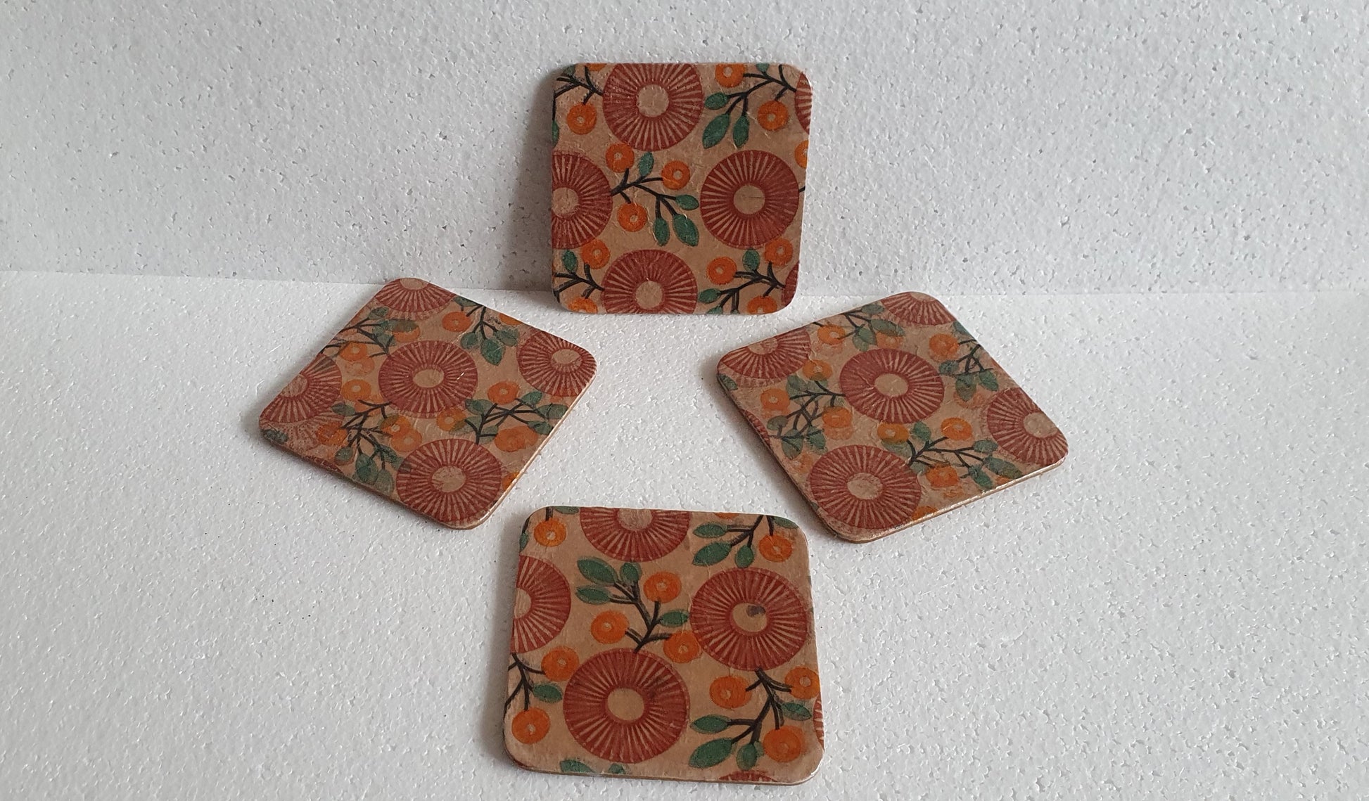 This set of four coasters have been hand decorated by me using decoupage in my studio using paper designs and then texture varnish sealed. They are also cork backed. It is a unique design and size and cannot be repeated.