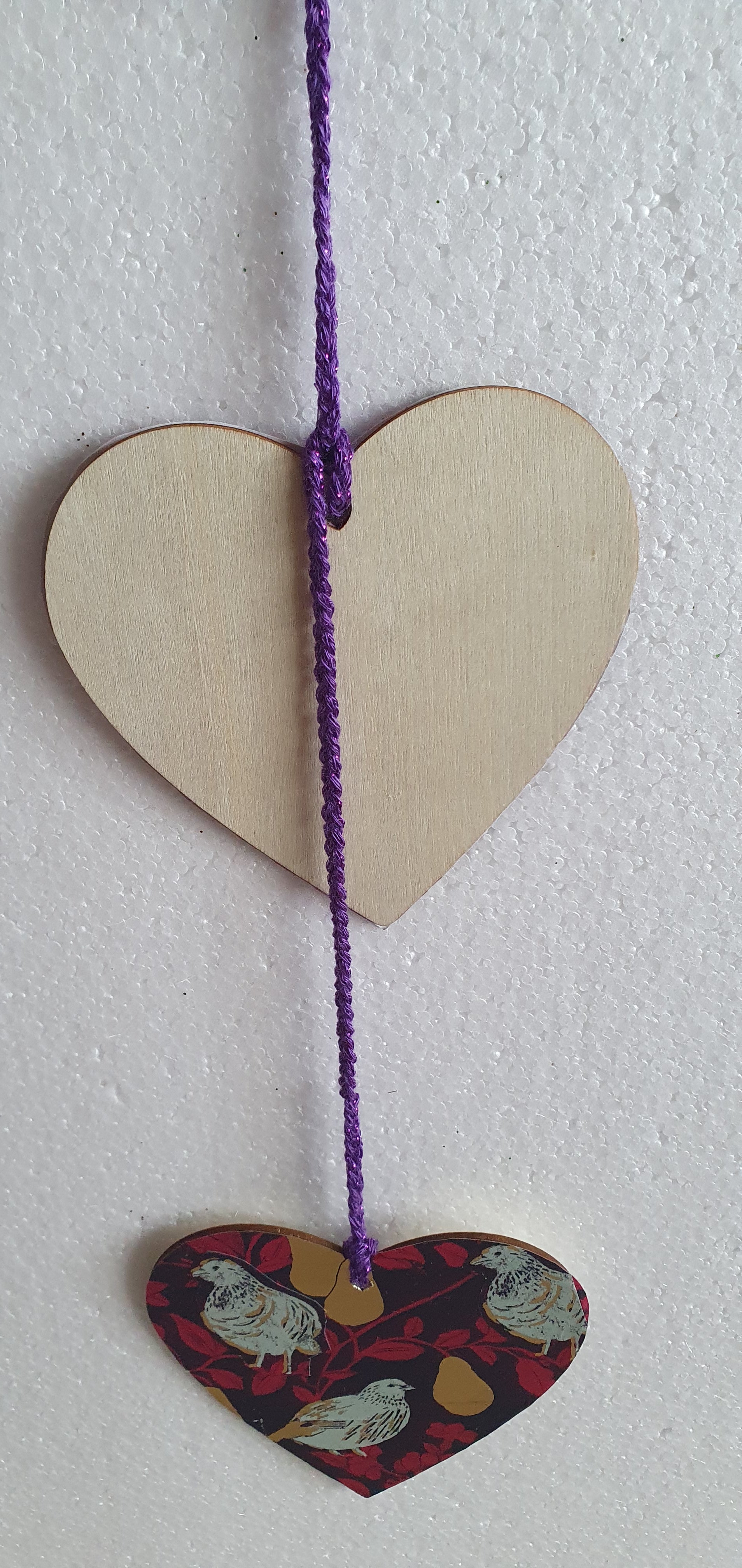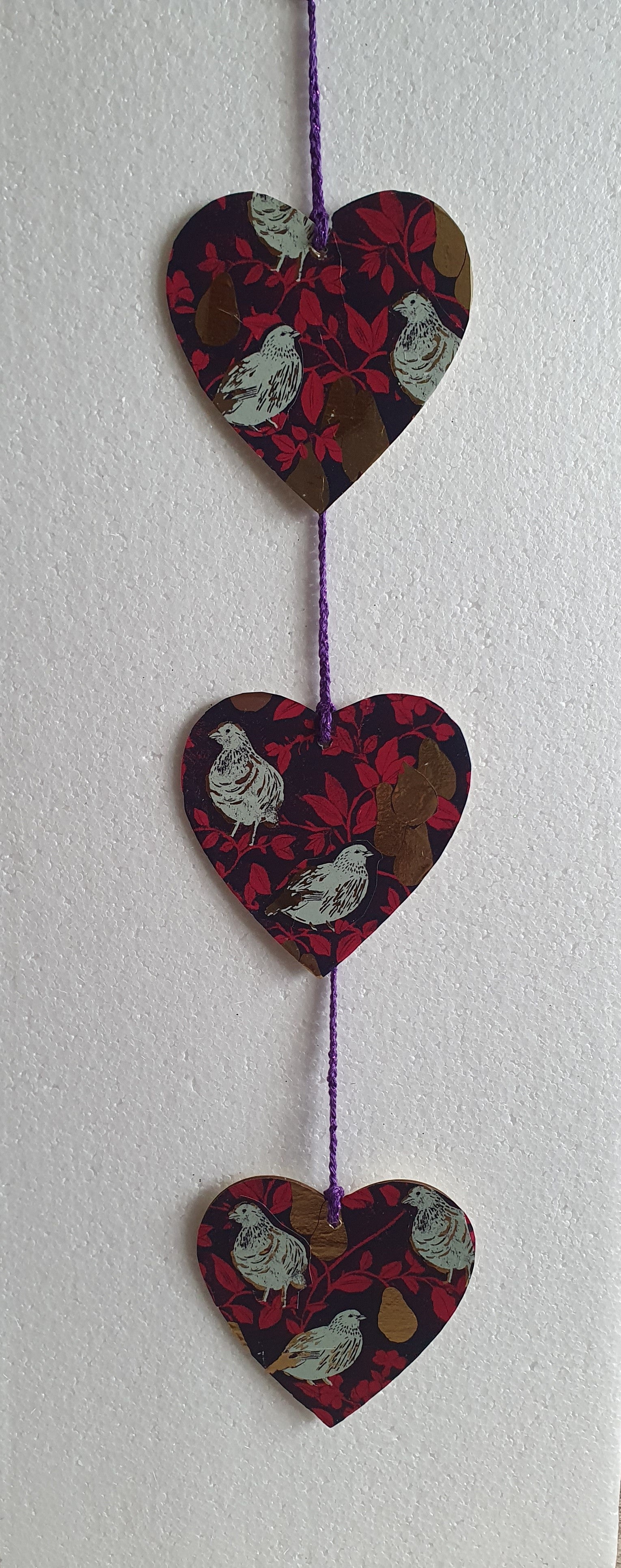 This wall hanging is made from wooden hearts and has been hand decorated by me using decoupage in my studio using paper designs and then hung using hand braided fabric. It is a unique design and size and cannot be repeated.