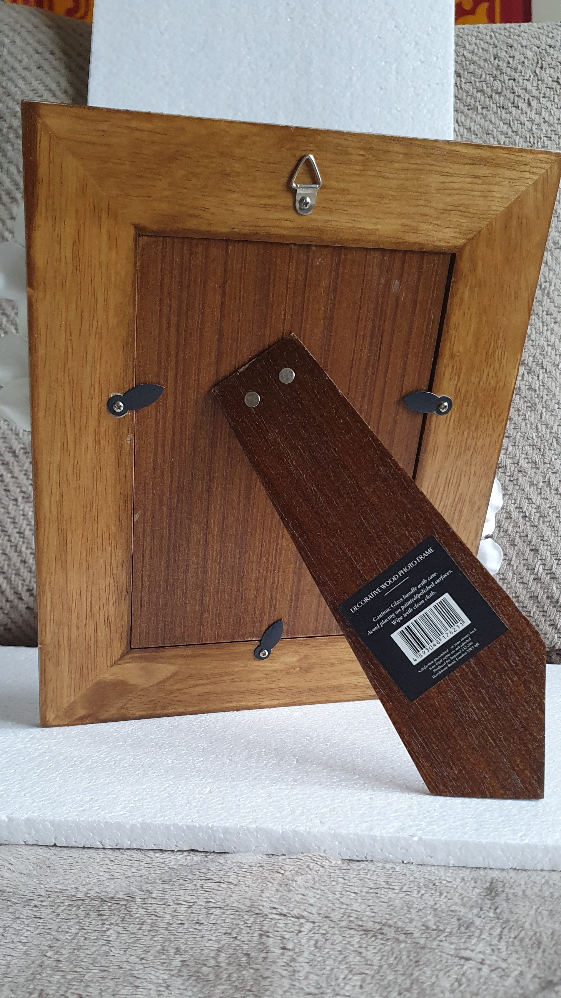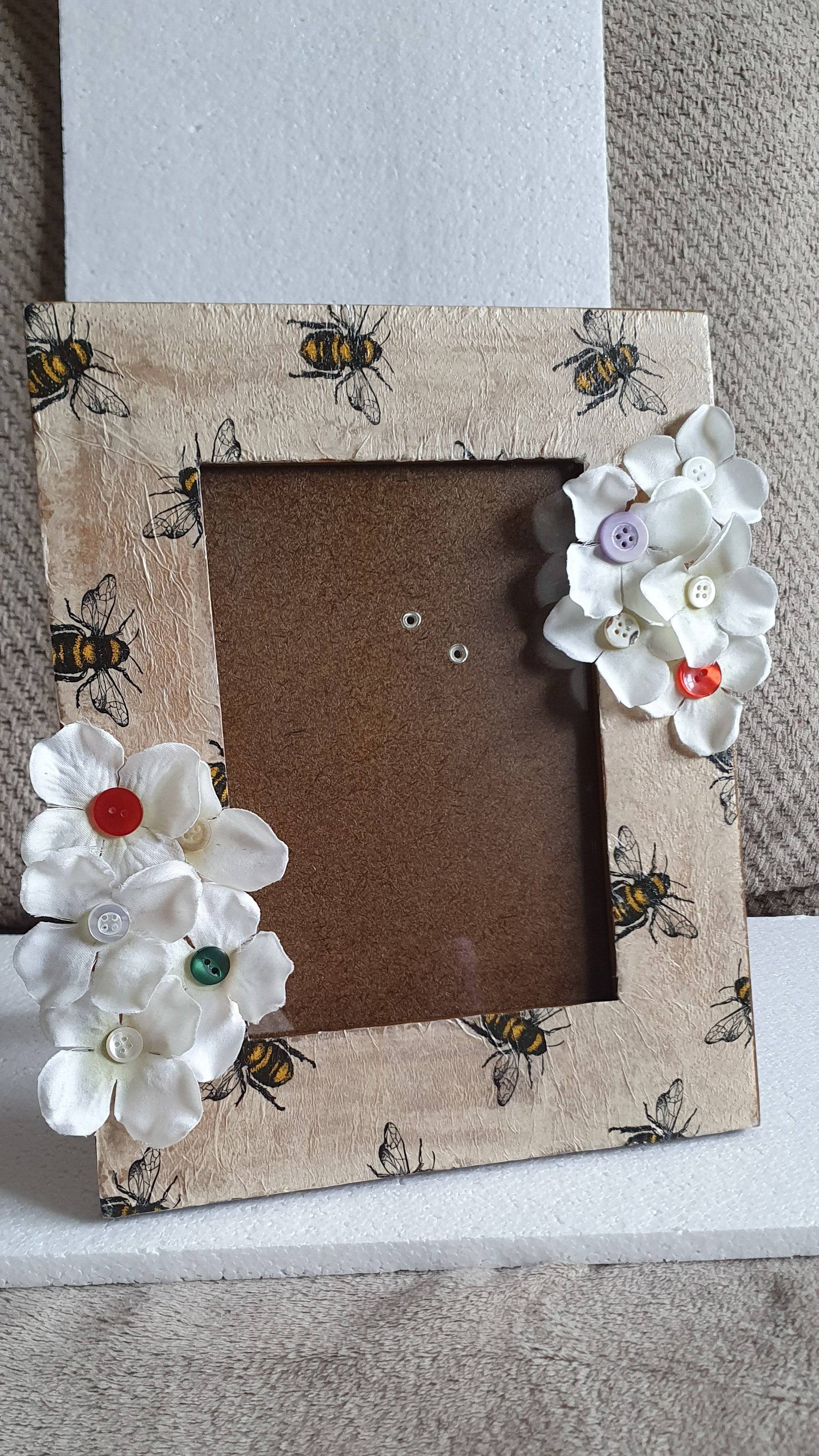 This wooden picture frame has been hand decorated by me using decoupage in my studio using paper designs and then varnish sealed. It is a unique design and size and cannot be repeated. The bee design has a distressed, parchment, aged effect, the flowers are fabric and the buttons are from the vintage button collection I have.