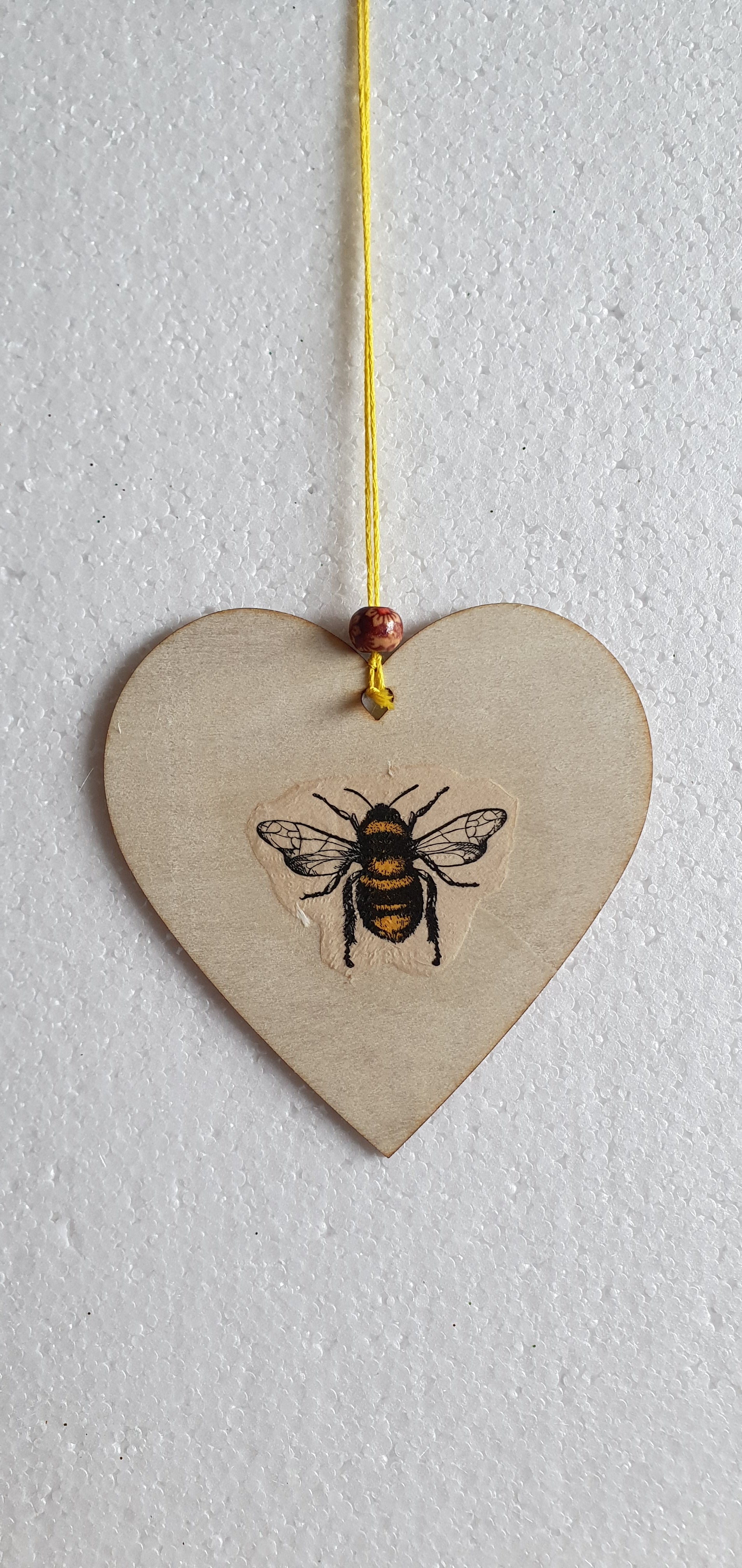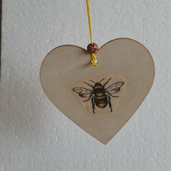 This window hanging is made from a wooden heart and has been hand decorated by me using decoupage in my studio using paper designs and then hung using embroidery thread and bead.