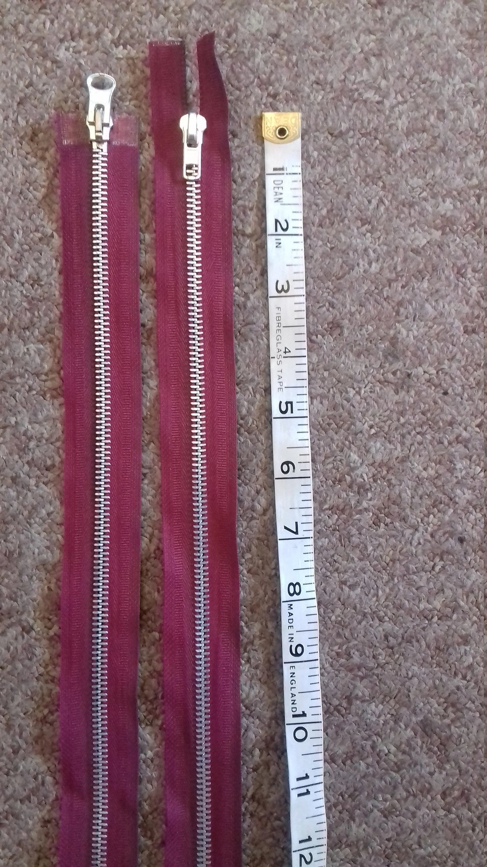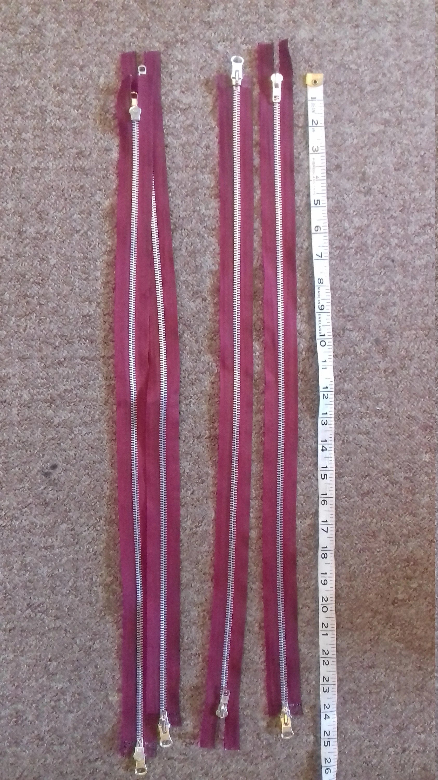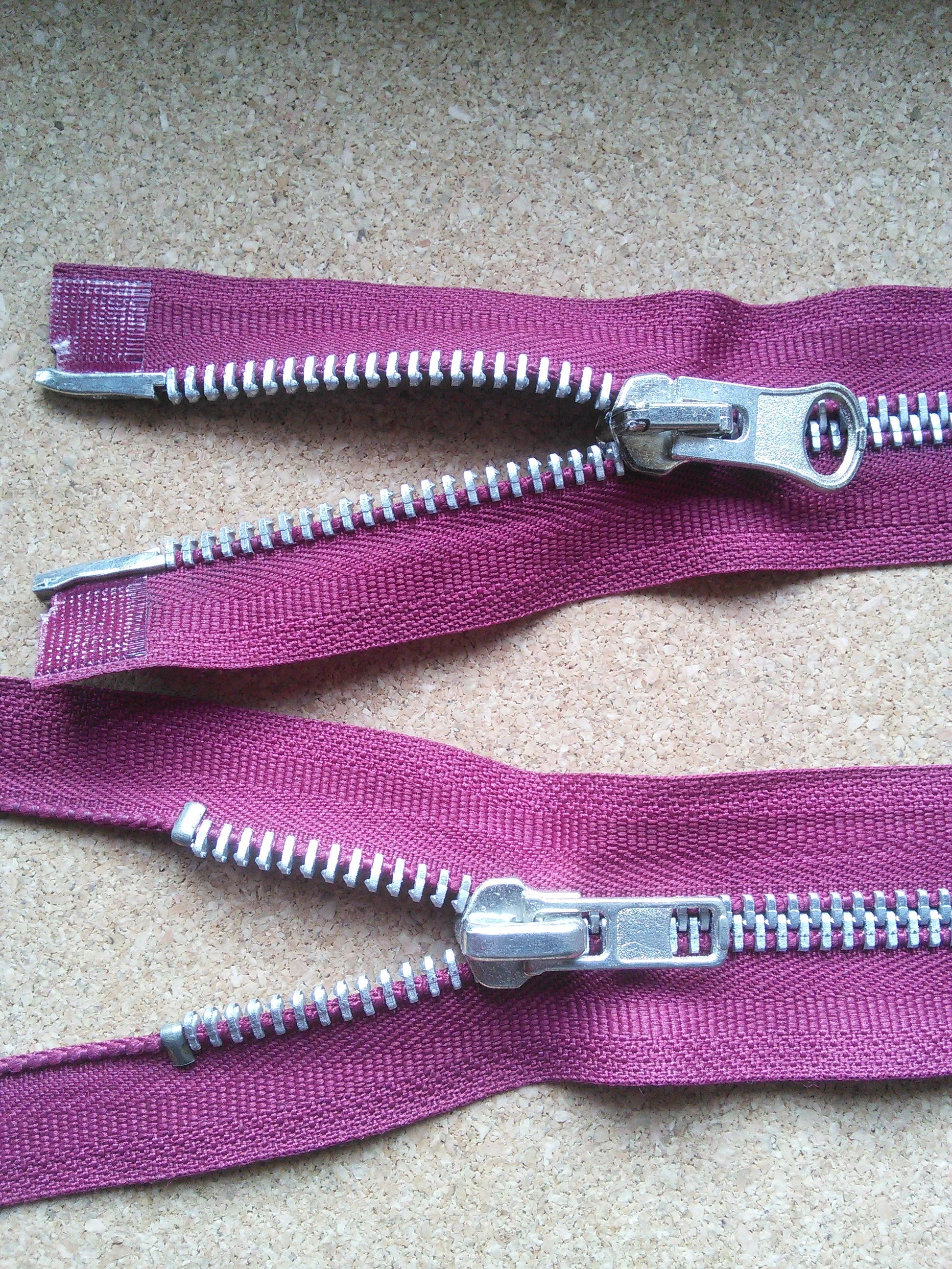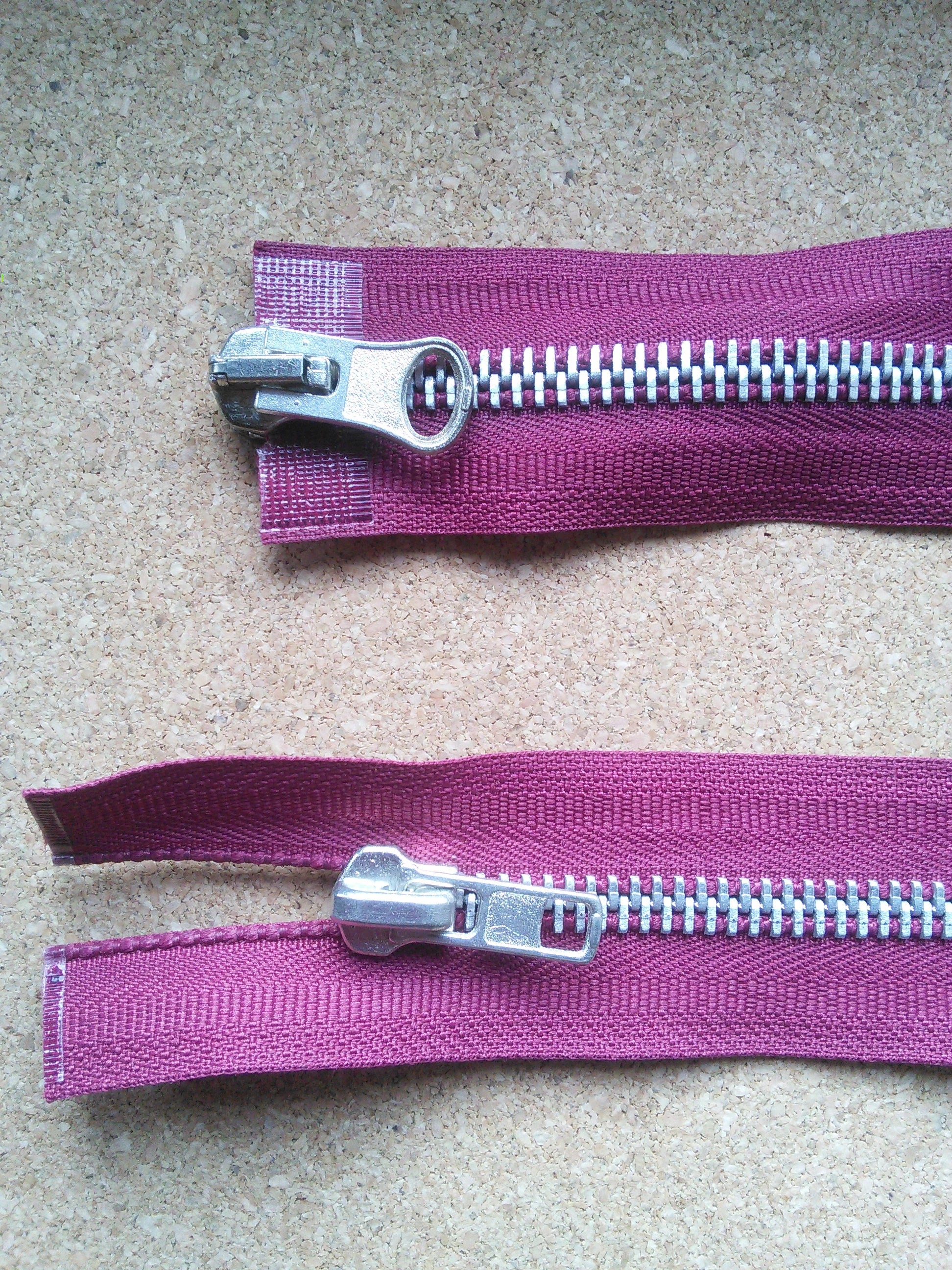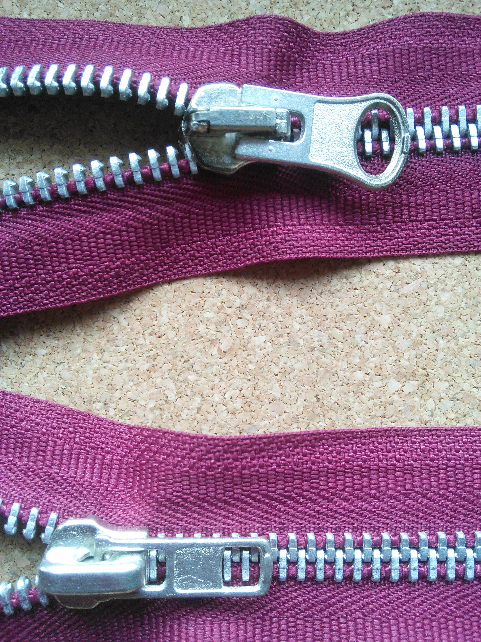 Deep raspberry red/burgundy zip chunky heavy silver metal 23.5 inch (59.5cm) double ended Size 8 with chunky metal teeth and different style metal zippers at either end.
