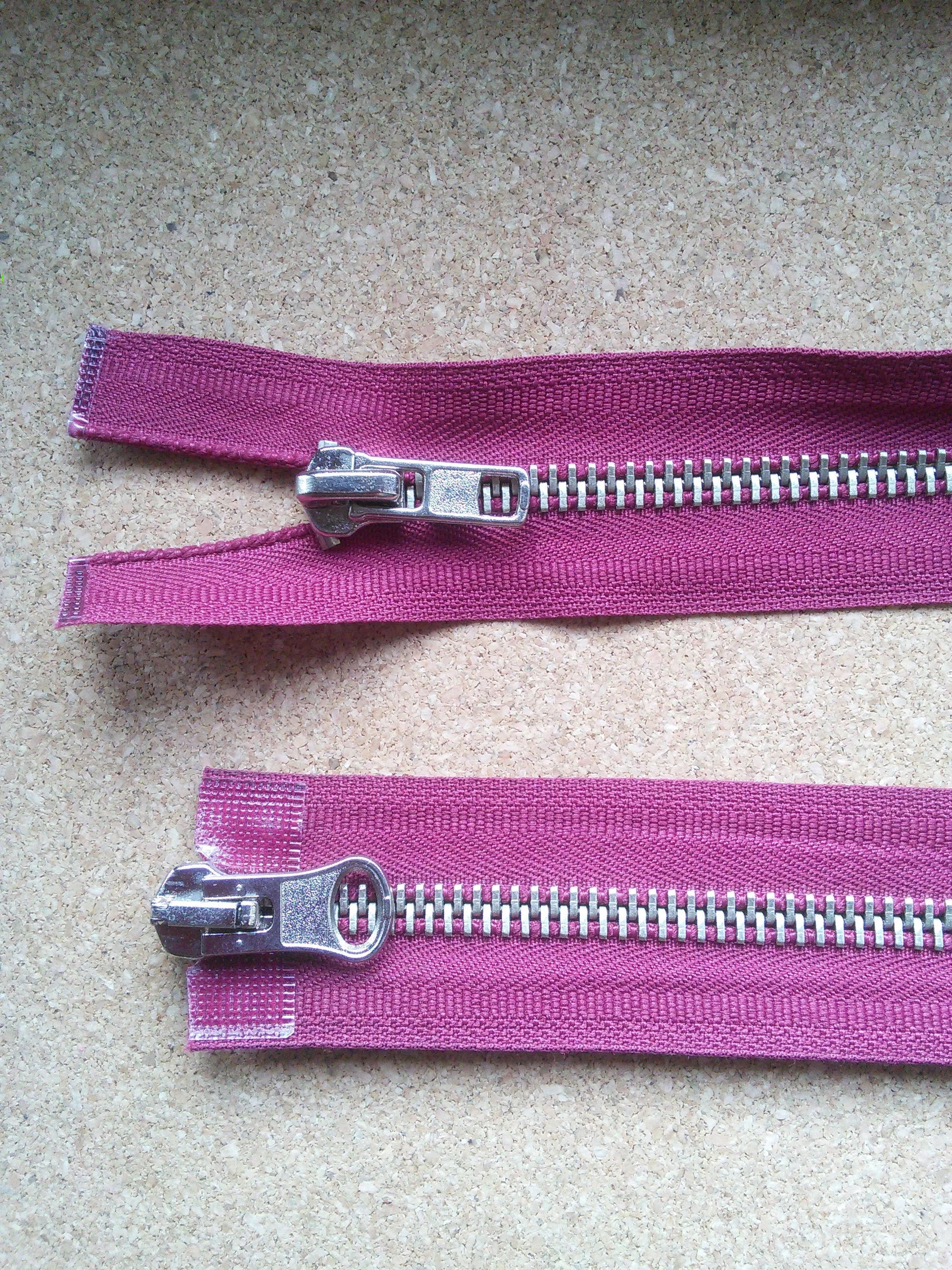 These zips are brand new. This Deep raspberry zip red/burgundy chunky heavy pale gold metal 23.5 inch (59.5cm) double ended Size 8 with chunky metal teeth and different style metal zippers at either end.