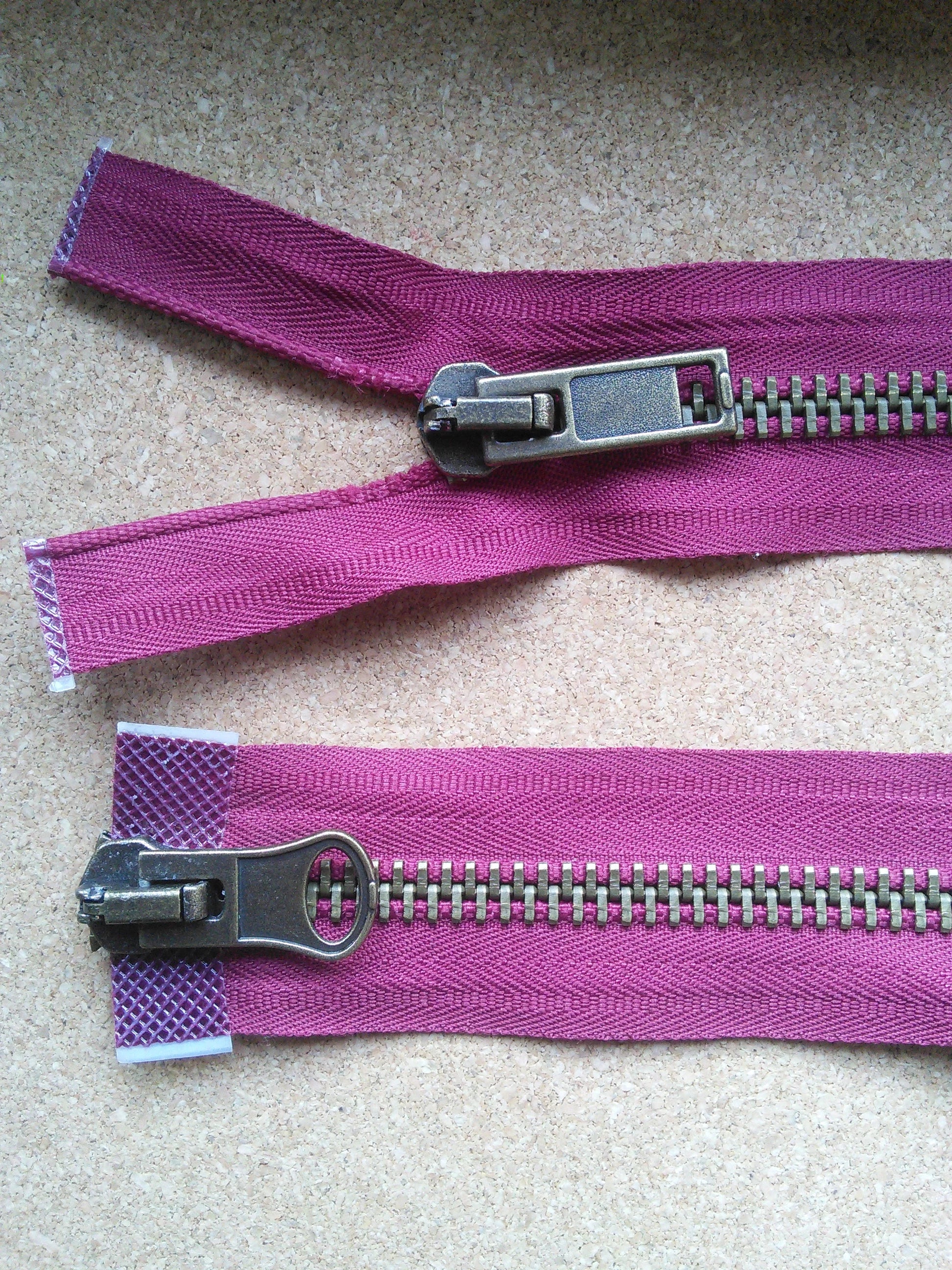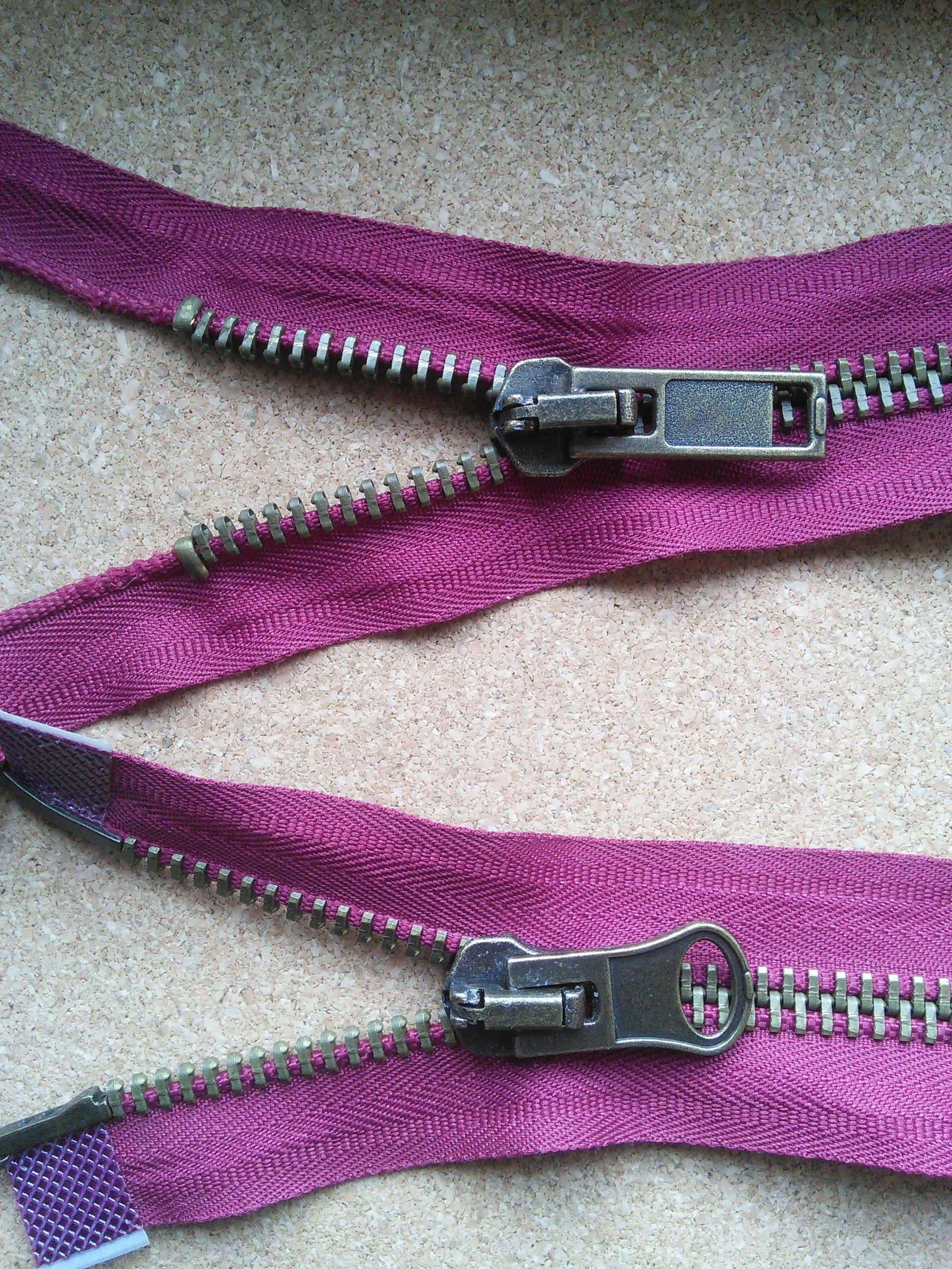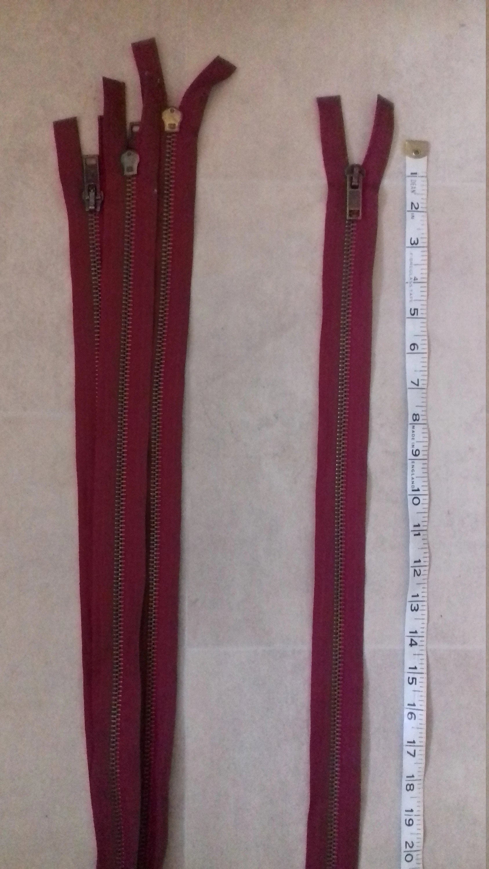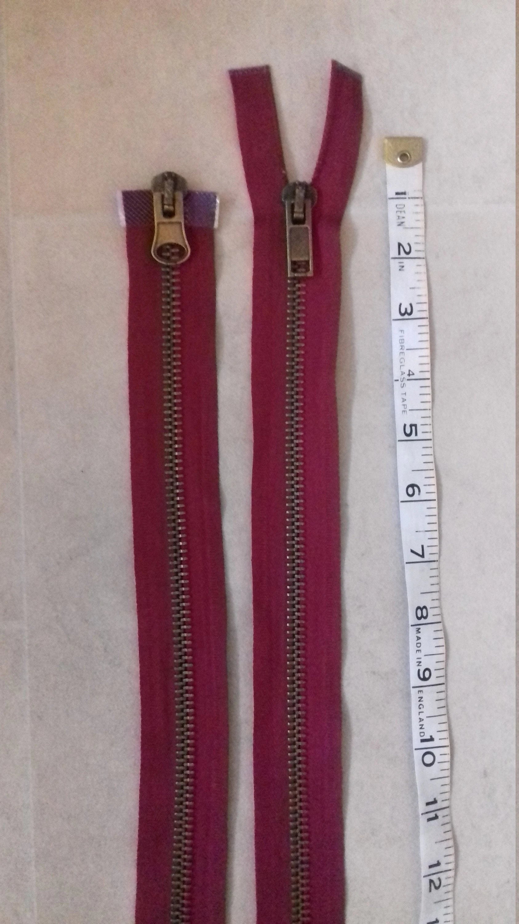 Deep raspberry zip red/burgundy very chunky heavy antique brass metal 23.5 inch (59.5cm) double ended Size 8 with chunky metal teeth and different style metal zippers at either end.