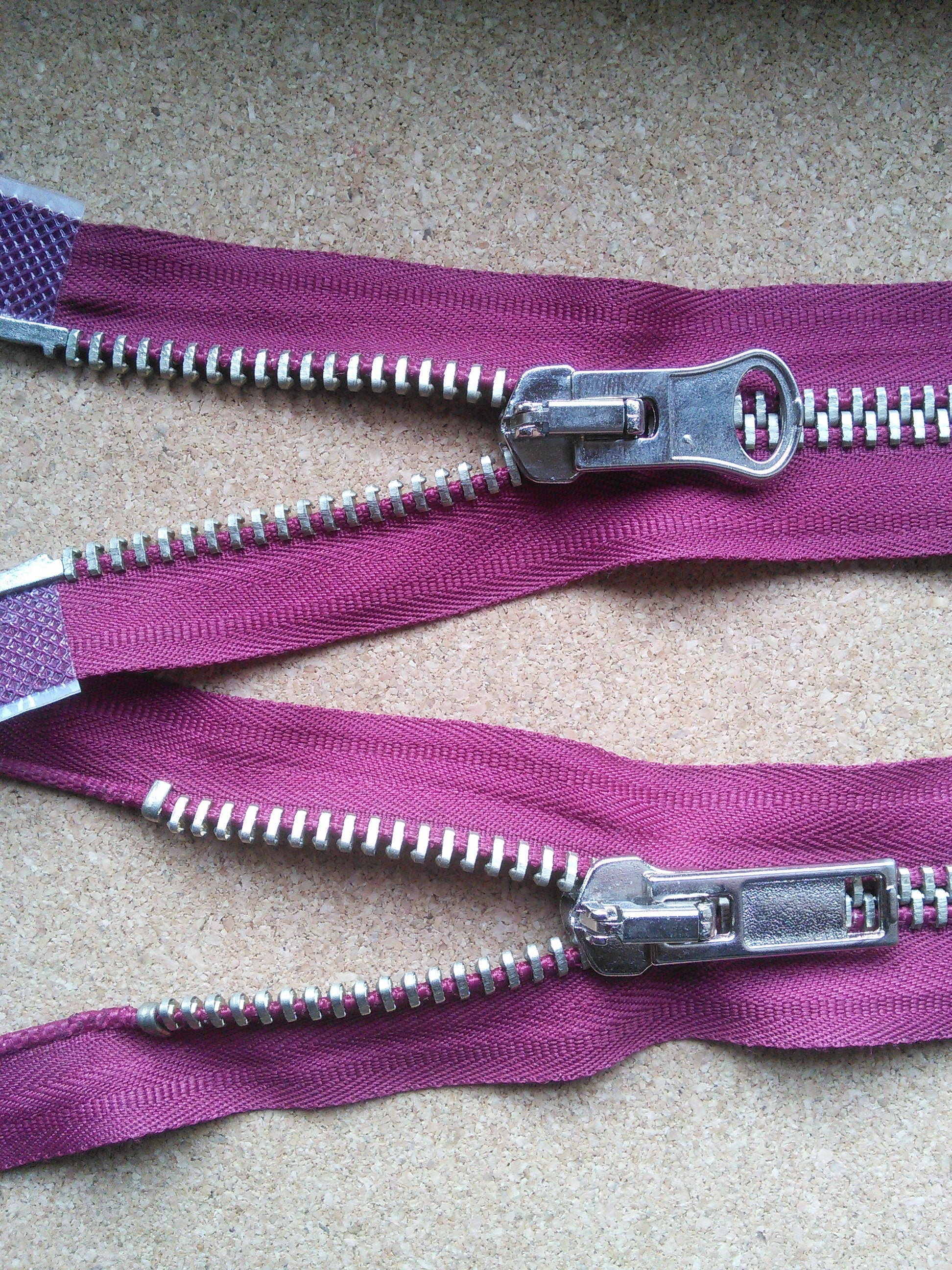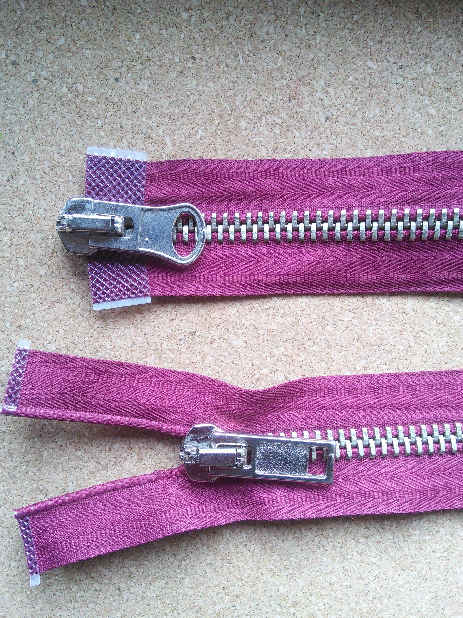 Deep raspberry zip red/burgundy very chunky heavy pale gold metal 23.5 inch (59.5cm) double ended Size 5 with chunky metal teeth and different style metal zippers at either end.