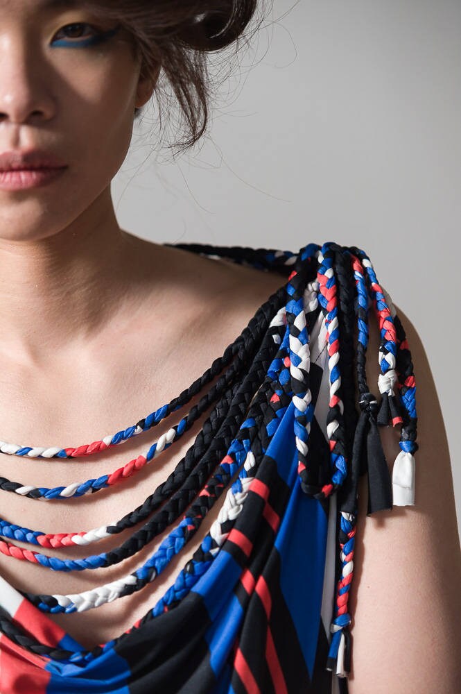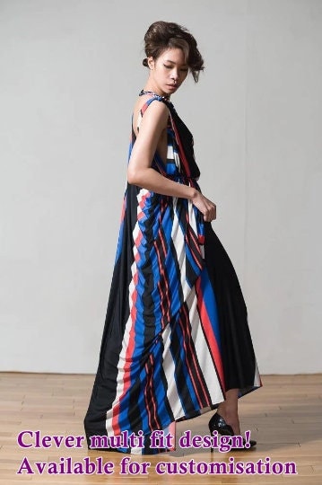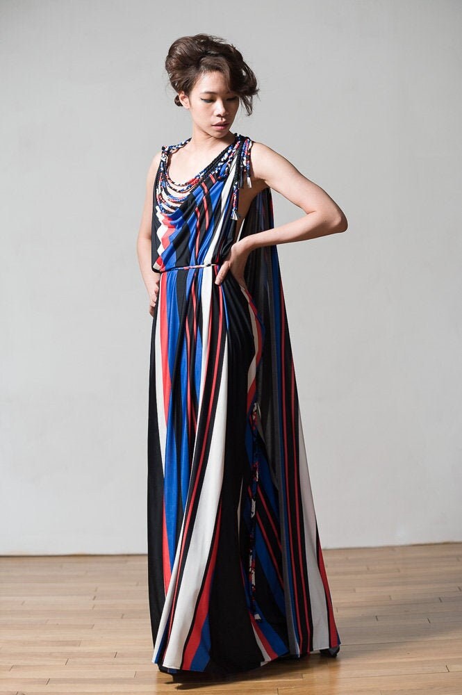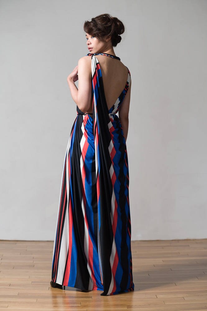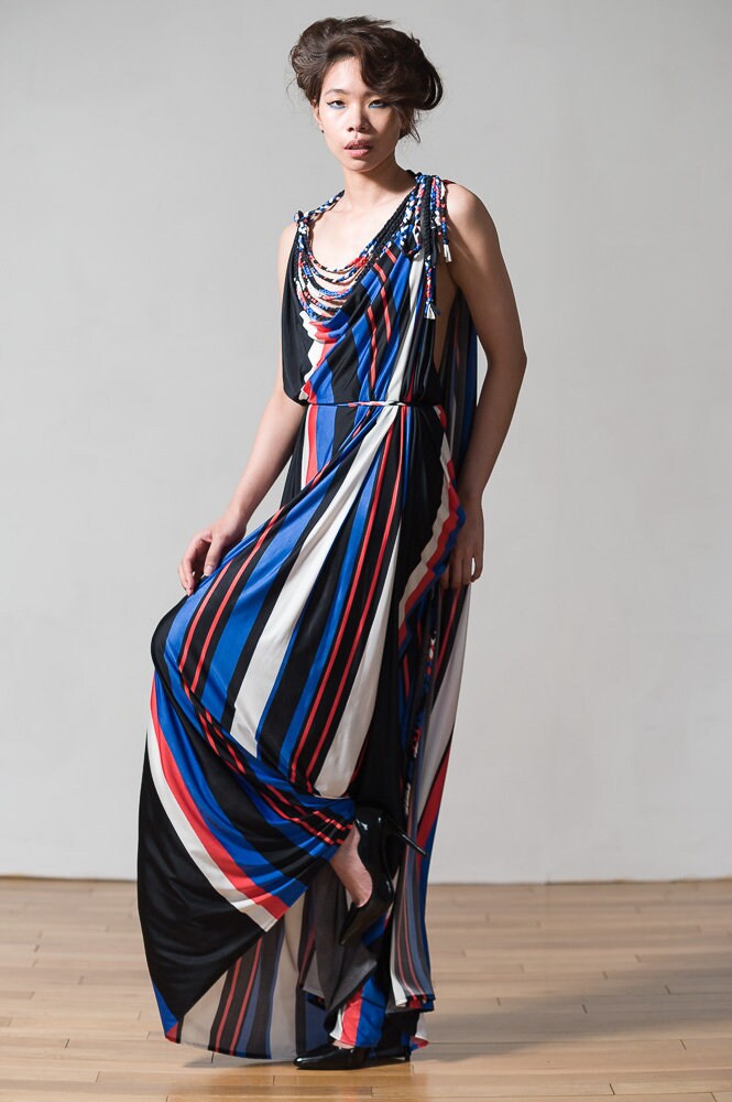 This gorgeous handmade striped backless drape dress hangs beautifully in a mid-weight silky stretch fabric.