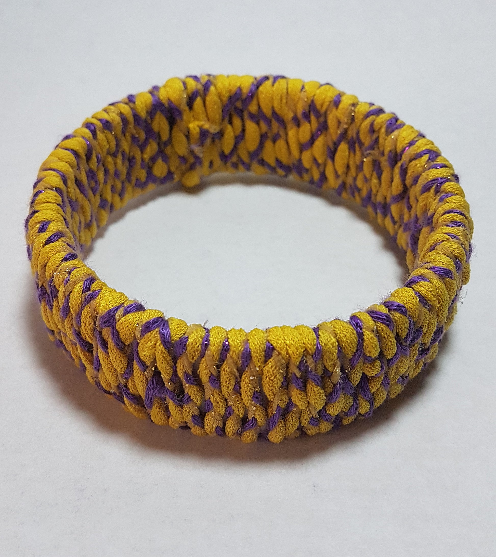 These bracelets are a solid slide on base wrapped in braided fabric. They are made without clasps or fasteners. This one has a depth of 2.75cm and a diameter of 7cm.