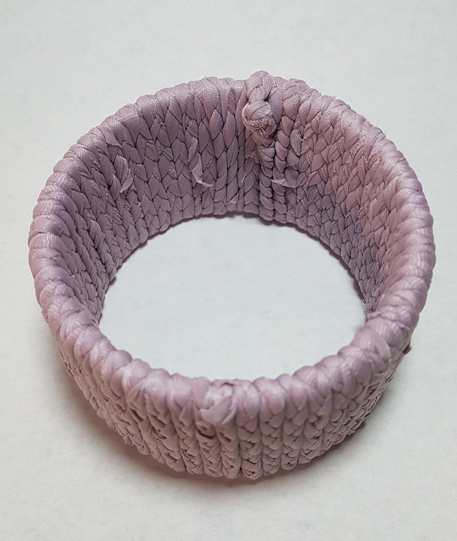 These bracelets are a solid slide on base wrapped in braided fabric. They are made without clasps or fasteners. This one has a depth of 5.5cm and an inside diameter of 7cm.