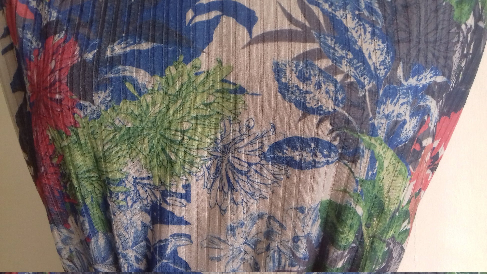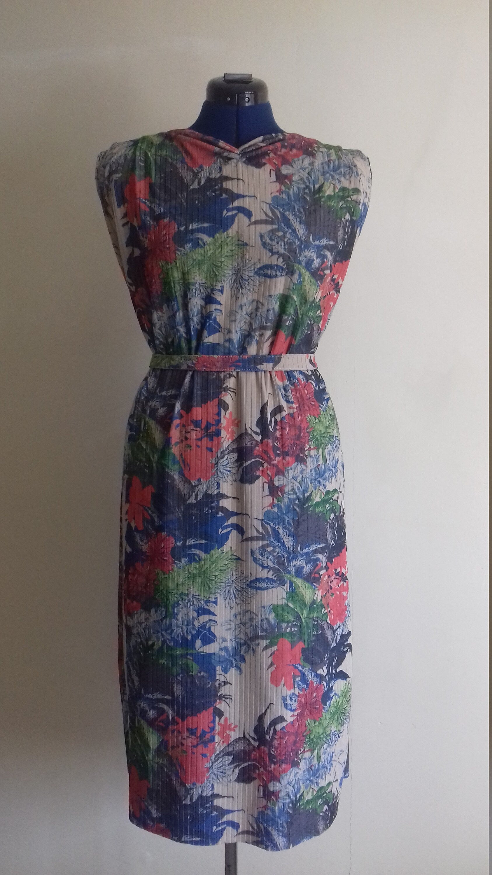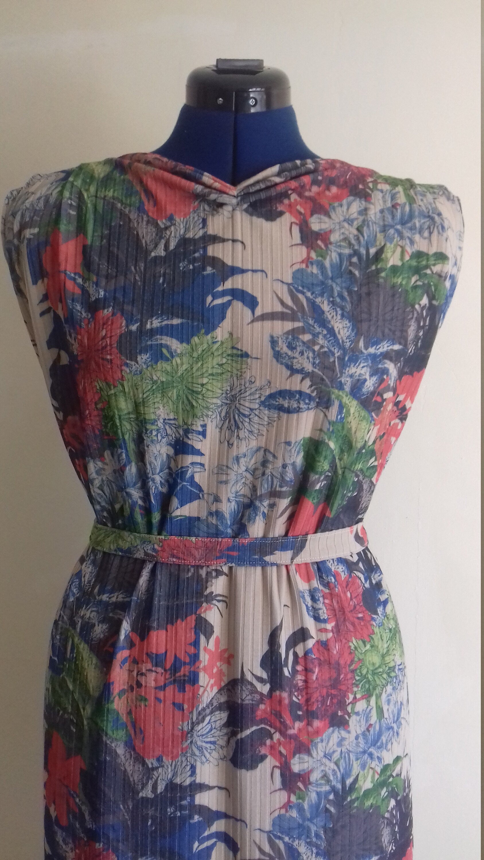 This is a gorgeous one of a kind floral patterned dress in green, blue and red, on a beige background. It is made from heavyweight ribbed jersey and it has a simple design, flattering on any body shape.