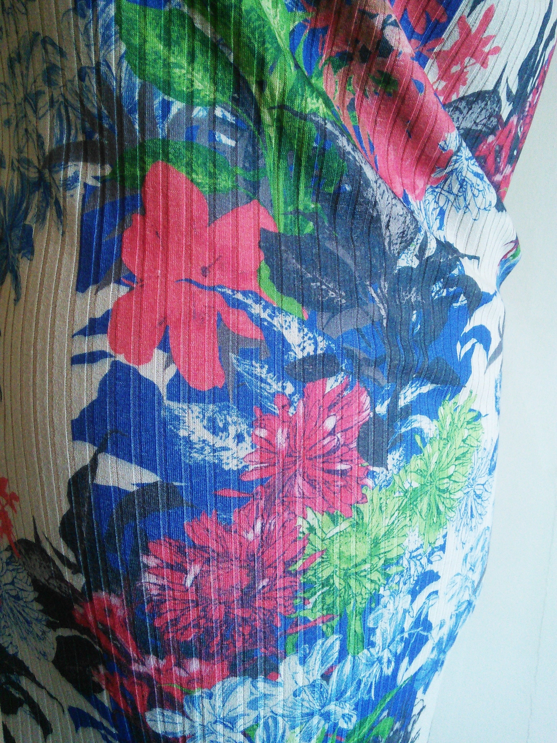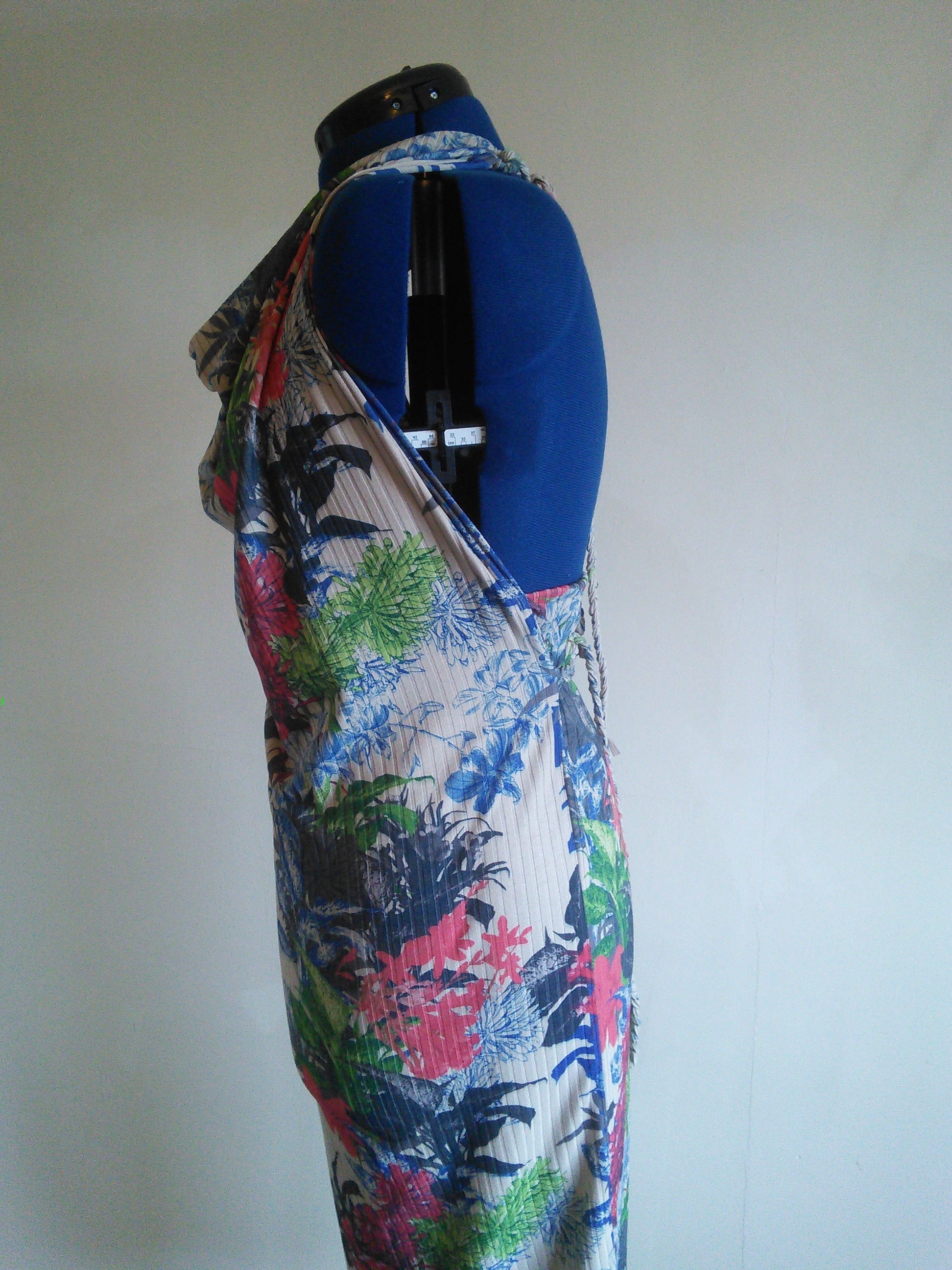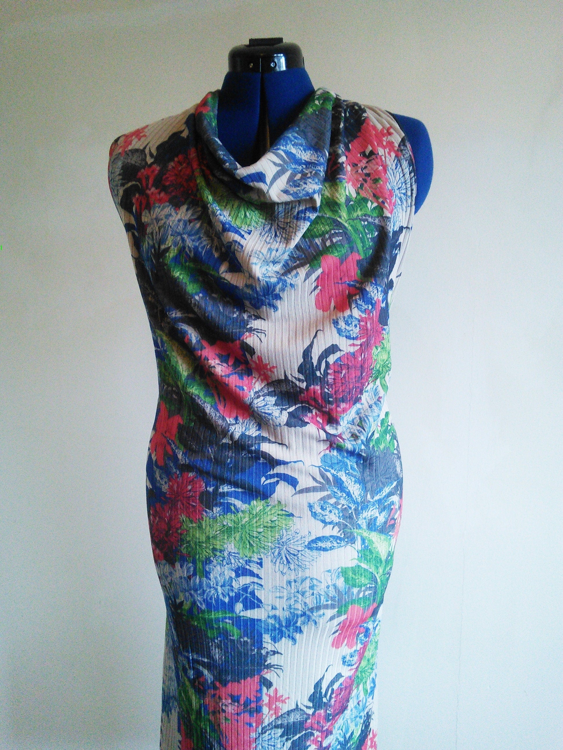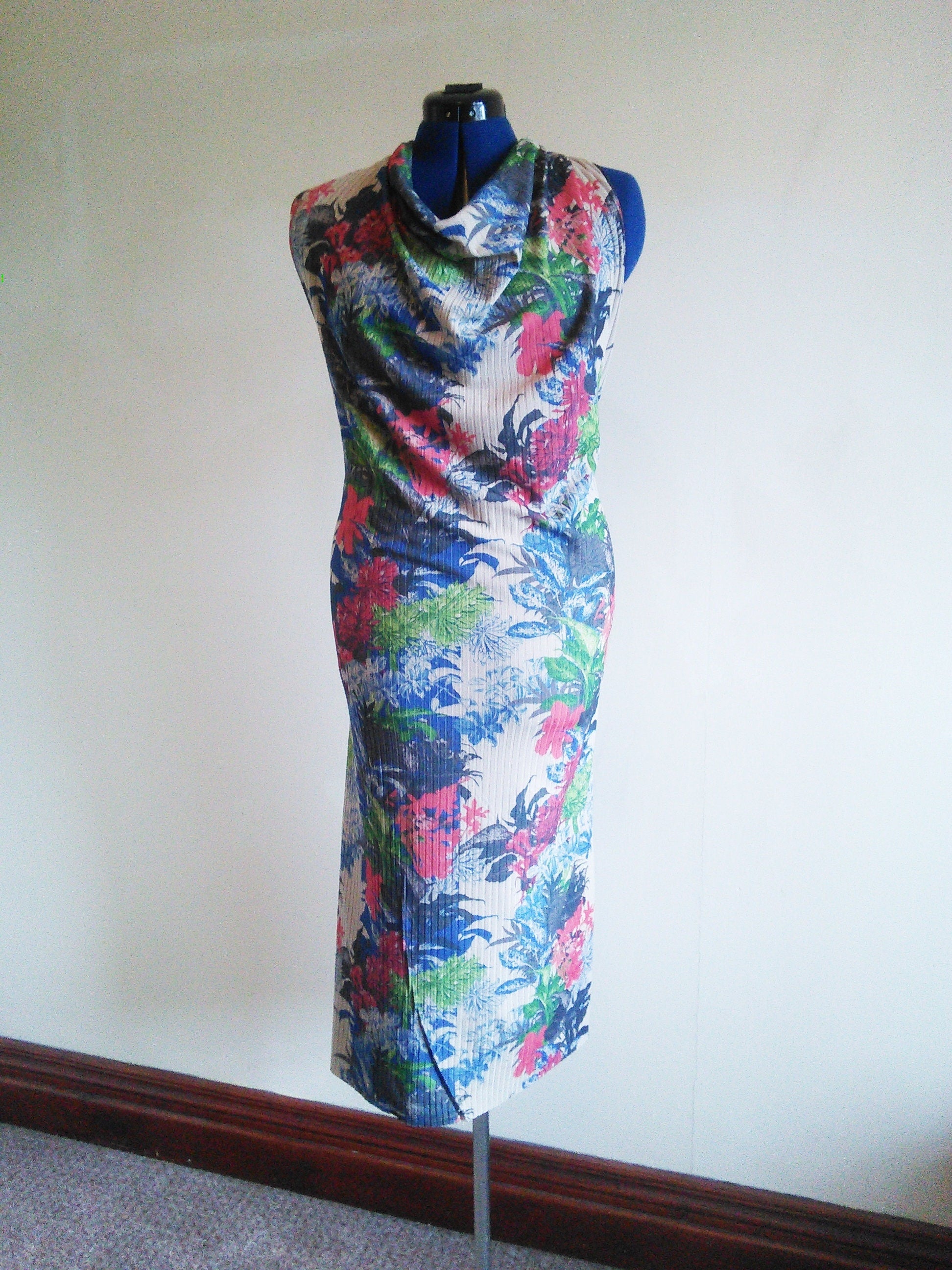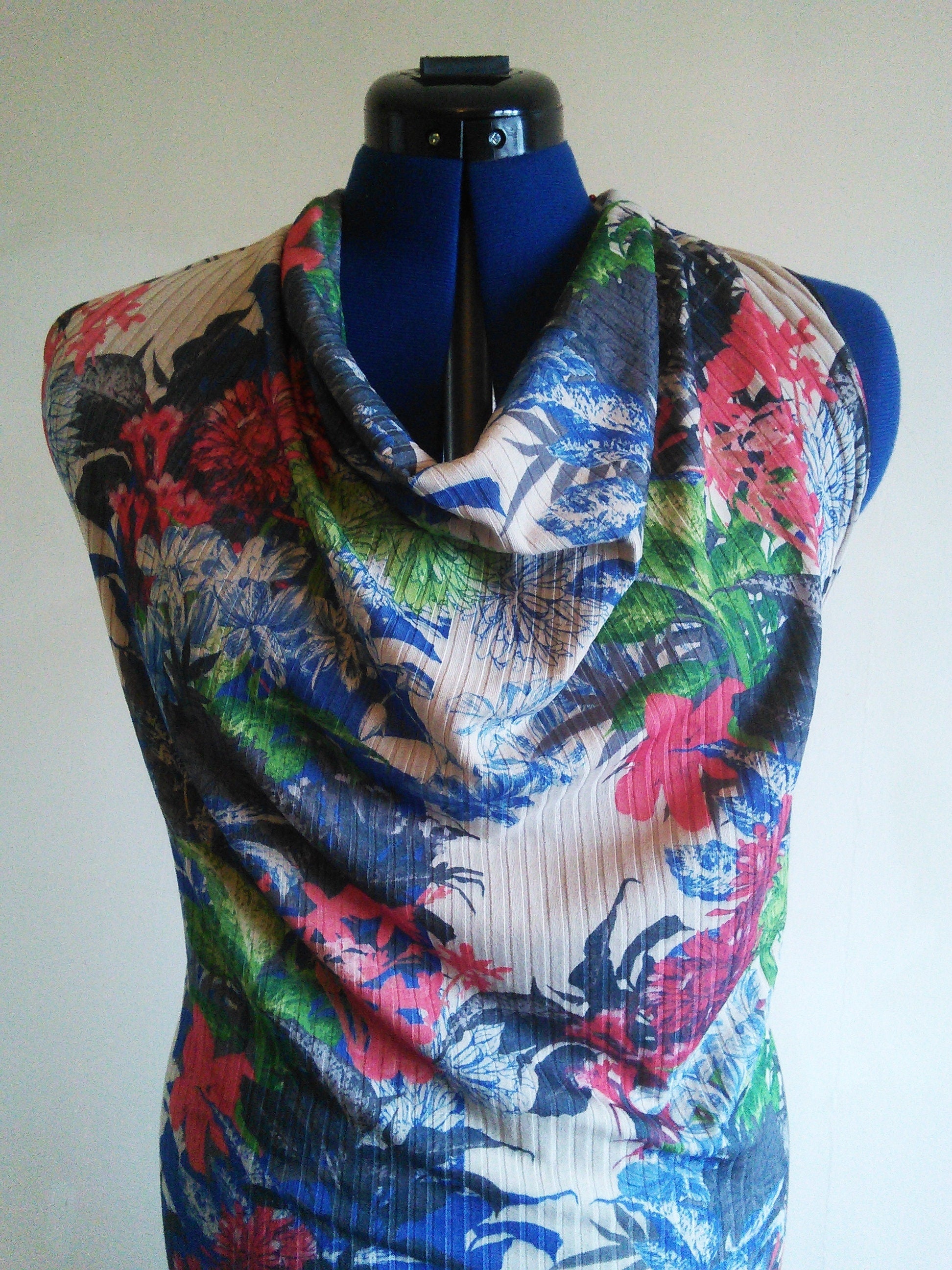This is a gorgeous cowl halterneck floral patterned dress in green, blue and red, on a beige background. It is made from heavyweight ribbed jersey and has a simple design, flattering on any body shape. The cowl front is perfect for anyone who likes a more relaxed look or is self-conscious about their bust or tummy area as it is not tightly fitted at the front.