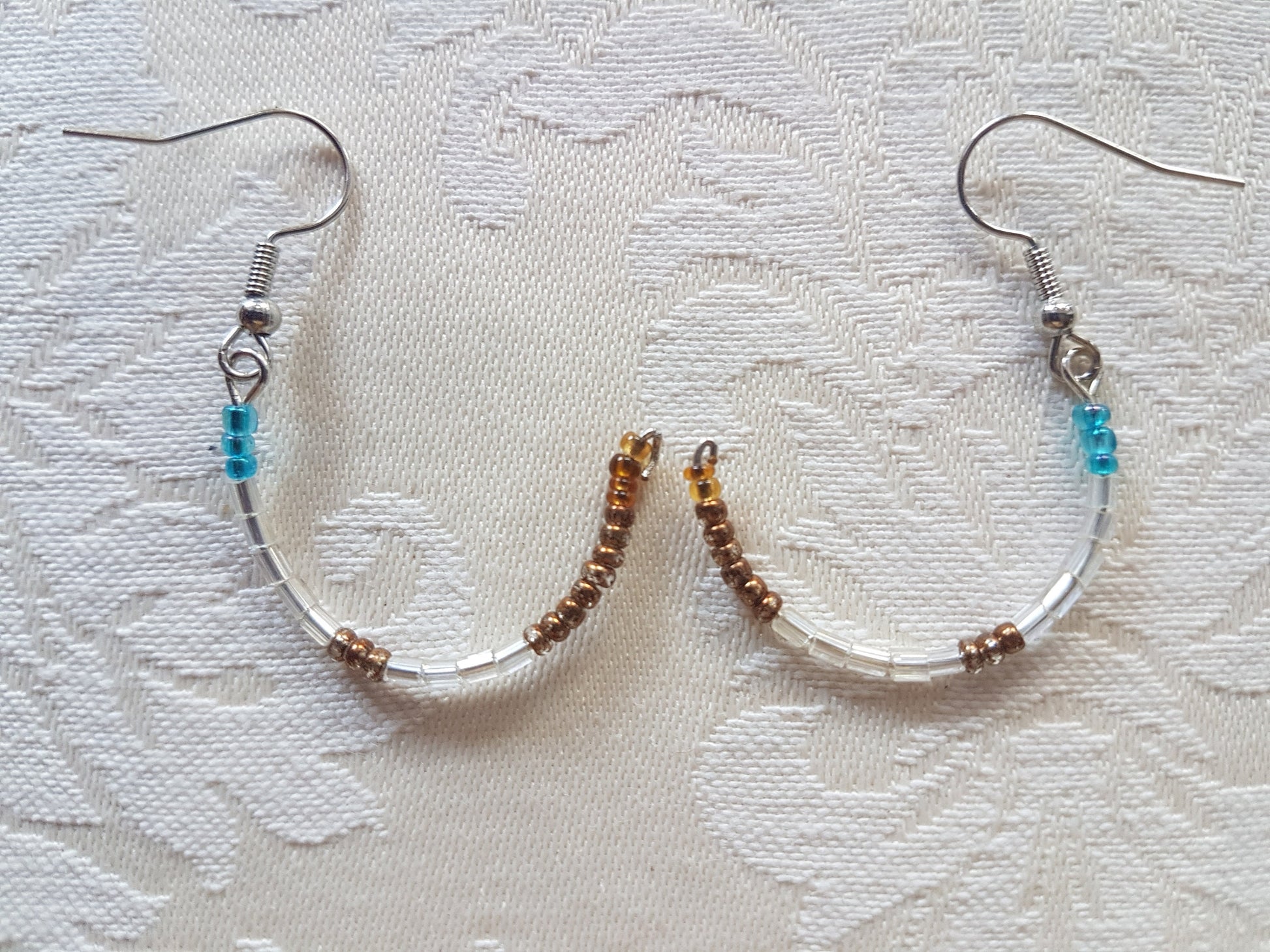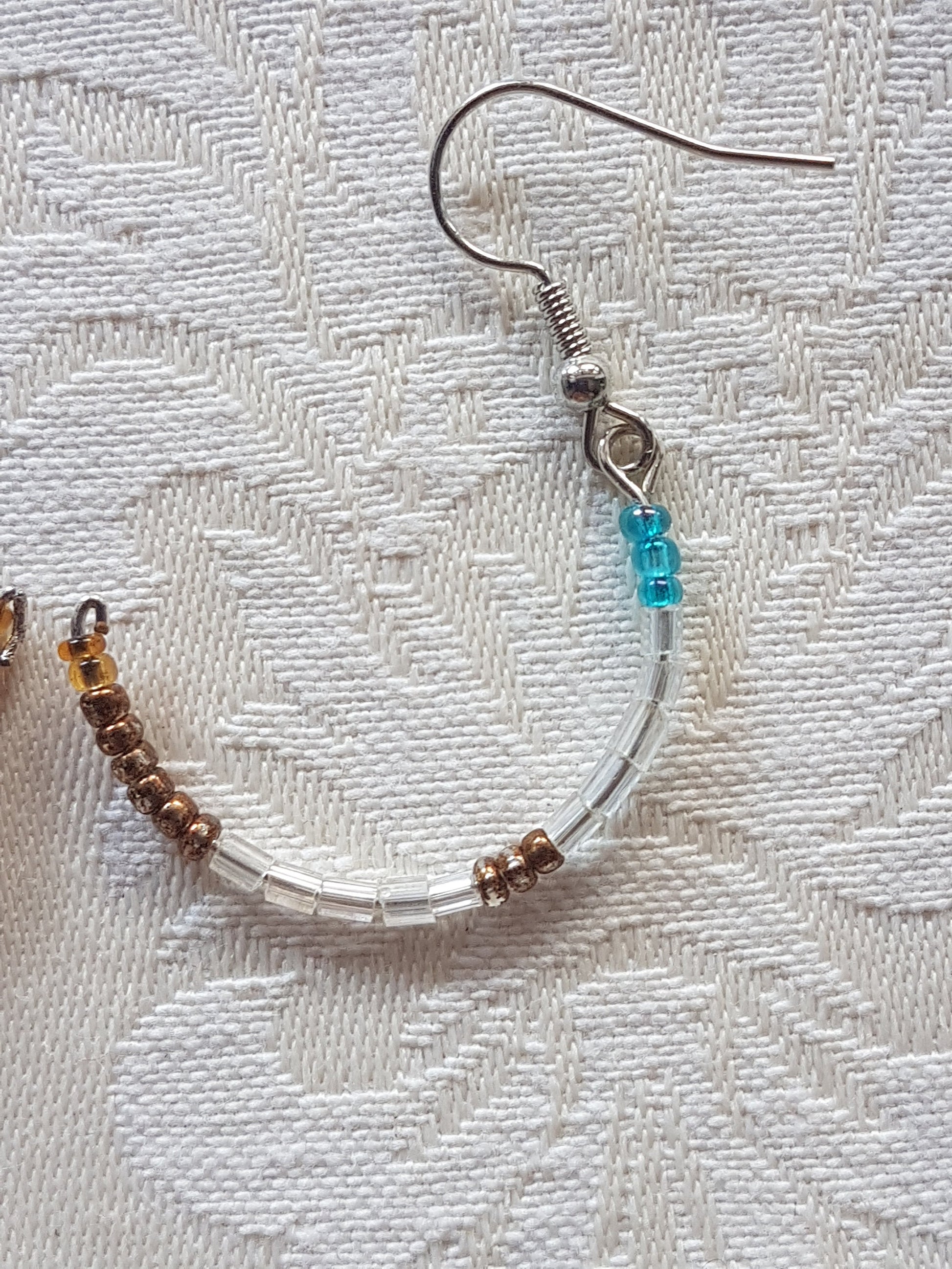 This pair have a length approx 2 inches and comprise a silver effect earring with tiny clear, blue and gold seed beads on a crescent shaped base.