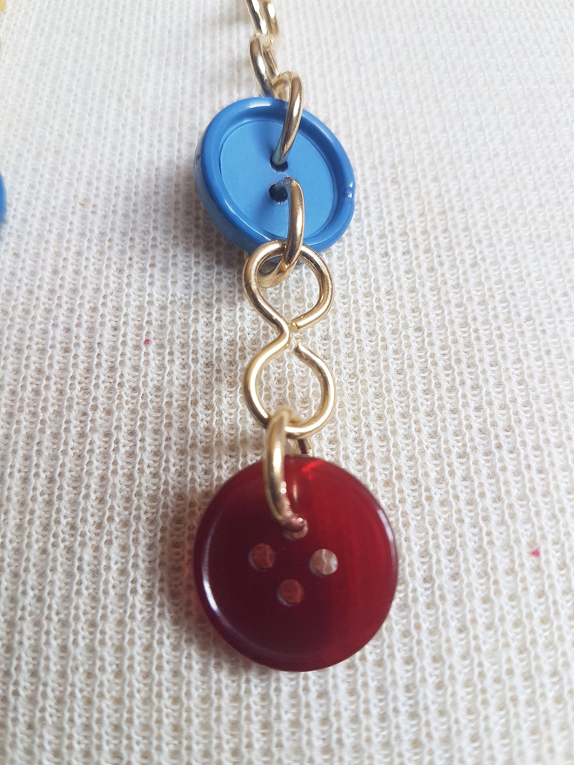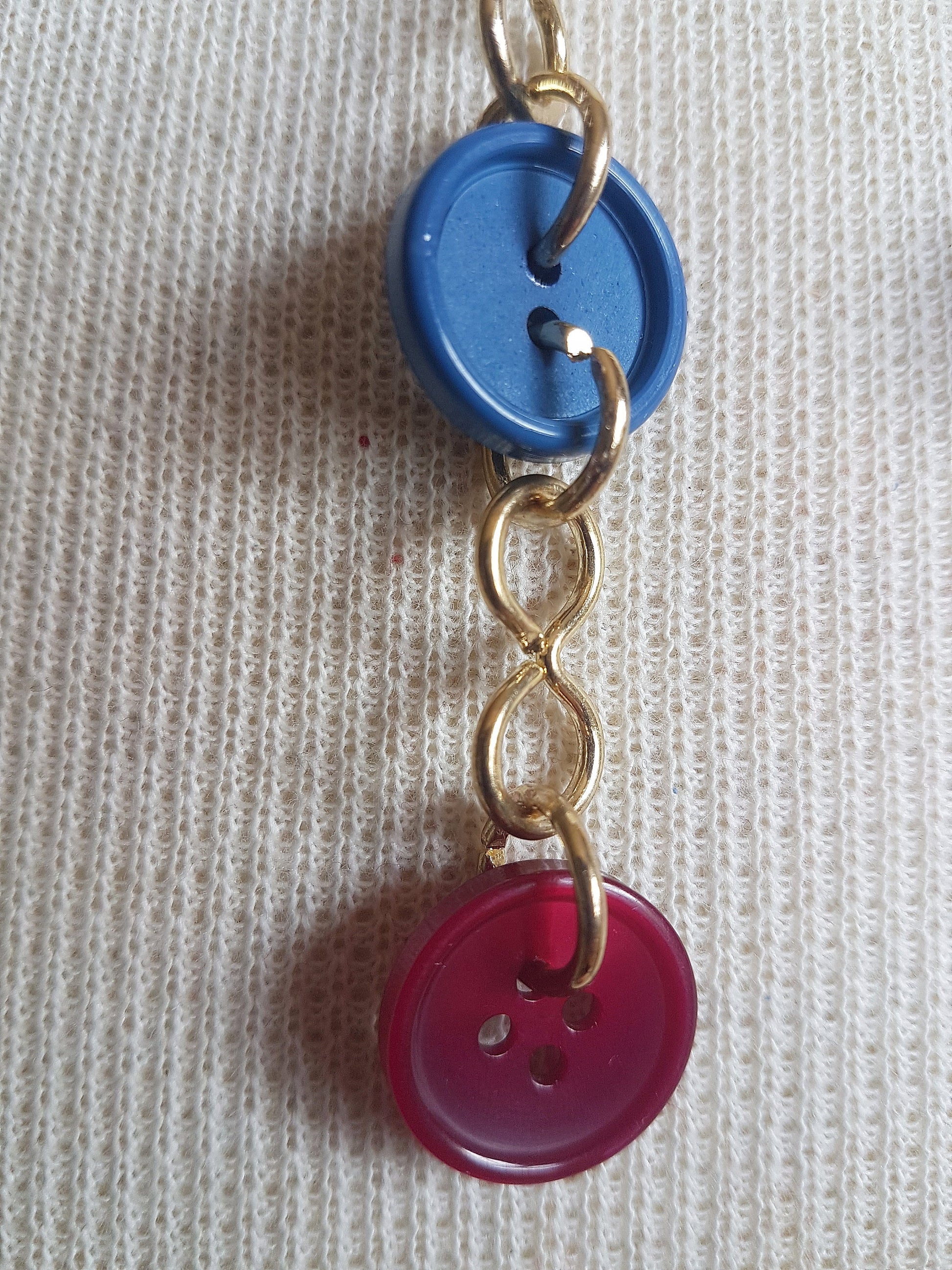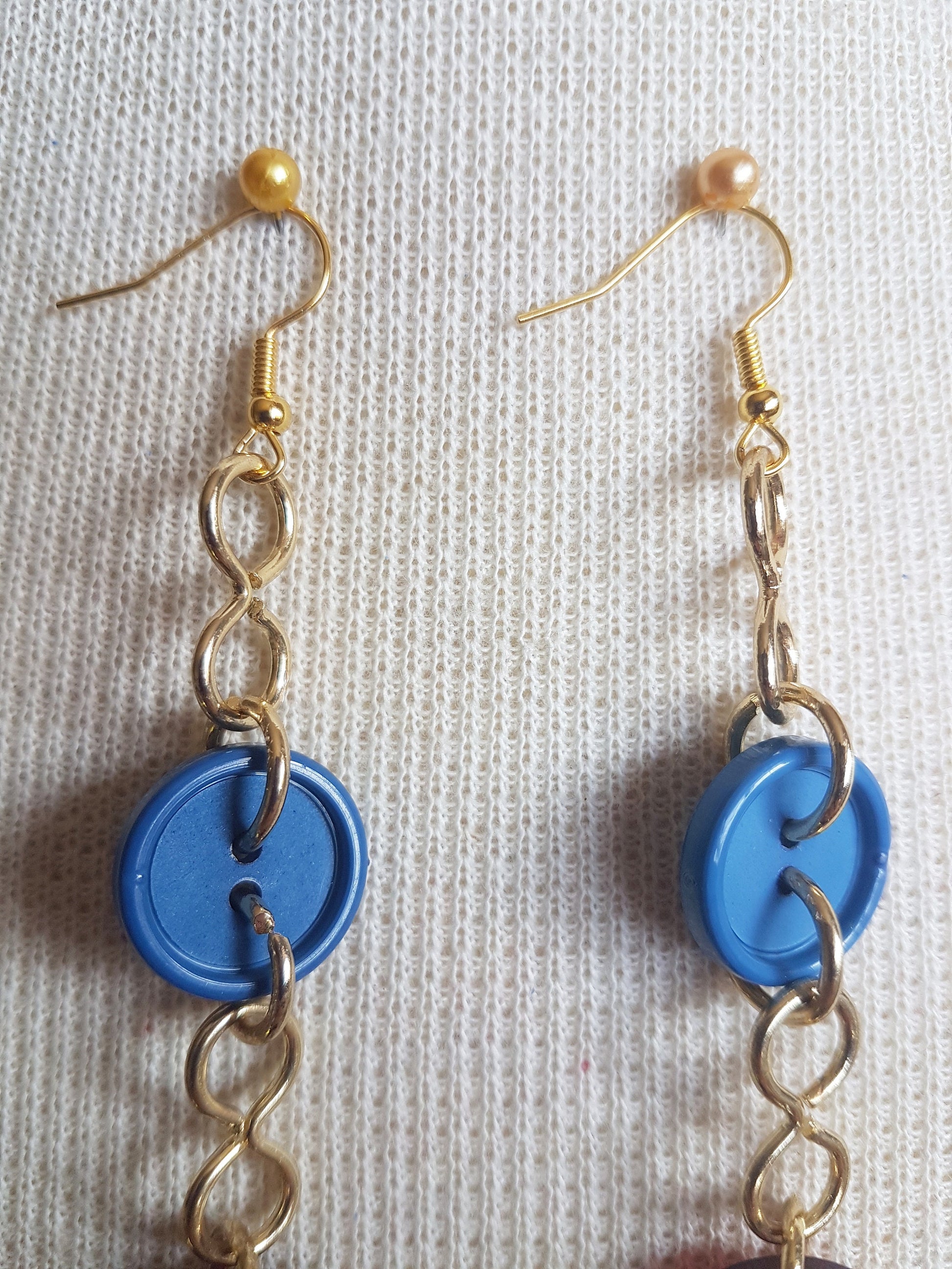 This pair have a length approx 3.5 inches and comprise a gold earring with gold chain parts and blue and red vintage buttons.
