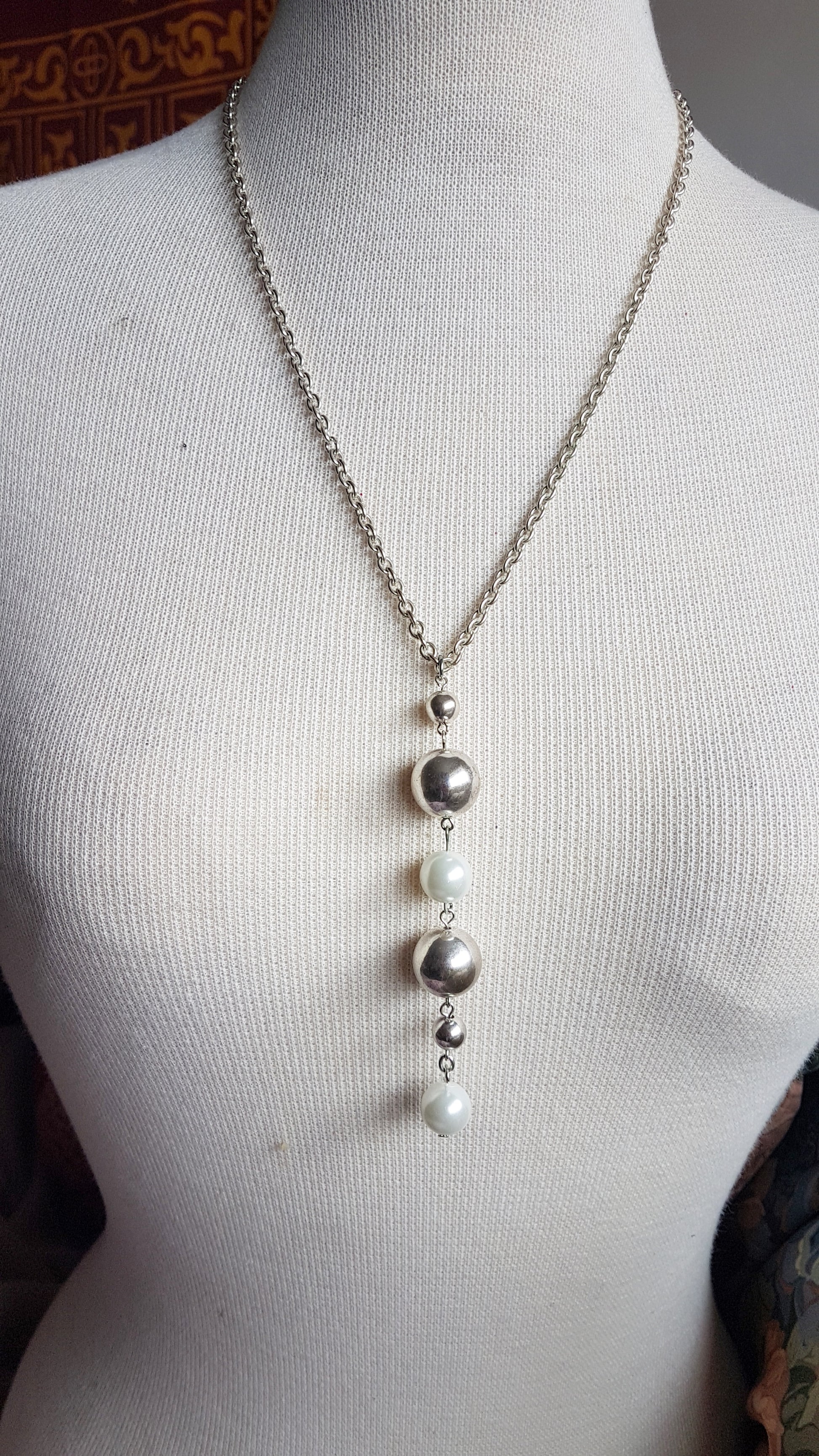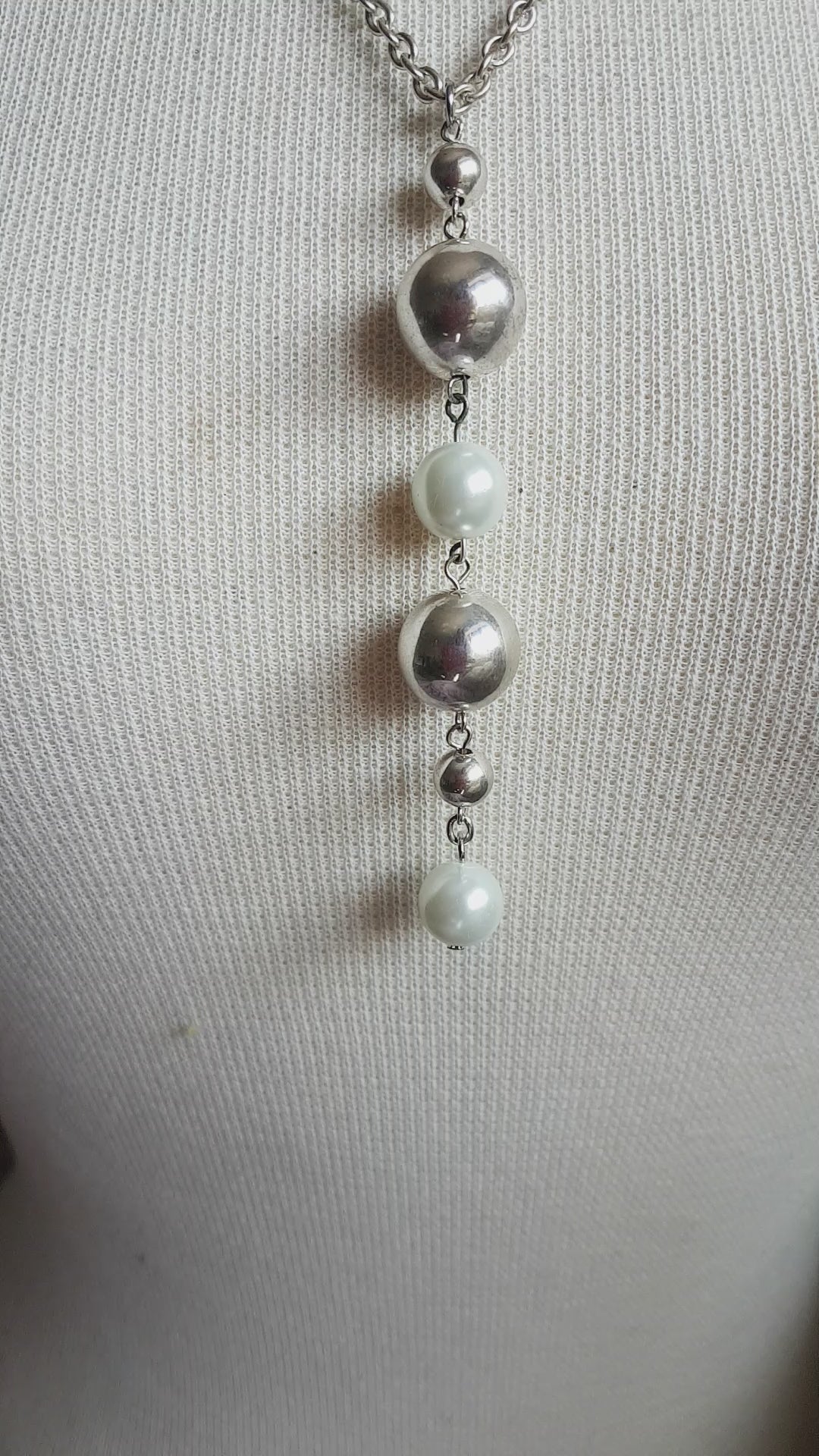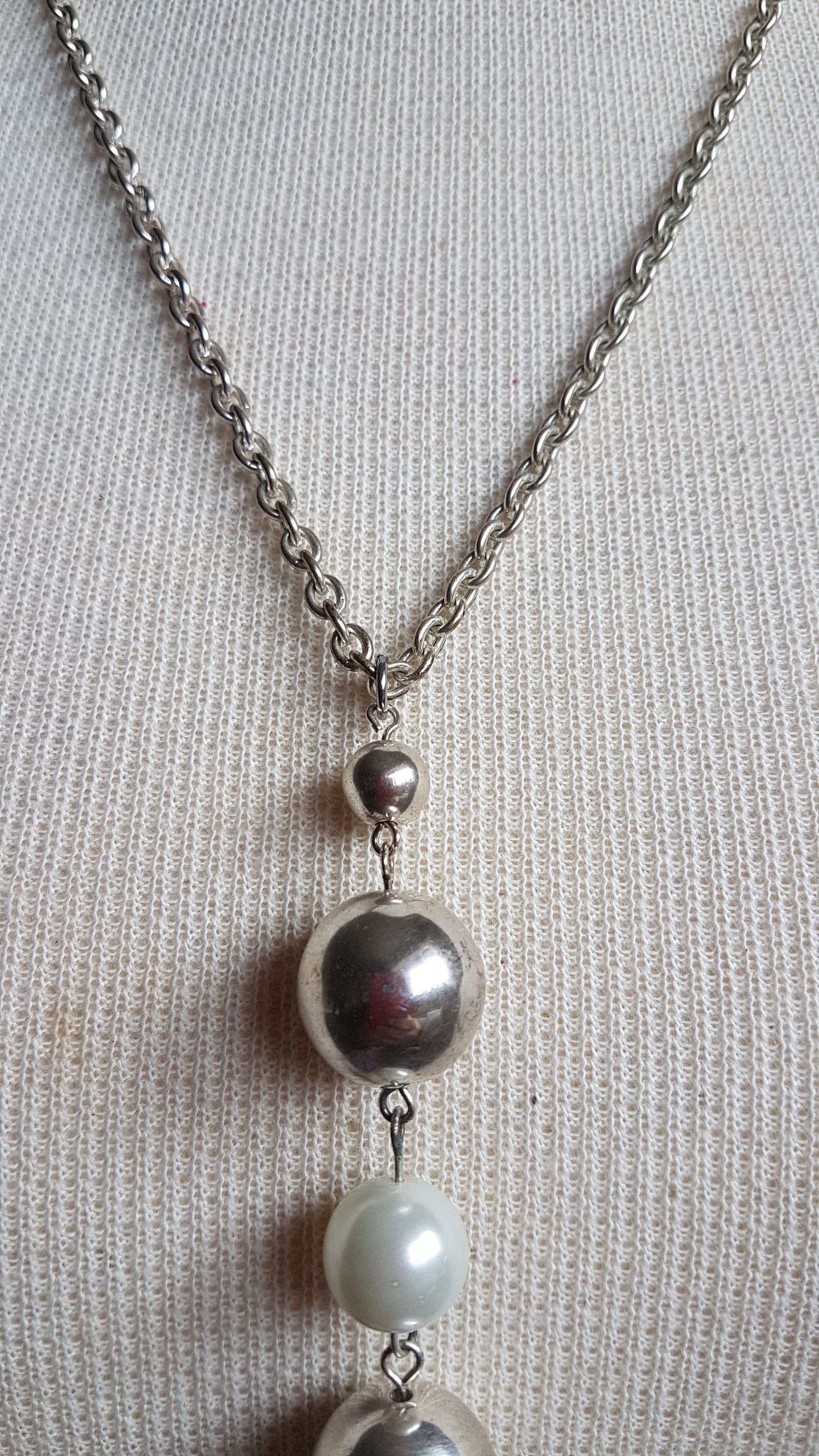 This necklace is 21.5 inches long and has an extender chain of 3 inches. The silver and pearl ball pendant is an additional 4 inches long.