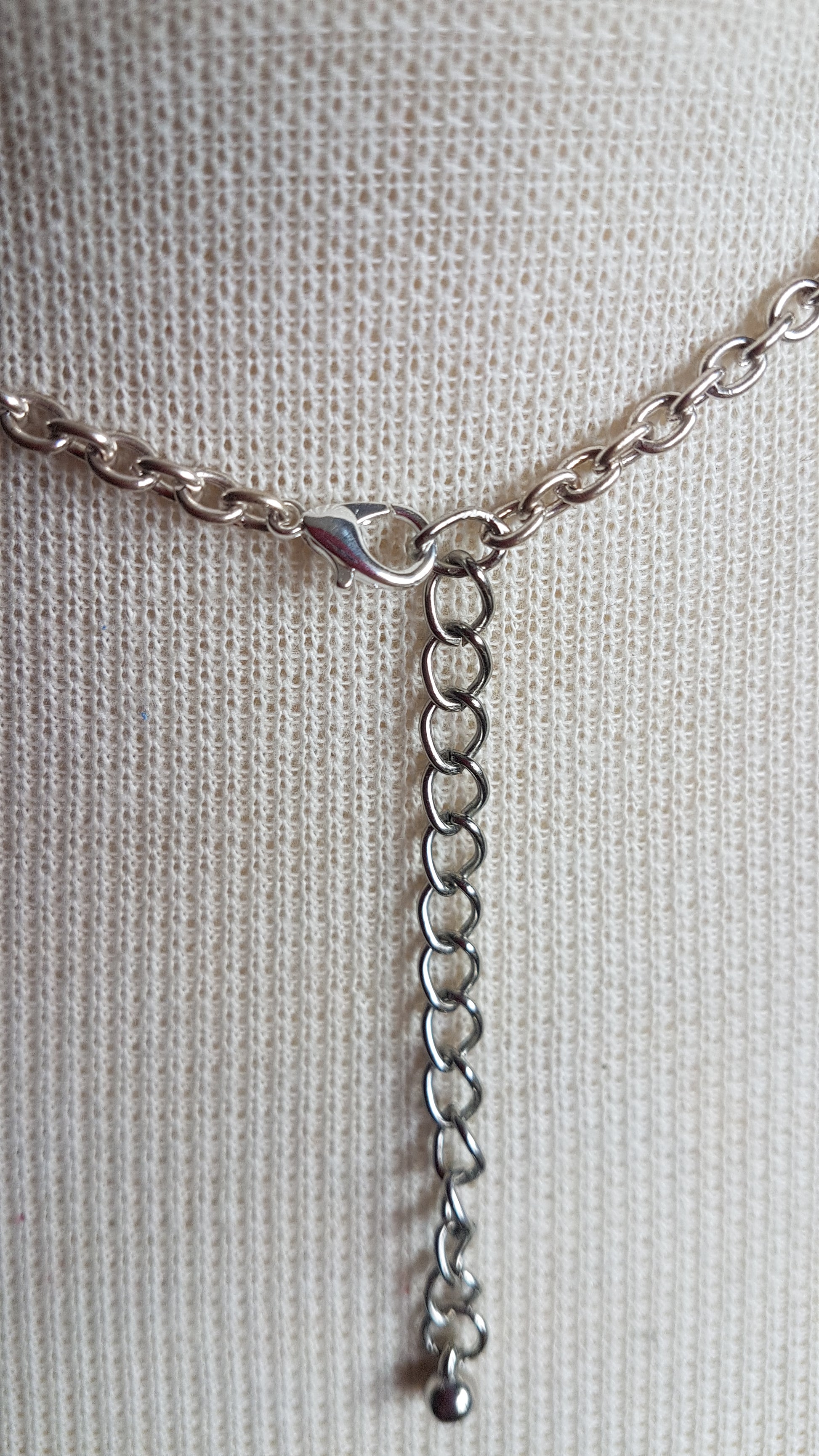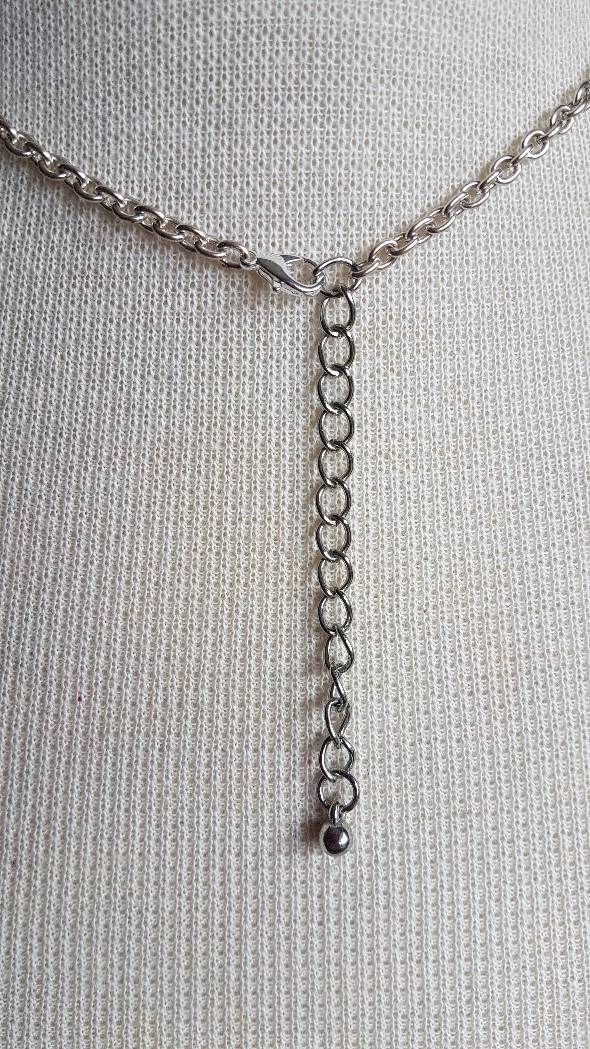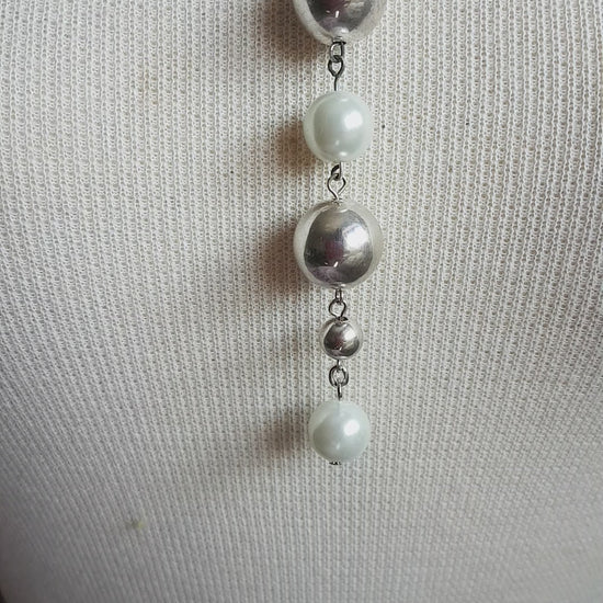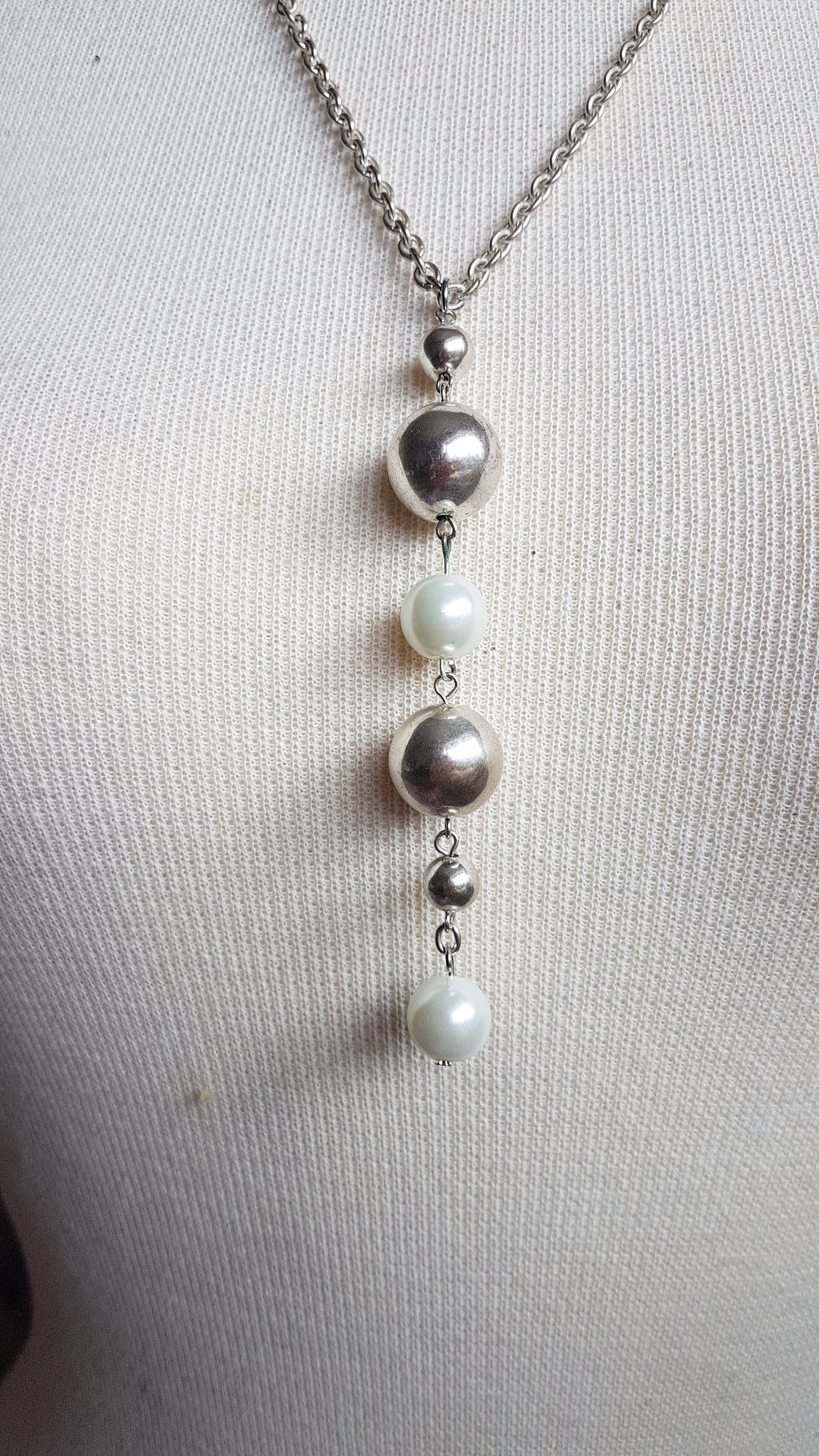 This necklace is 21.5 inches long and has an extender chain of 3 inches. The silver and pearl ball pendant is an additional 4 inches long.