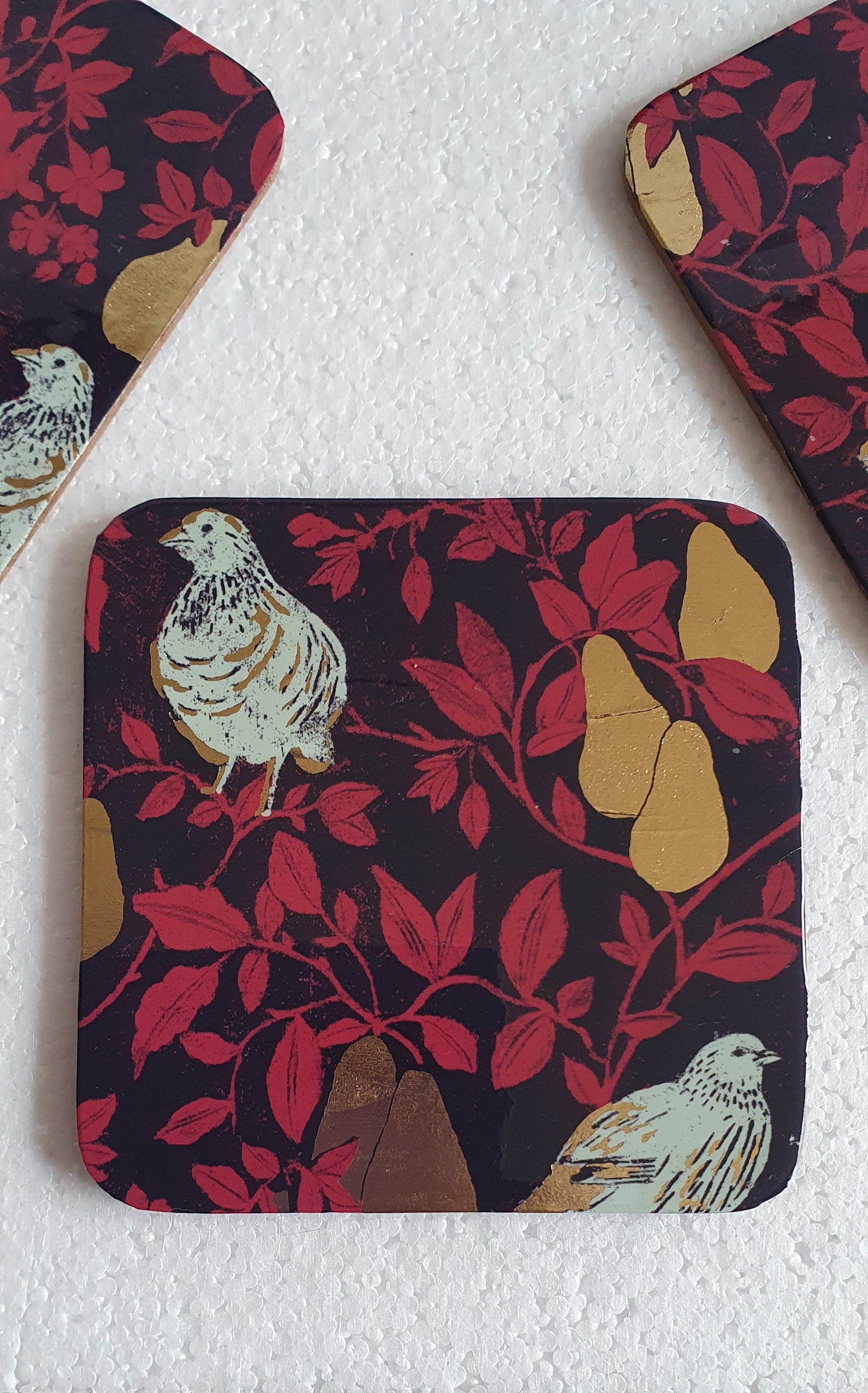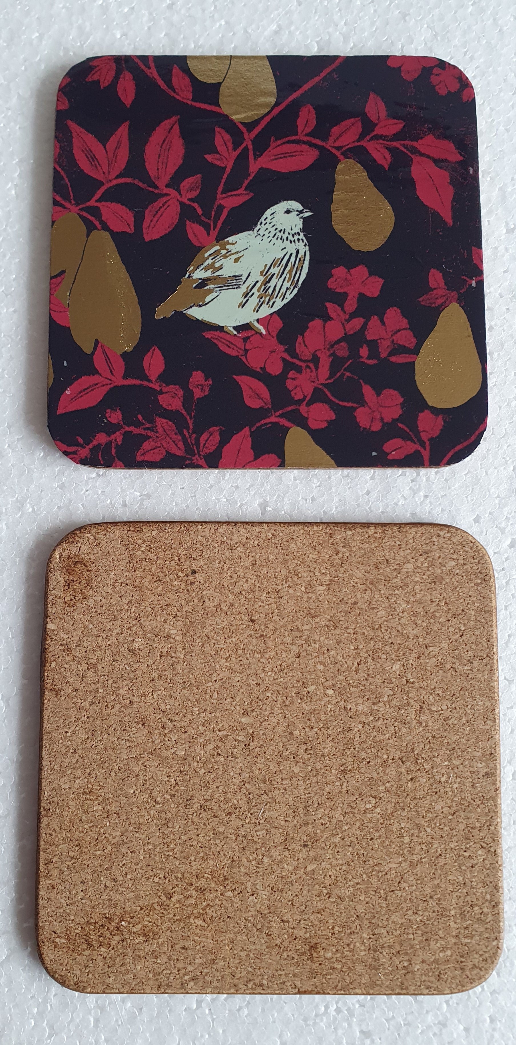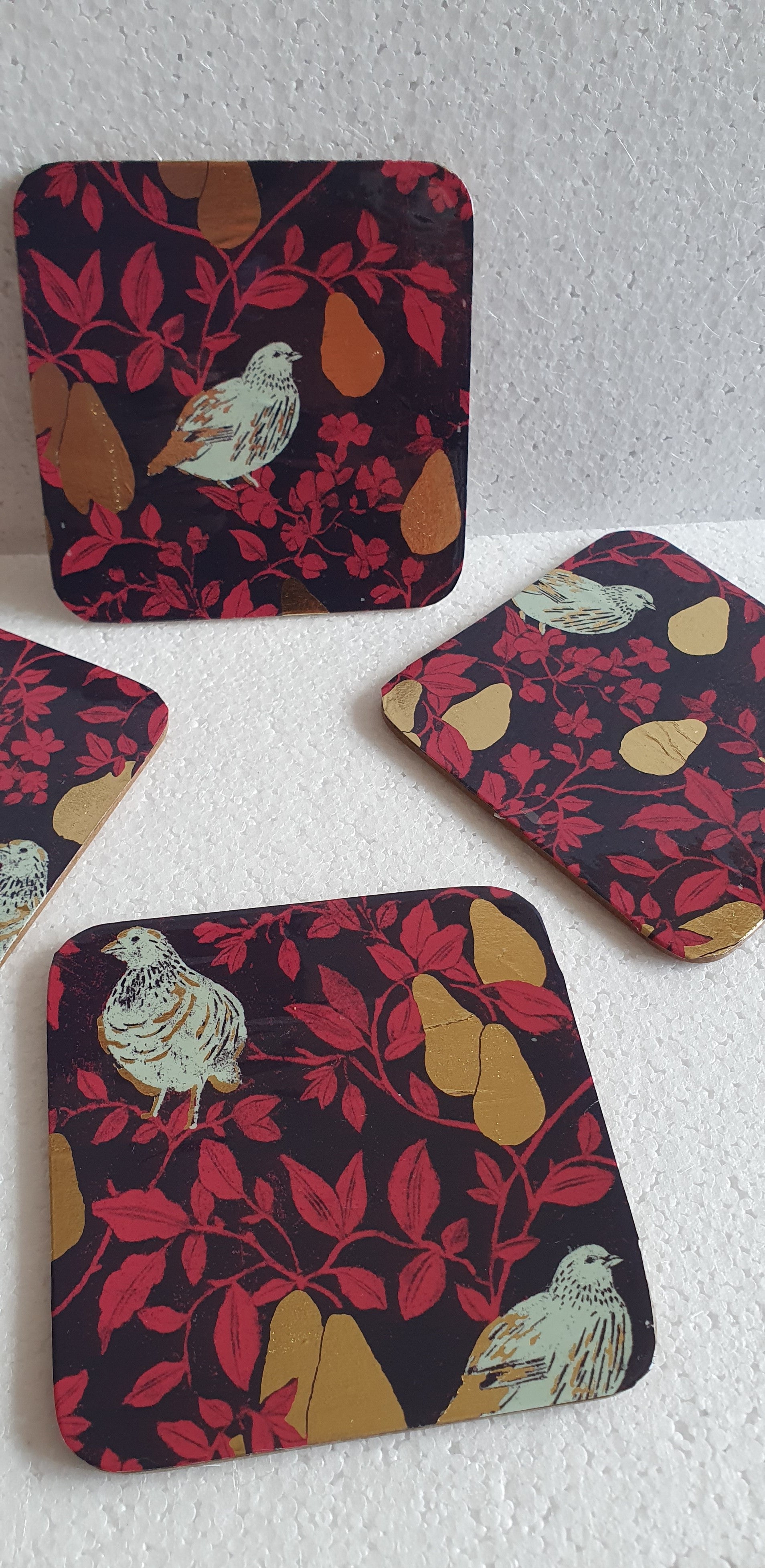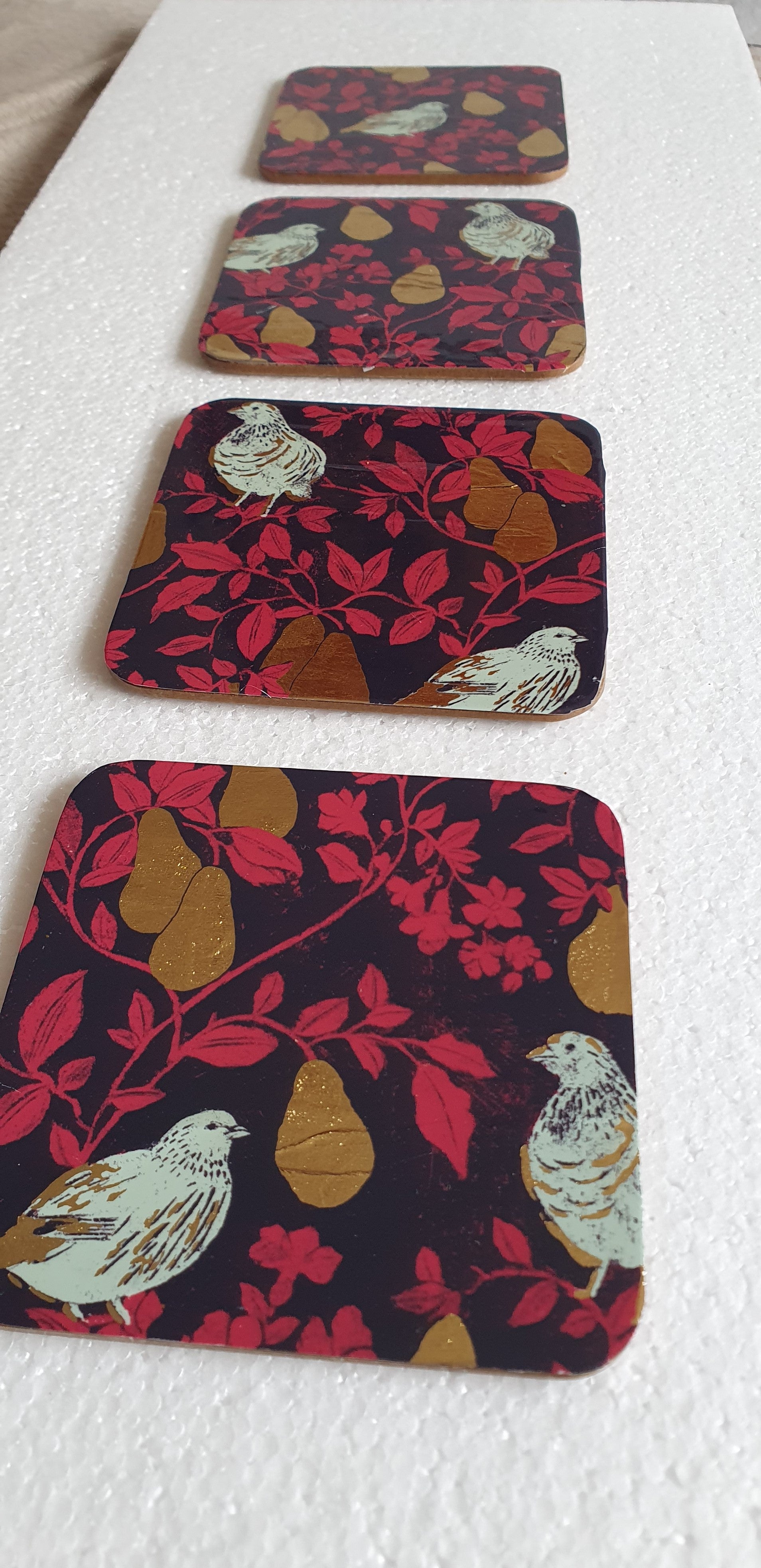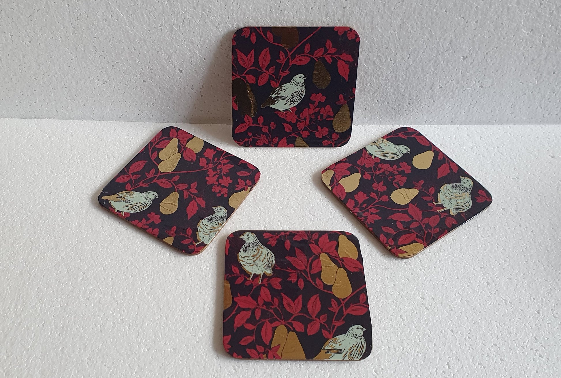 This set of four coasters have been hand decorated by me using decoupage in my studio using paper designs and then varnish sealed. They are also cork backed. It is a unique design and size and cannot be repeated.