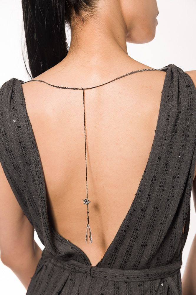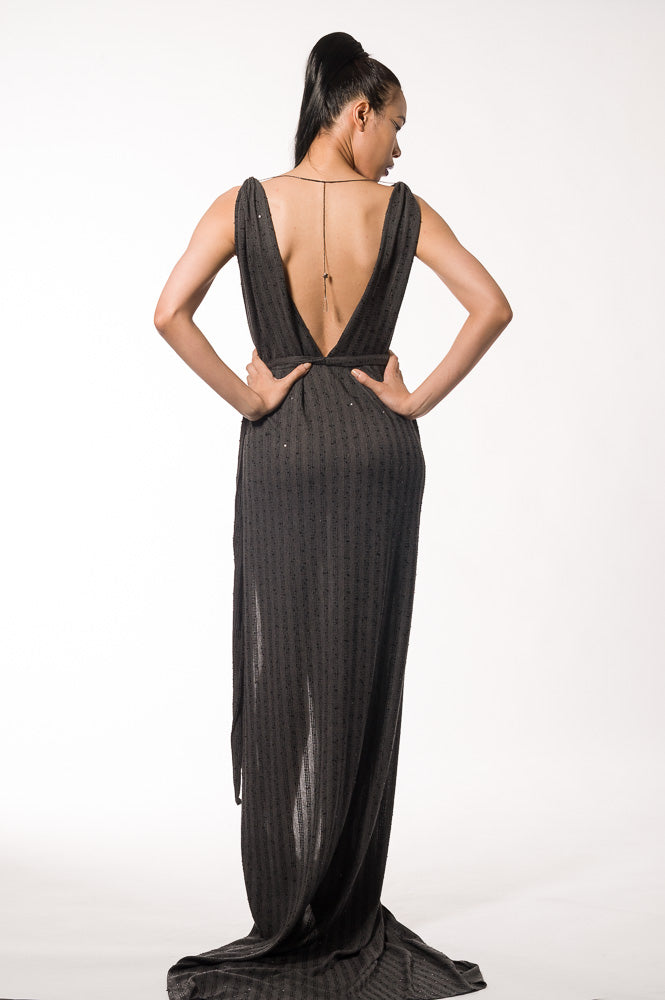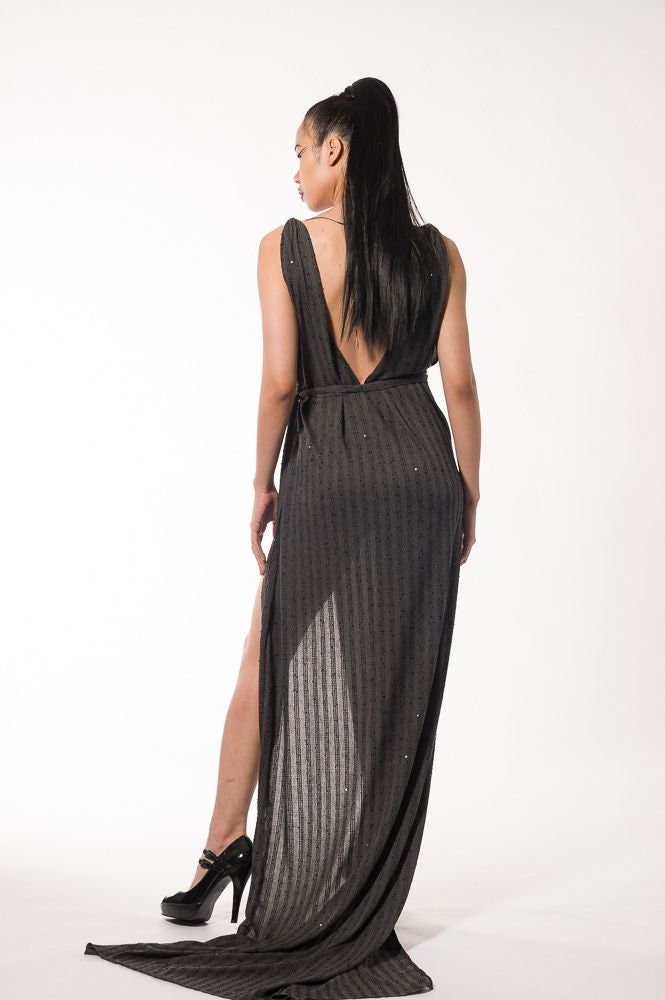 This beautiful and elegant longline grey soft knit jersey dress features a unique wrap detailing with a single belt that wraps the entire dress around the waist and leaves a split up the left side. Plunge front and back, sequin back detailing with cute starfish and pendant jewellery detailing.