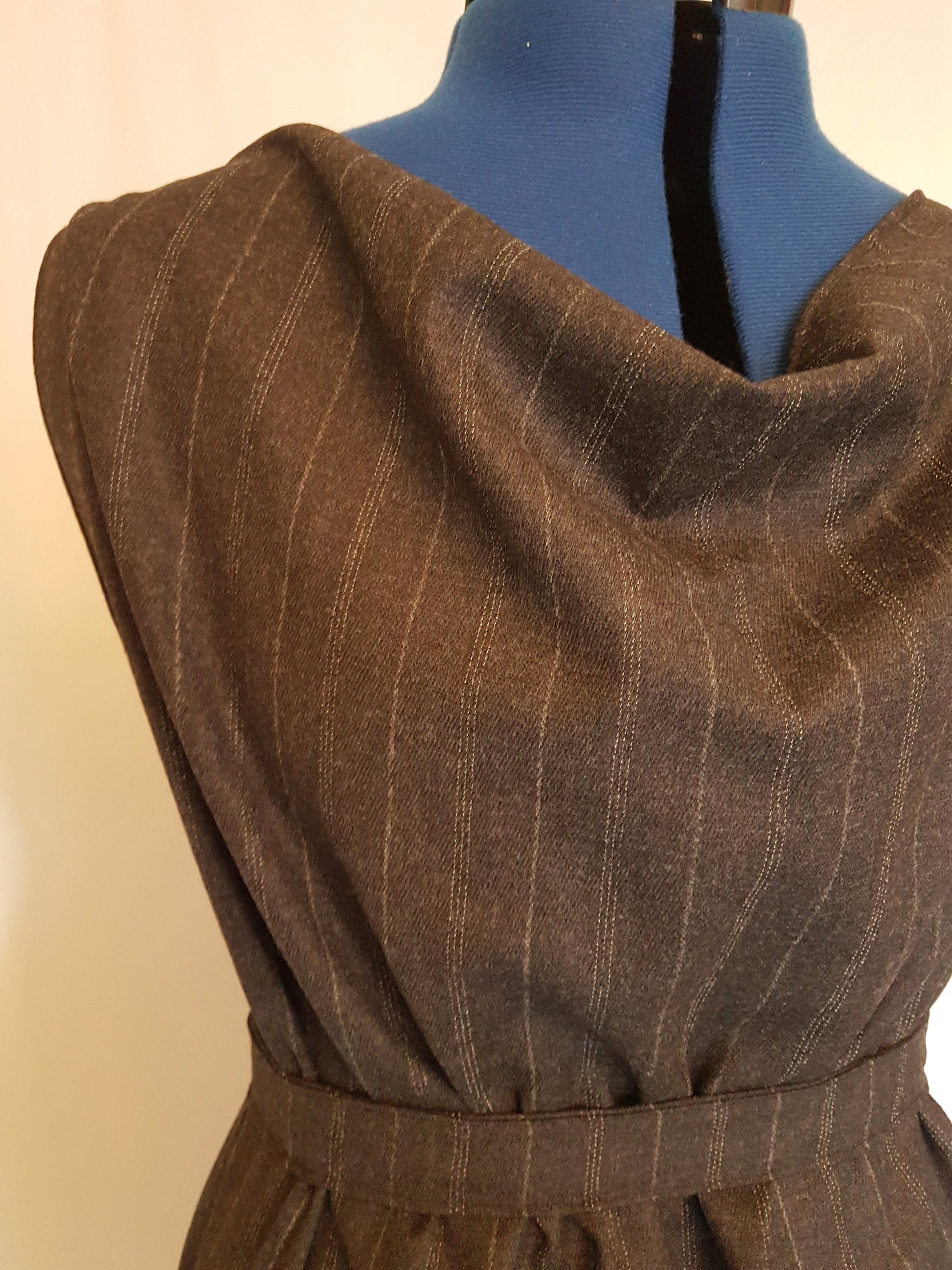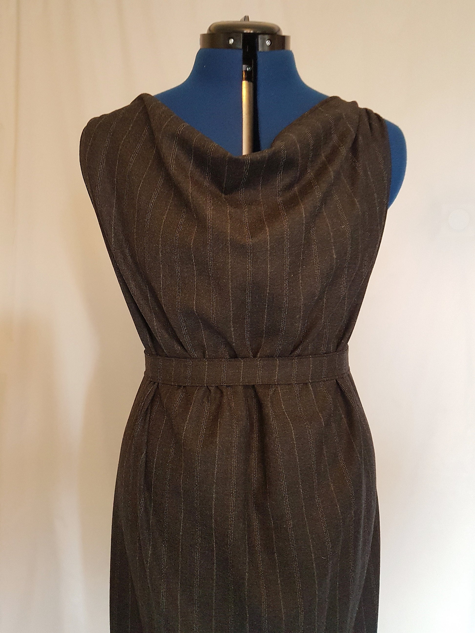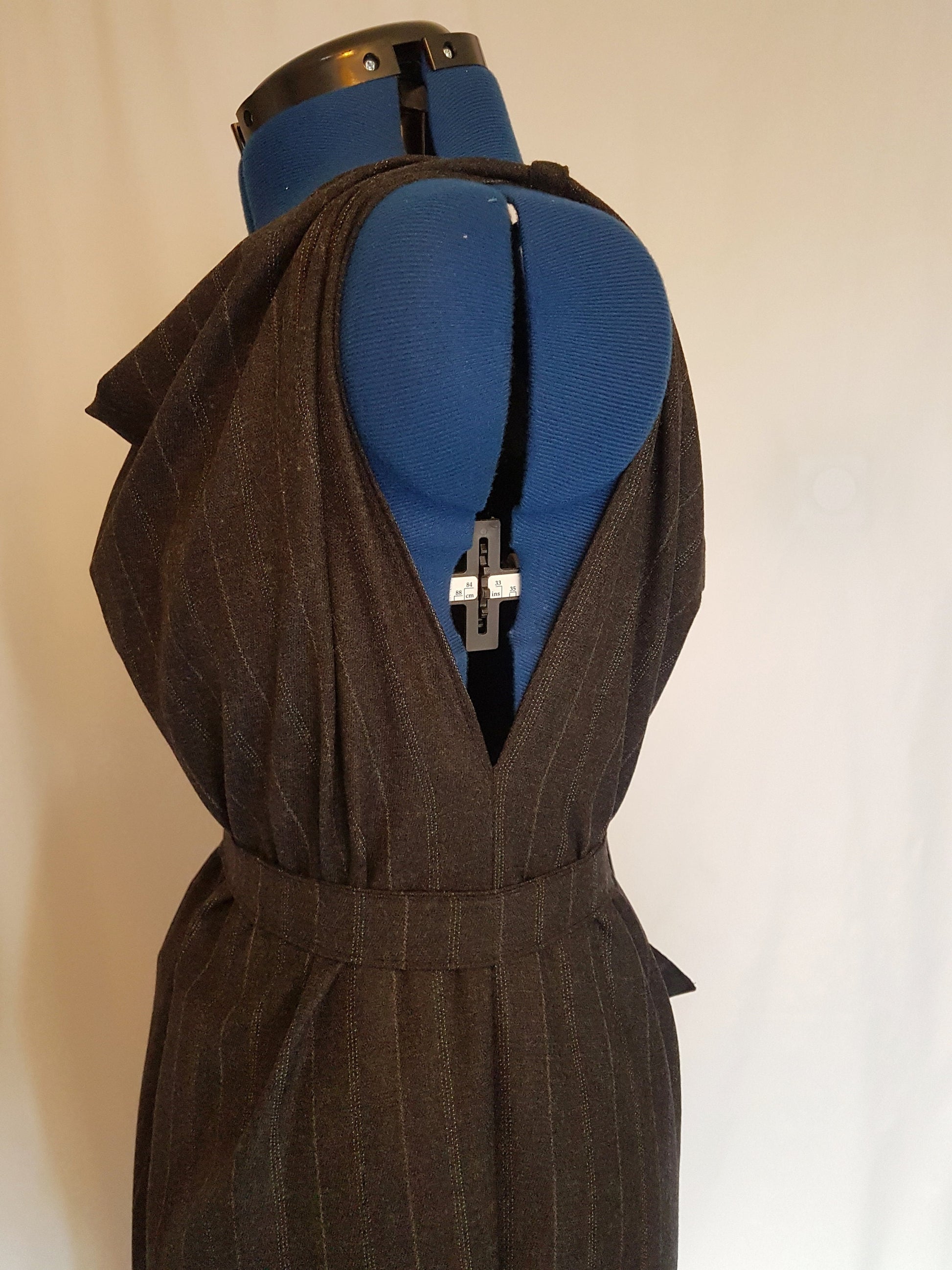 This dress has a scooped cowl front and has a low back and long splits up each side. It also has a very long hem length. It can be customised for shorter heights (including adjustments to the split) and currently has a full length shoulder to hem measurement of approx 64 inches, so if you are really tall or you prefer very high heels this will suit you well.
