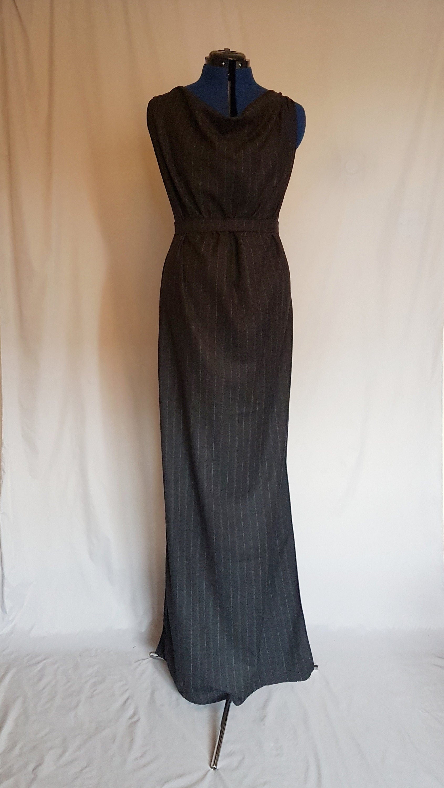 This fabulous long simple pinstripe grey backless dress is perfect for many occasions. It comes with a matching loose belt and is made from a soft mid-weight man-made fabric.