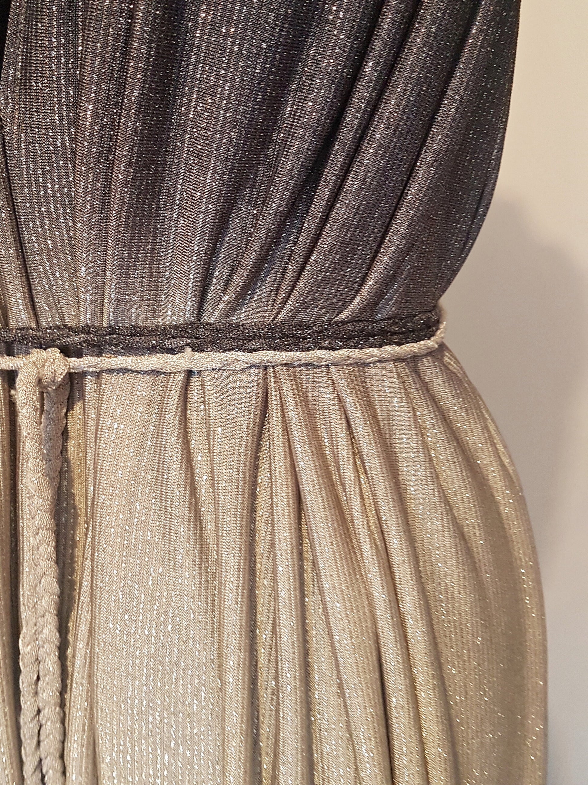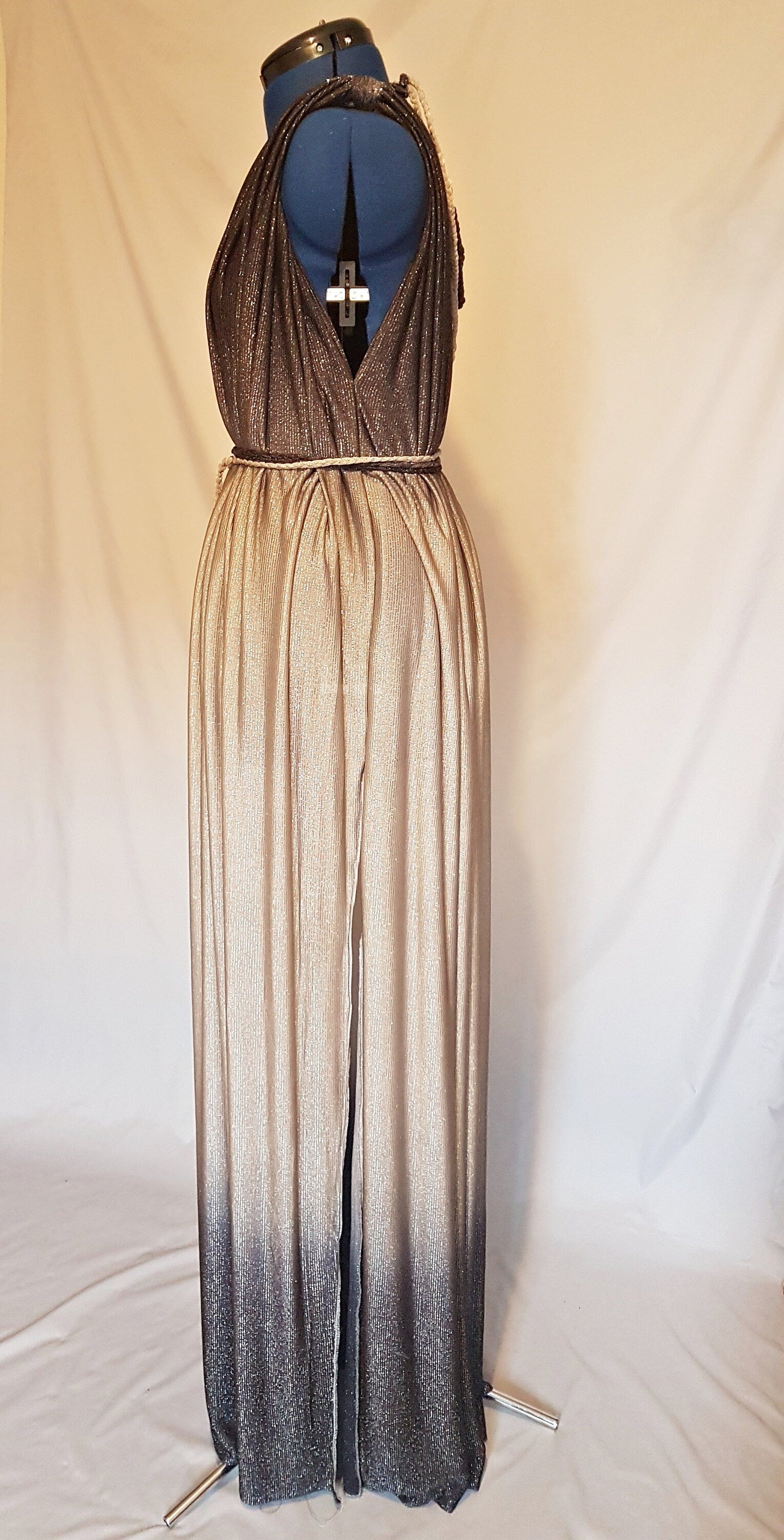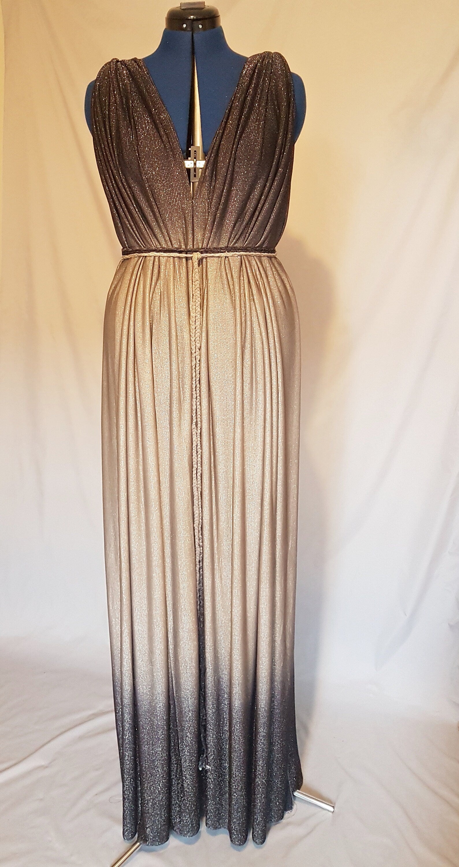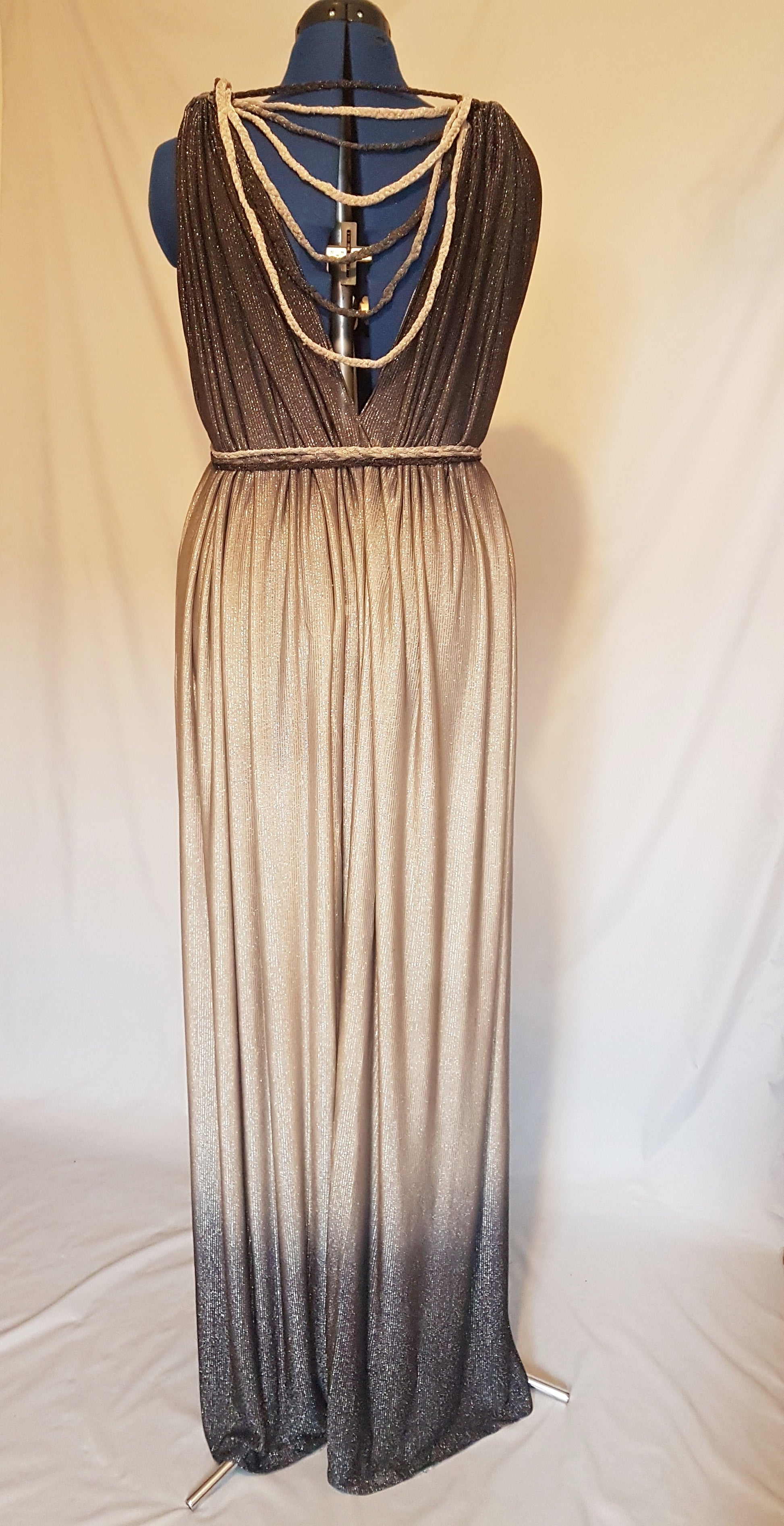This gorgeous handmade Grecian drape four-panel dress is made from a soft stretch slightly see-through jersey/lycra blend fabric in a variegated blend grey colour with a metallic stripe woven into it.