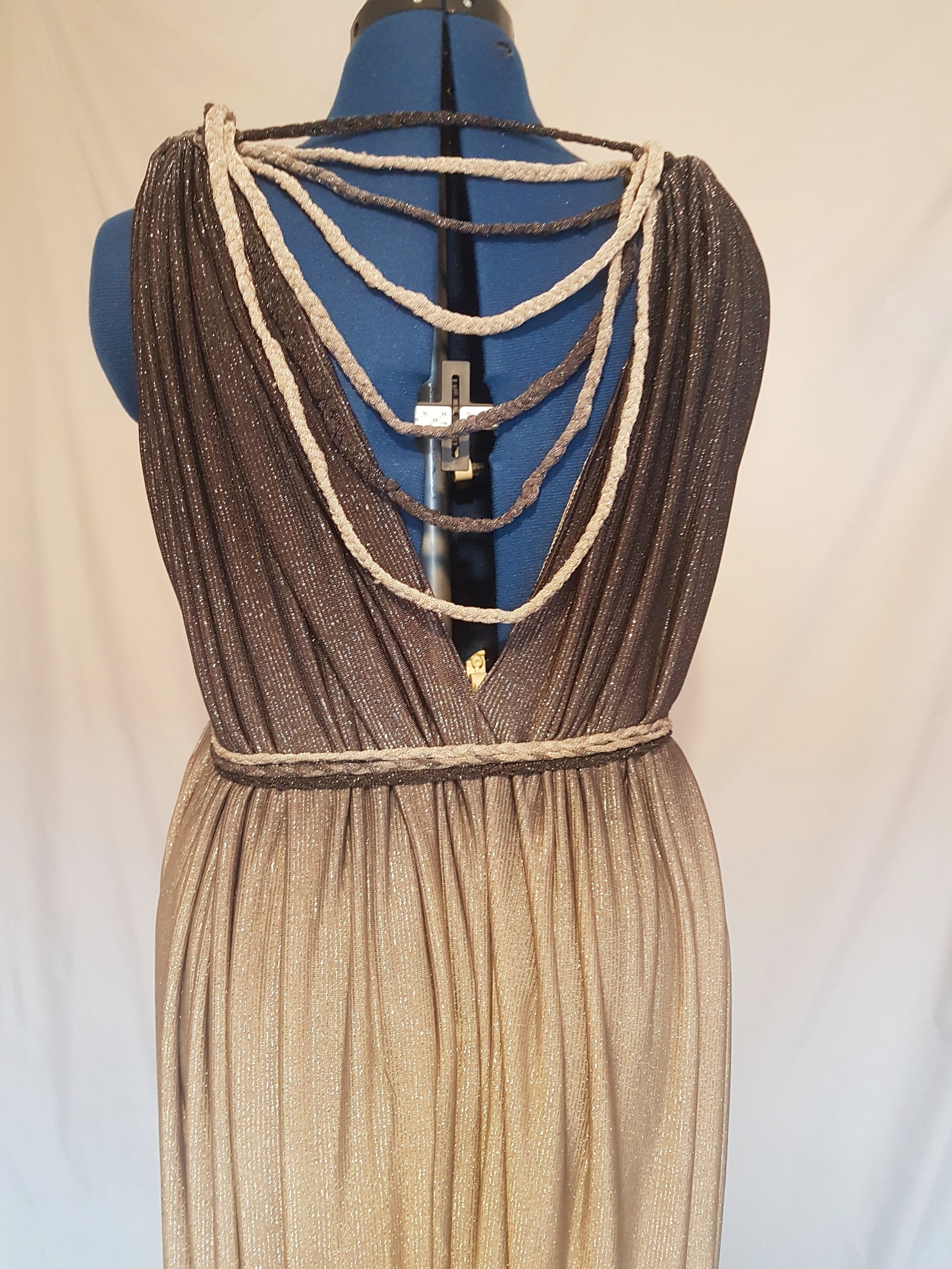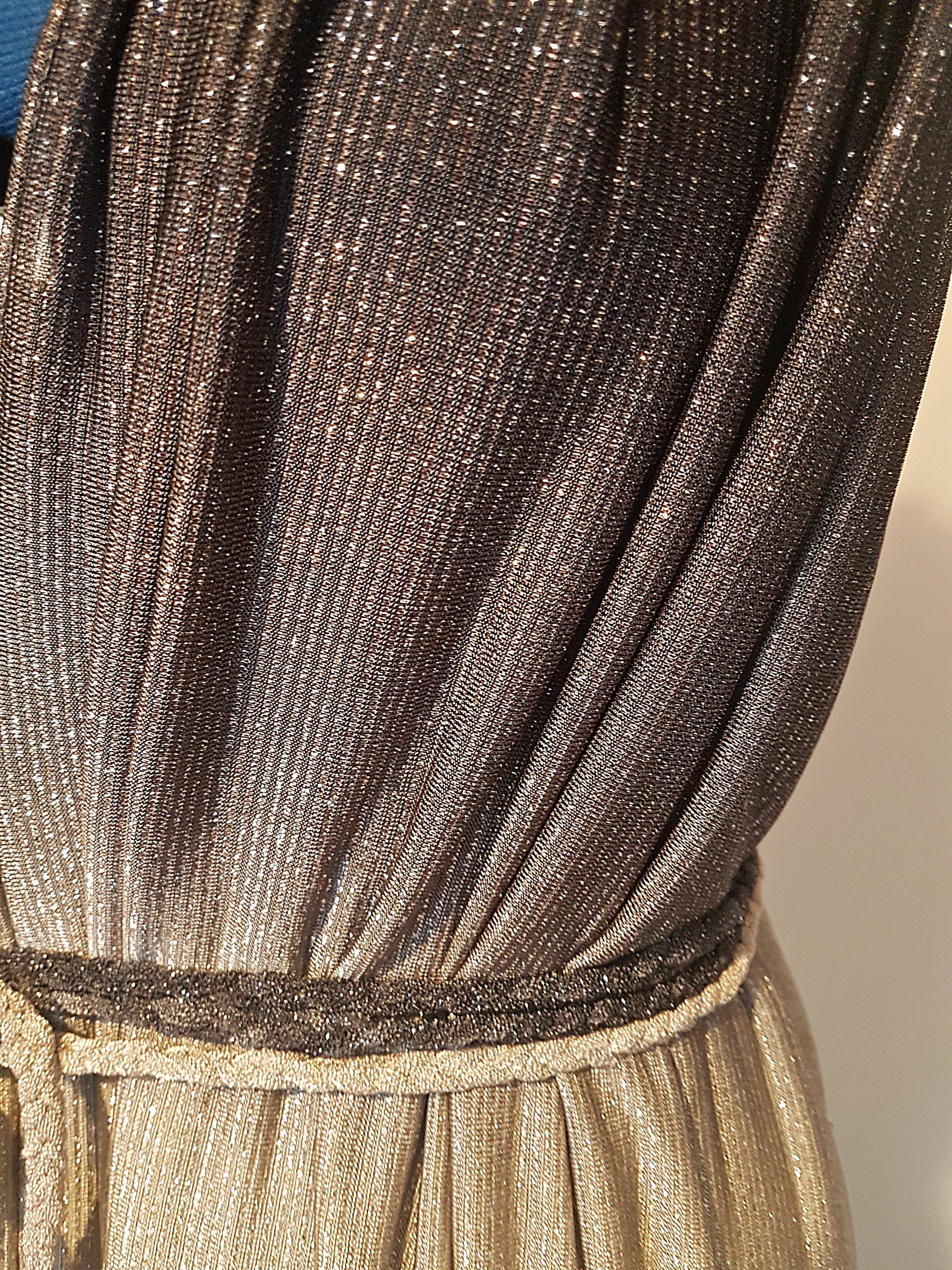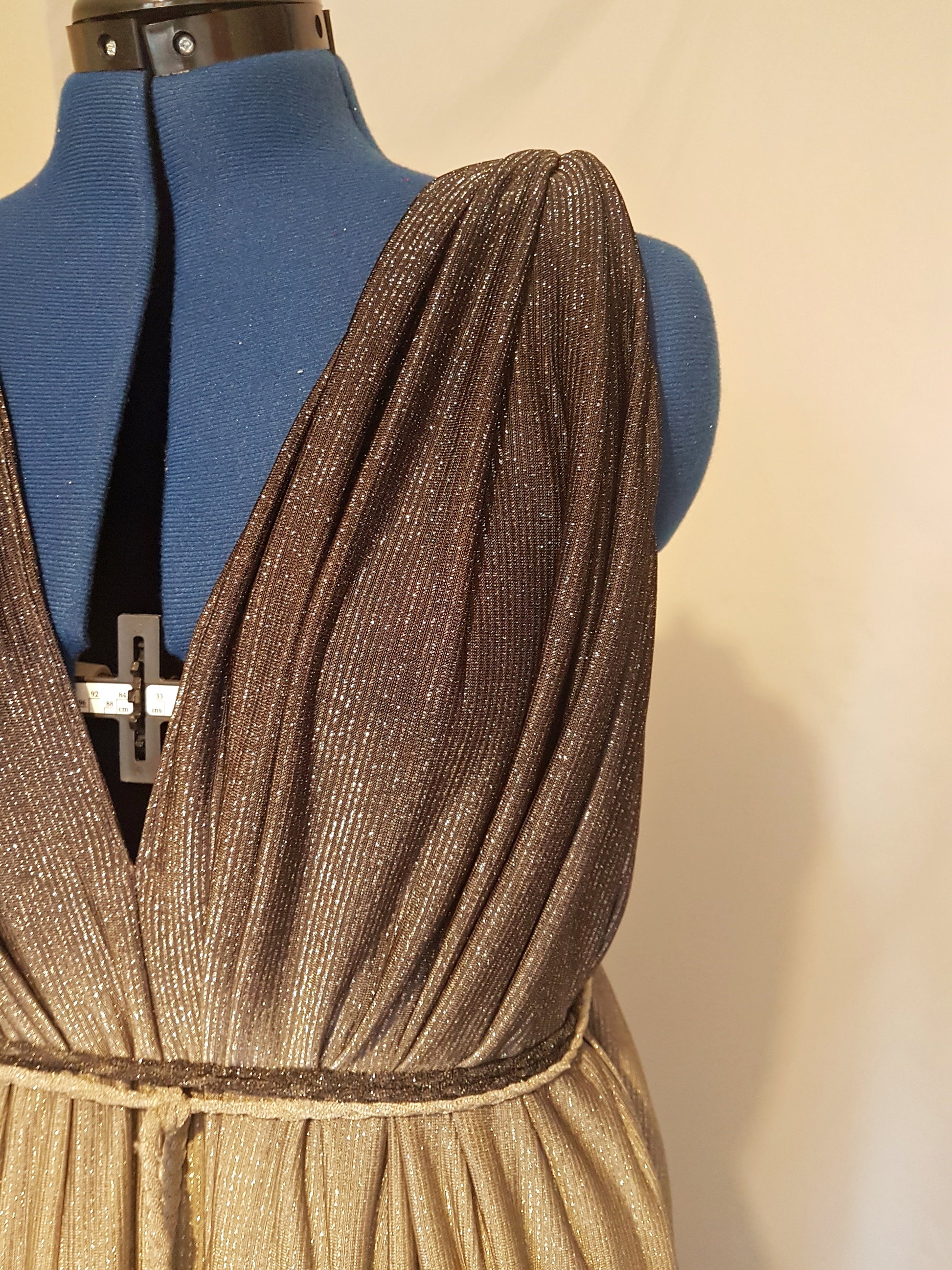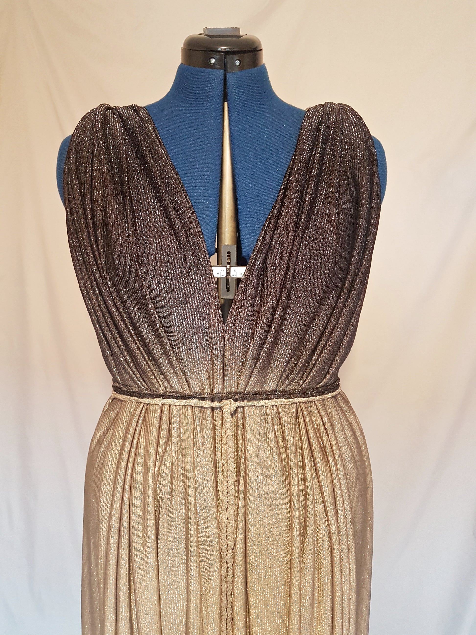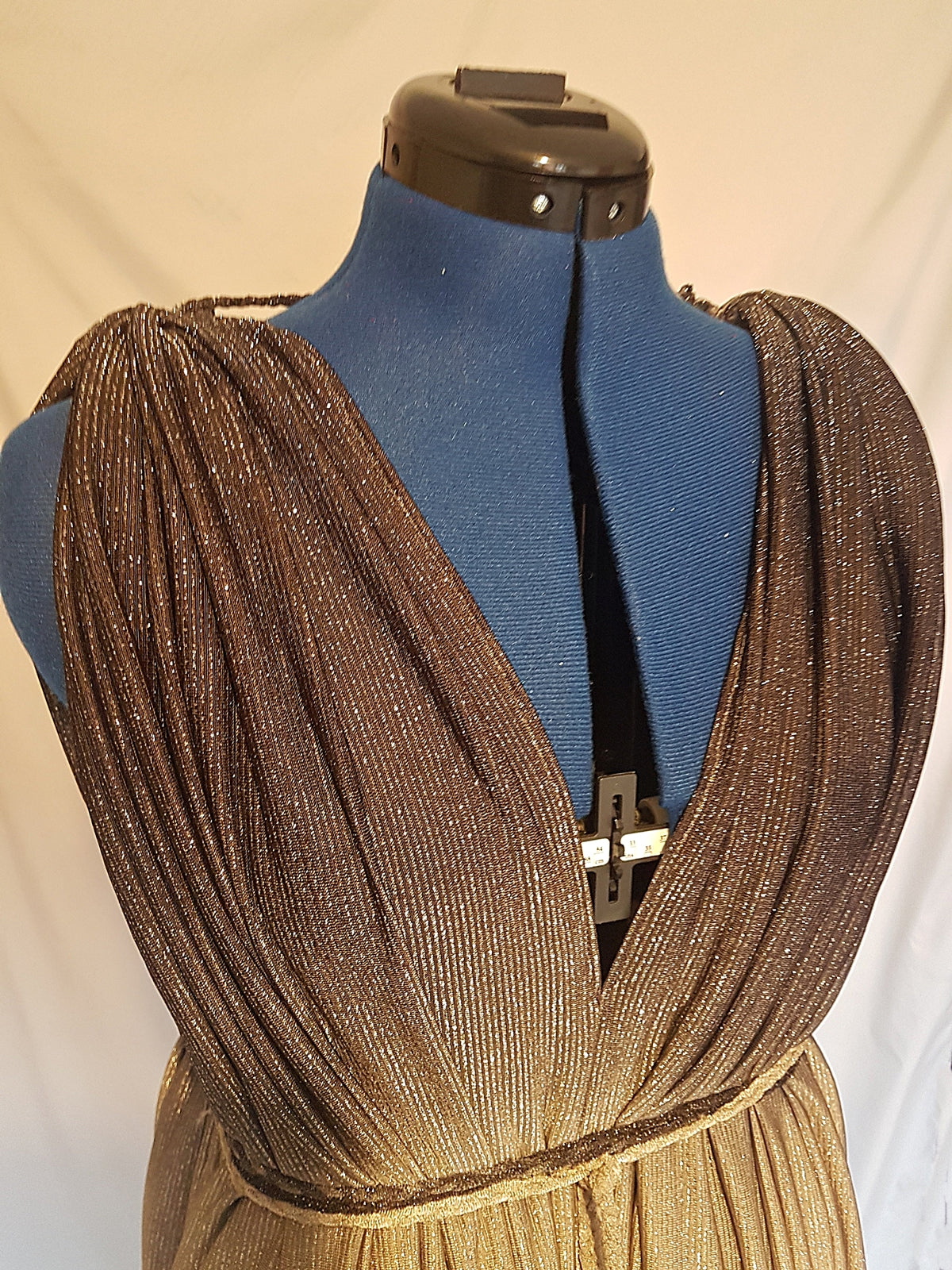 This gorgeous handmade Grecian drape four-panel dress is made from a soft stretch slightly see-through jersey/lycra blend fabric in a variegated blend grey colour with a metallic stripe woven into it.