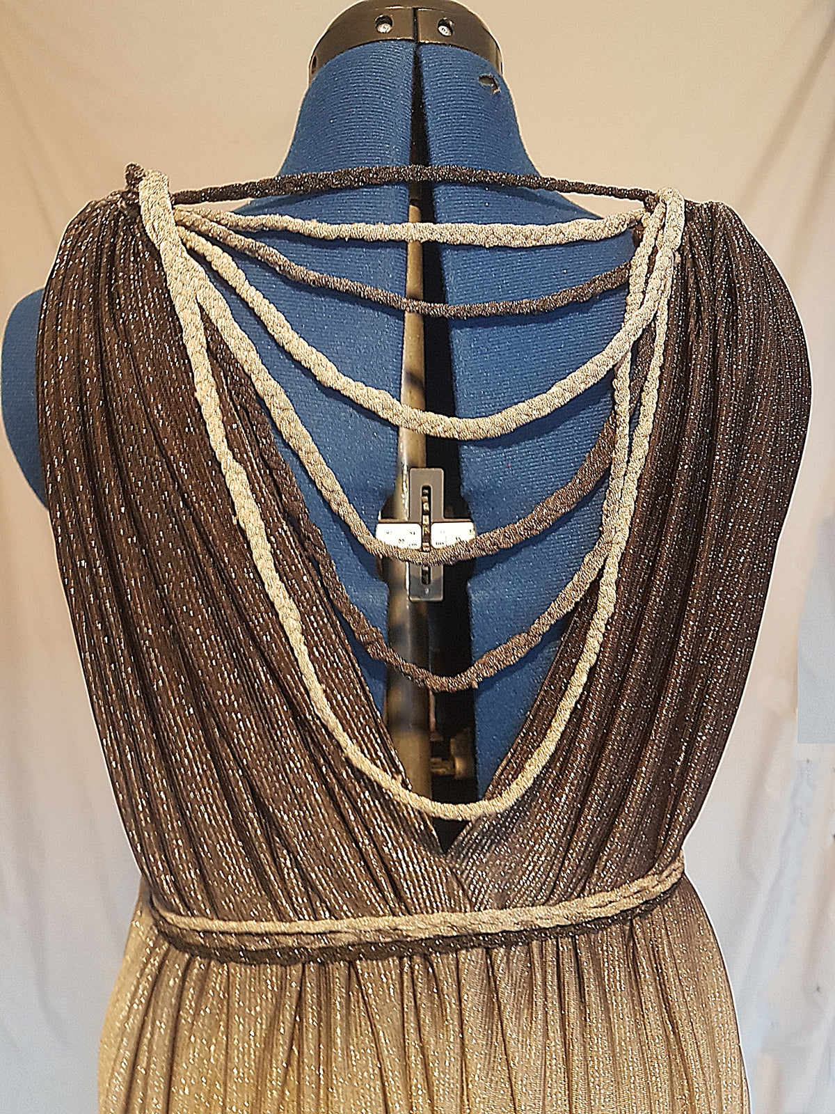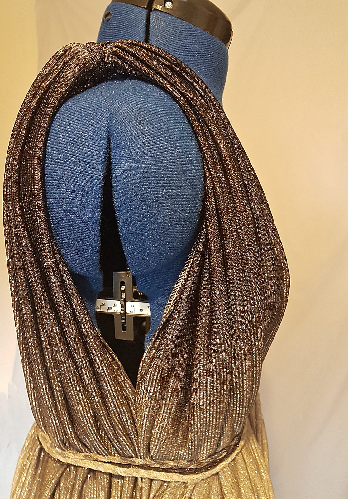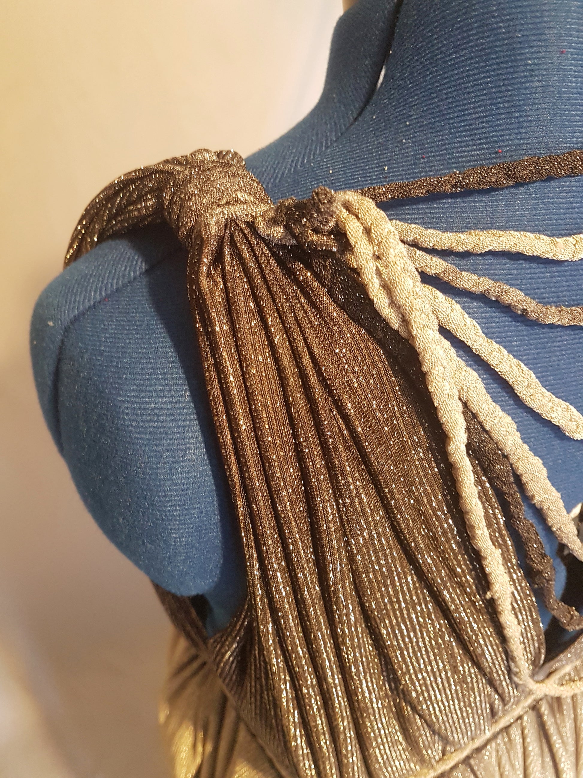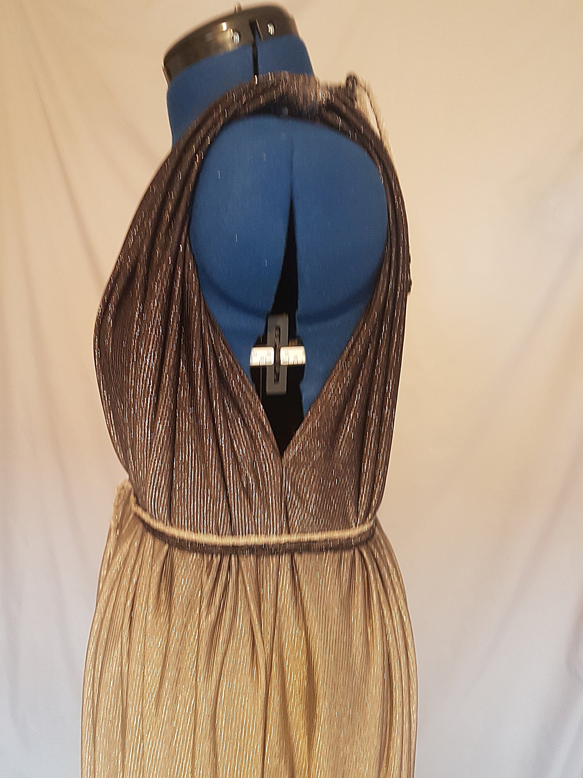 This gorgeous handmade Grecian drape four-panel dress is made from a soft stretch slightly see-through jersey/lycra blend fabric in a variegated blend grey colour with a metallic stripe woven into it.