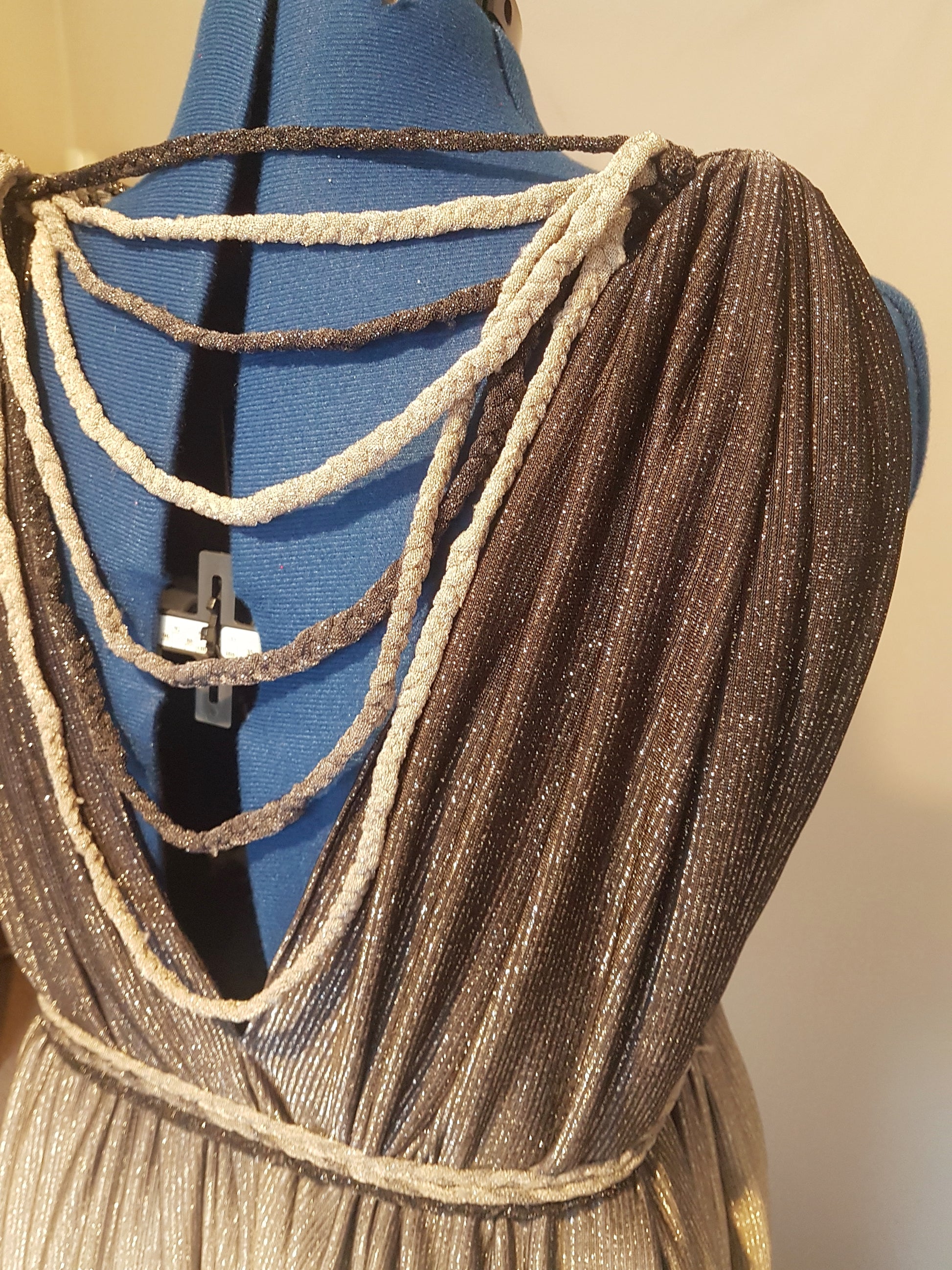 It has a plunge neckline front and back, and a braided detail across the open back. It ties with a very long matching braided belt that ties to your own natural waistline and can be fastened however you like. This dress has side splits on both sides.
