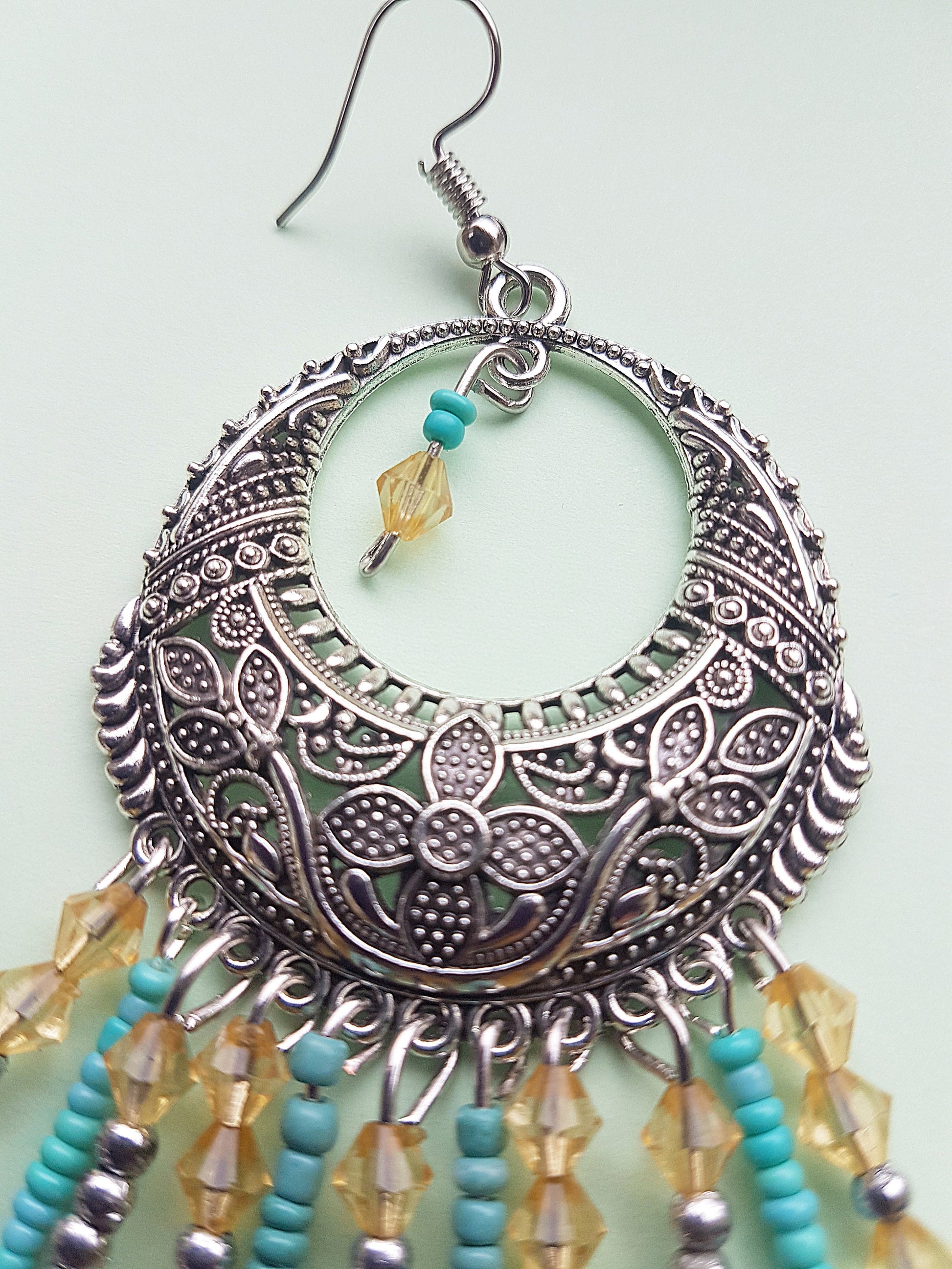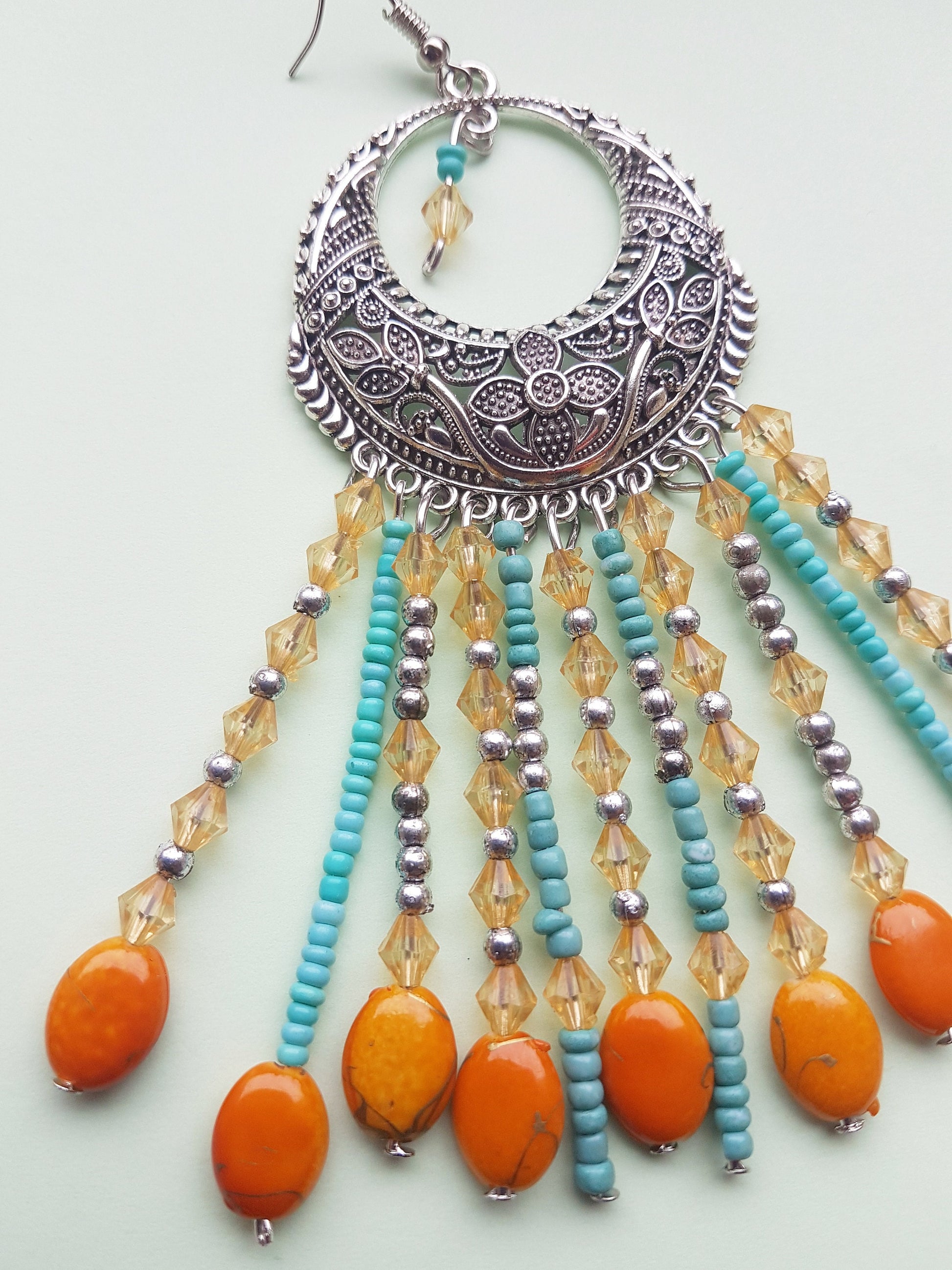 This stunning pair of Gypsy Egyptian style earrings have a length approx 11.5 cm and comprise a silver effect earring with blue, orange, silver and pale yellow beads of various shapes on a silver post.