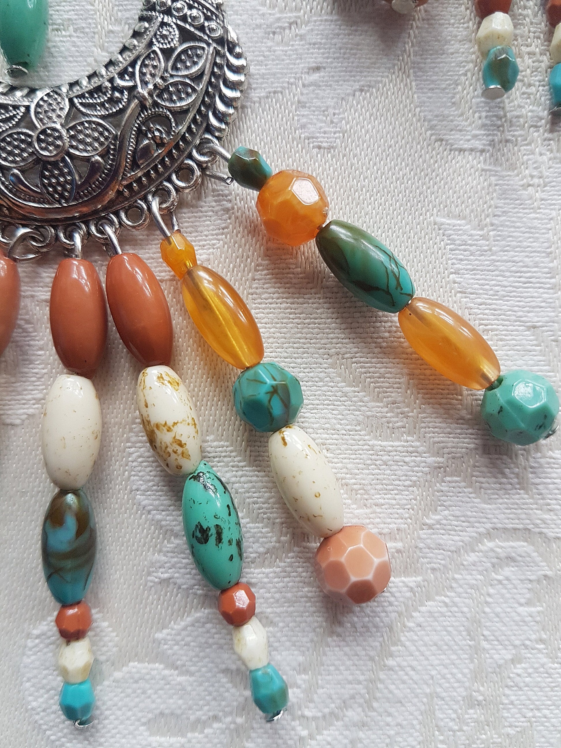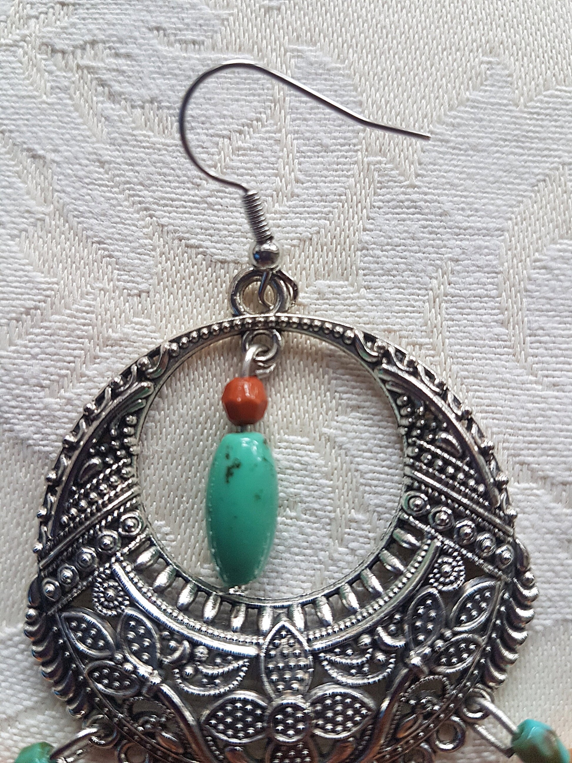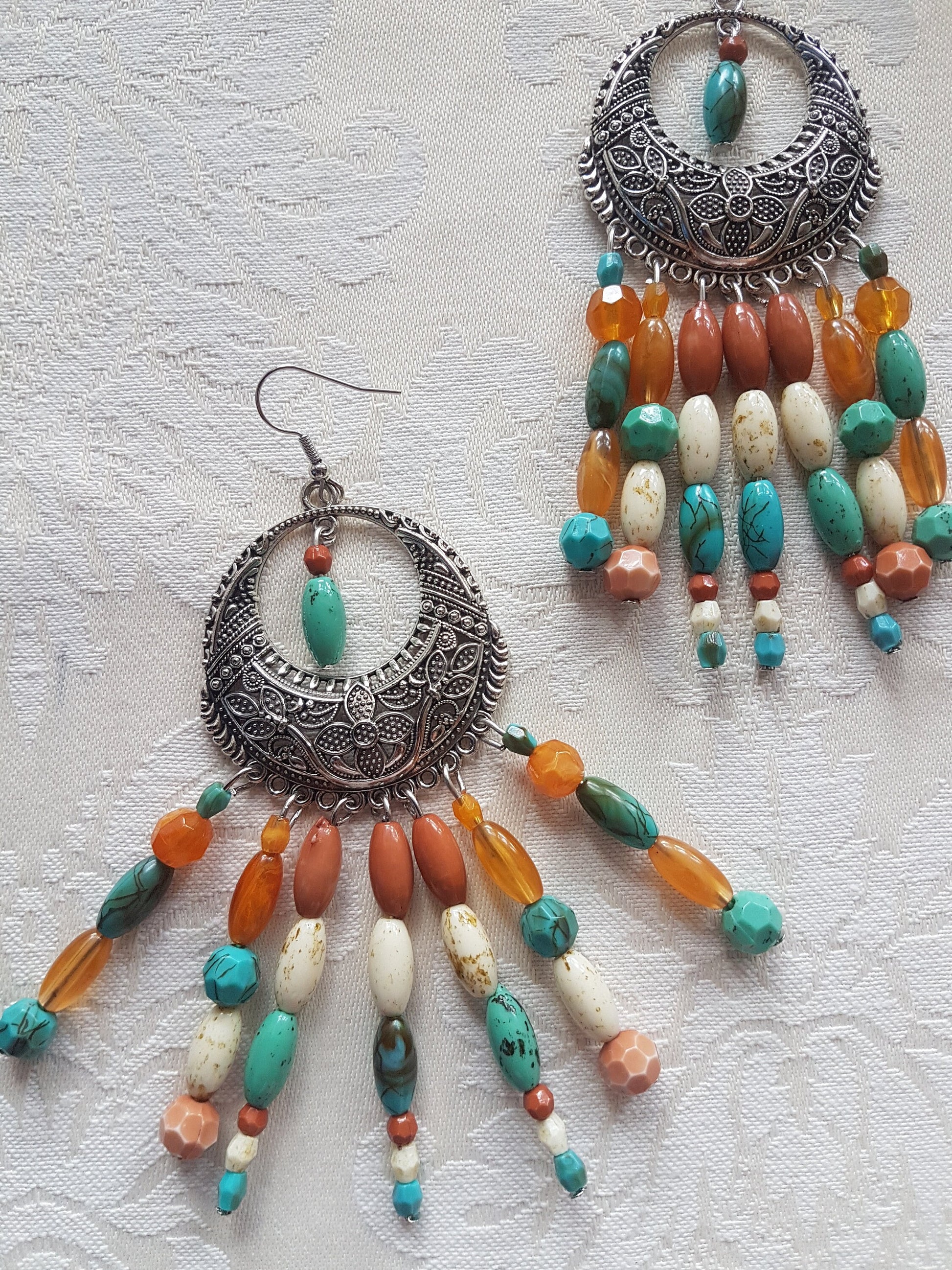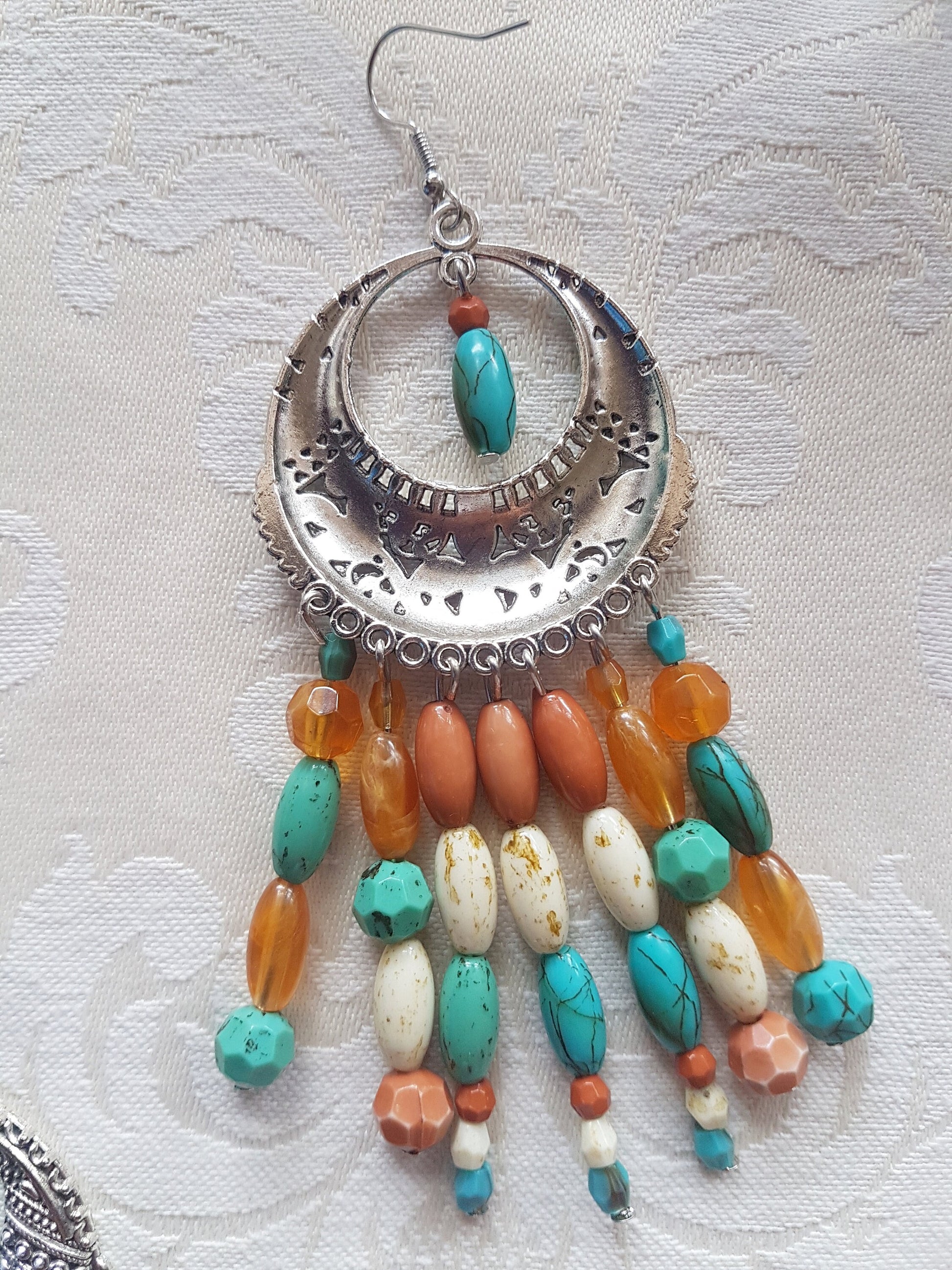 This pair have a length approx 5 inches and comprise a silver effect earring with blue, cream, orange and brown beads of various shapes on a silver post. They have a nice Egyptian design feel to them.